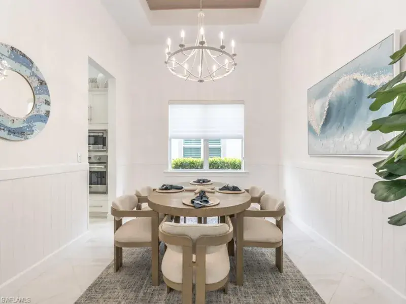 Designed for entertaining, the open floor plan offers both grand and intimate spaces, with ideal separation between them. High ceilings and abundant windows create an airy, sun-filled atmosphere. Custom features, such as ship-lap, wainscoting, hardwood tray ceiling, architectural moldings, an entertainment wall unit, new lighting and freshly painted walls, add to the sophisticated flair. An expansive kitchen boasts modern cabinetry with glass displays, under-cabinet lighting, stone counters, glass tile backsplash, designer pendants, and Viking/Sub-Zero appliances, all anchored by a huge island that seats six. The adjacent formal dining room encourages connection and conversation as it flows effortlessly from both the kitchen and great room.