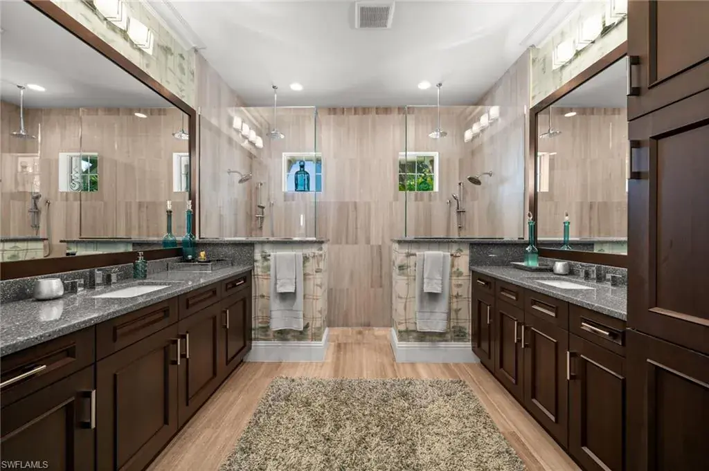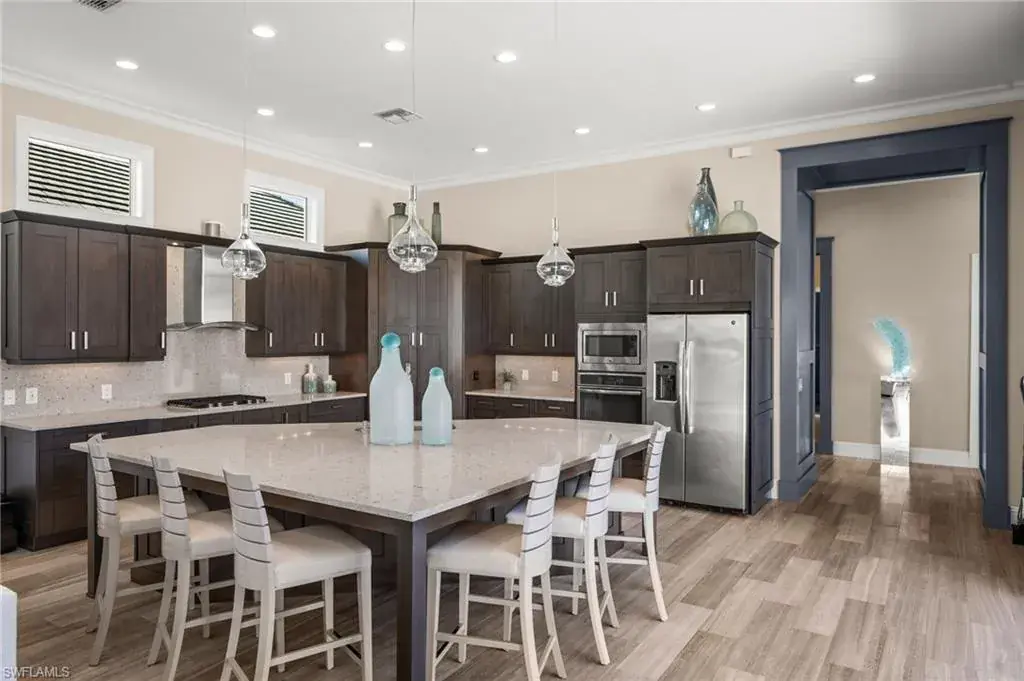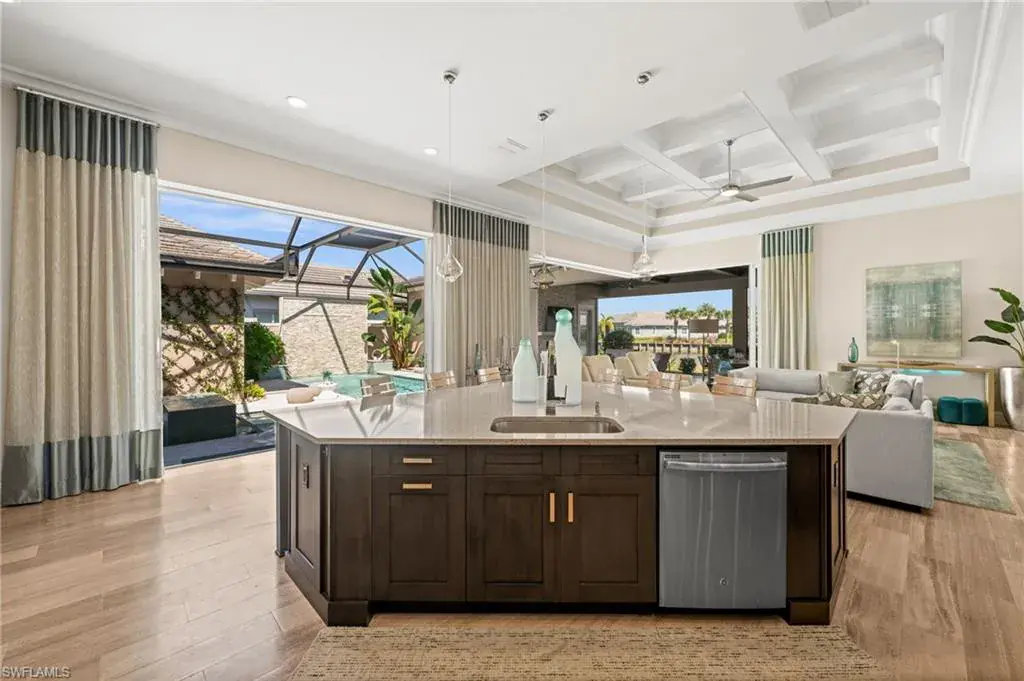 Designed for entertaining, the chef’s kitchen features a gas cooktop, walk-in pantry, and under-cabinet lighting—flowing effortlessly to the great room and outdoor kitchen bar. The lanai offers a tranquil retreat with heated saltwater pool, cascading waterfall, modern tiki lighting, and a stone-front fireplace, all enhanced by a Sonos sound system with indoor/outdoor speakers.