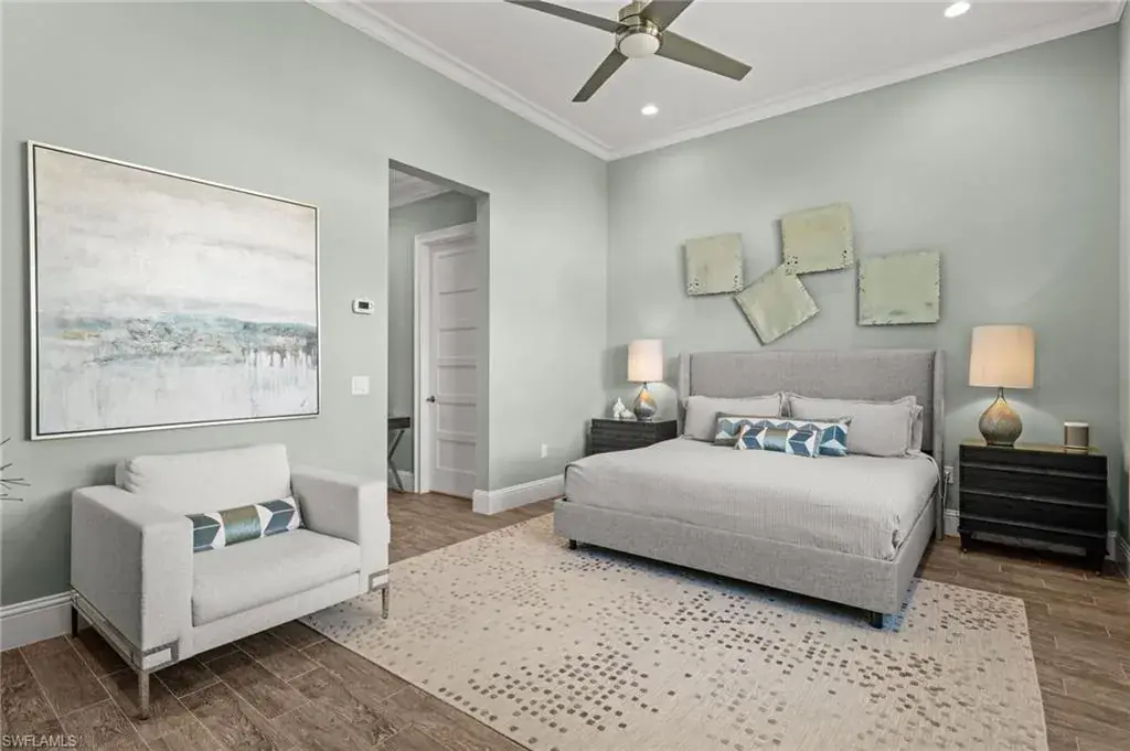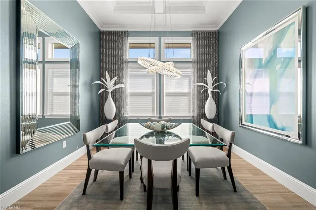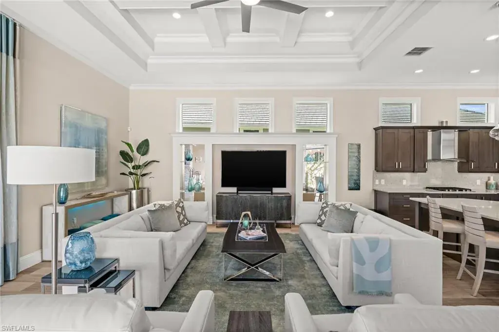 Step through double doors into soaring 20-foot ceilings and an open, airy layout filled with natural light. The home’s elevated finishes include custom flooring, crown molding, solid-core paneled doors, and electronic hurricane-impact sliders that open to panoramic lake views framed by picture-window lanai screens.