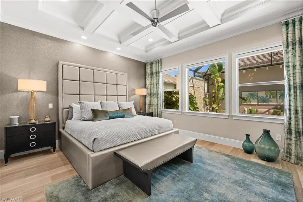 The primary suite is a private sanctuary with French doors, coffered ceilings, dual walk-in closets (with built-ins, seating, ironing board, and safe), and a spa-inspired bath featuring dual sinks, a large walk-through shower with dual heads, and decorative walls. A guest ensuite includes custom blackout shades, while the detached casita offers an additional full suite with bath and walk-in closet—ideal for visitors or extended stays.