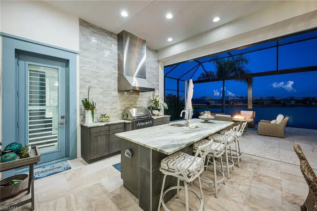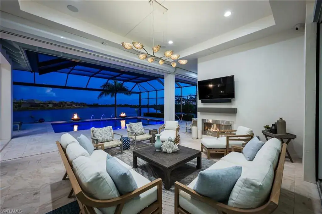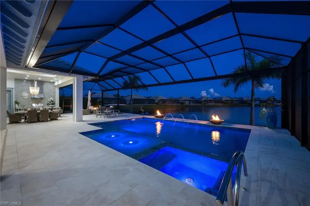 From the moment you step inside, you’ll notice the attention to detail: Italian-imported porcelain tile, custom interior shutters, dramatic ceiling finishes, and designer wall coverings elevate every room. The gourmet kitchen features high-end appliances, Cambria quartz counters, and a custom island. Entertain with ease in your custom-designed bar area, or relax in your travertine lanai overlooking an oversized saltwater pool with LED lighting, fire bowls, fountains, and a sun shelf—all remotely controlled.