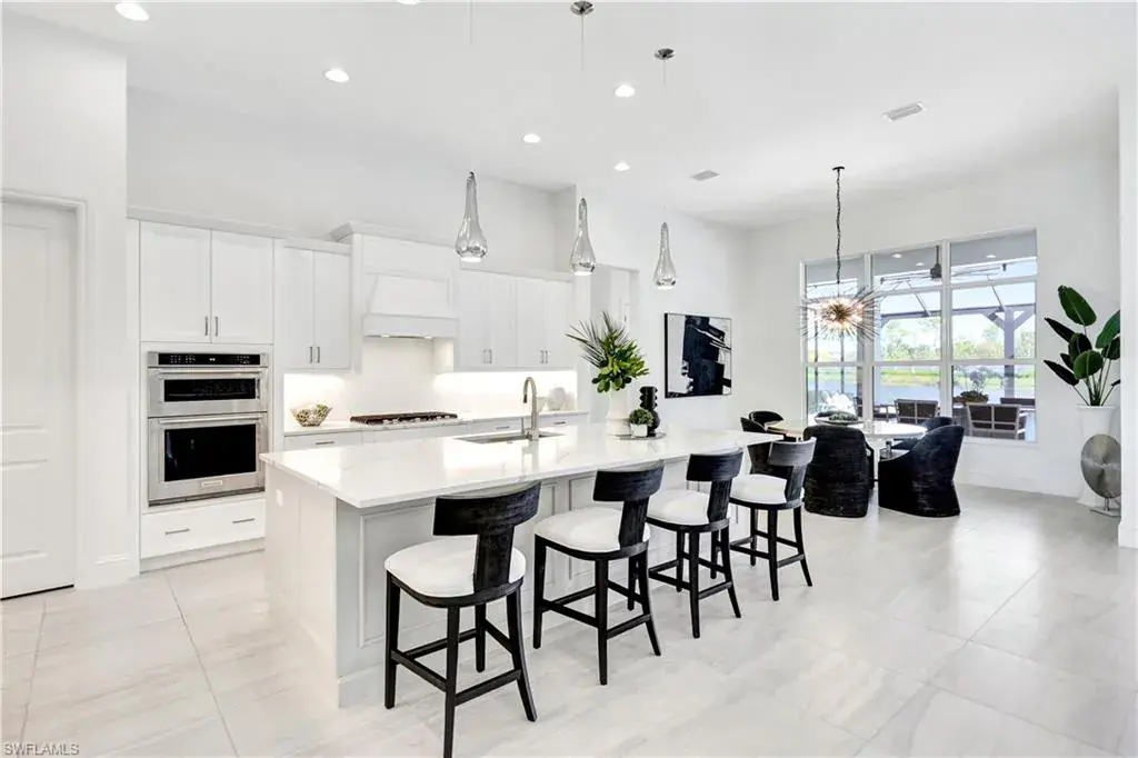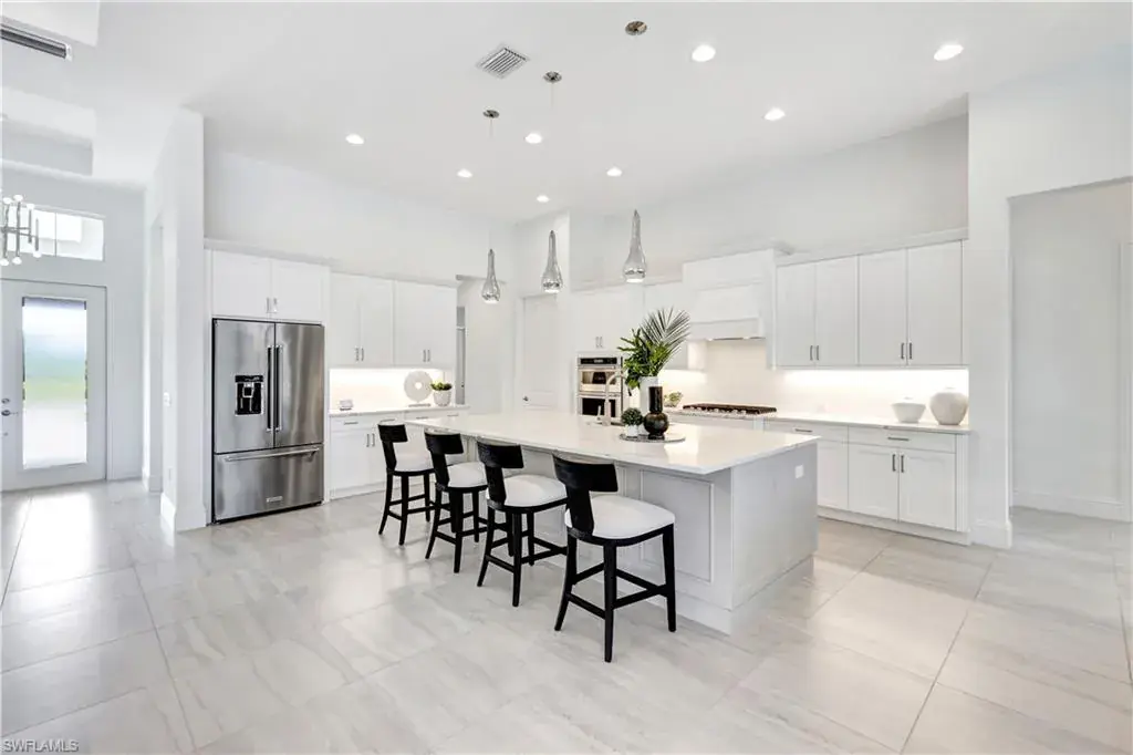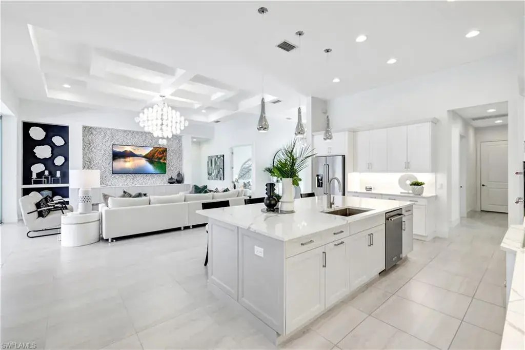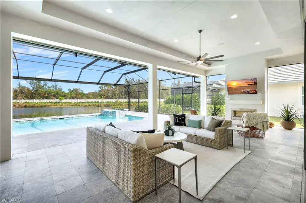 Indulge in modern luxury at this exquisite Covington III Model by Stock Luxury Homes. This designer decorated home in the prestigious Isles of Collier Preserve has breathtaking lakefront views and situated on an expansive lot. There is over $400k in after market upgrades and furniture in this meticulously designed residence that seamlessly blends upscale sophistication with Florida’s natural beauty. The open-concept floor plan invites you to entertain in style. The great room features soaring coffered ceilings, custom built ins with quartz, grass cloth wall coverings, built in shelves and panoramic glass doors that bathe the interior in natural light. A chef’s dream, the gourmet kitchen boasts a gas cooktop, high-end stainless-steel appliances, custom cabinetry, marble backsplash and an expansive island perfect for gathering. The serene master suite offers a private retreat with French doors leading to the Lania and a spa-inspired bathroom featuring dual vanities, a soaking tub, a walk-in shower, and a spacious walk-in closet. Two additional bedrooms, each with private baths, provide guests with luxurious accommodations. Step outside to your personal paradise. The expansive lanai features a sparkling pool and spa with colored lights, a fully equipped outdoor kitchen, a panoramic screen, a built in high top table with Dekton countertop, and beautiful stucco and stainless steel modern fireplace creating the ultimate setting for alfresco dining and relaxation. Enjoy serene mornings and picturesque sunsets overlooking the tranquil lake and preserve view. The additional upgrades include; insulated garage with air conditioning and EV Plug In, Built in speakers in the great room and lania, trimmed out mirrors in all bathrooms, buried propane gas tank, toto commodes, and french glass doors in the den, John Richards chic great room Chandelier, Visual comfort Ceiling Fans, high end lighting fixtures throughout, high end furniture, custom art in the family room by a local Naples artist. This home is set within the sought-after Isles of Collier Preserve, a gated community offering unparalleled amenities, including a resort-style pool, lap pool, pickleball, tennis courts, a fitness center, and a private on-site restaurant. Explore the lush tropical surroundings with nature trails, bike paths, and a kayak launch. This home is conveniently located close to the western gate off Bayshore Drive and is only 4.1 miles from Old Naples’ 5th Ave South where you will find world-class dining, shopping, theater and the white sand beaches of Naples. Hamilton Yacht club is accessible through the back gates of Isles of Collier. High and Dry in an X zone, no flood insurance needed!