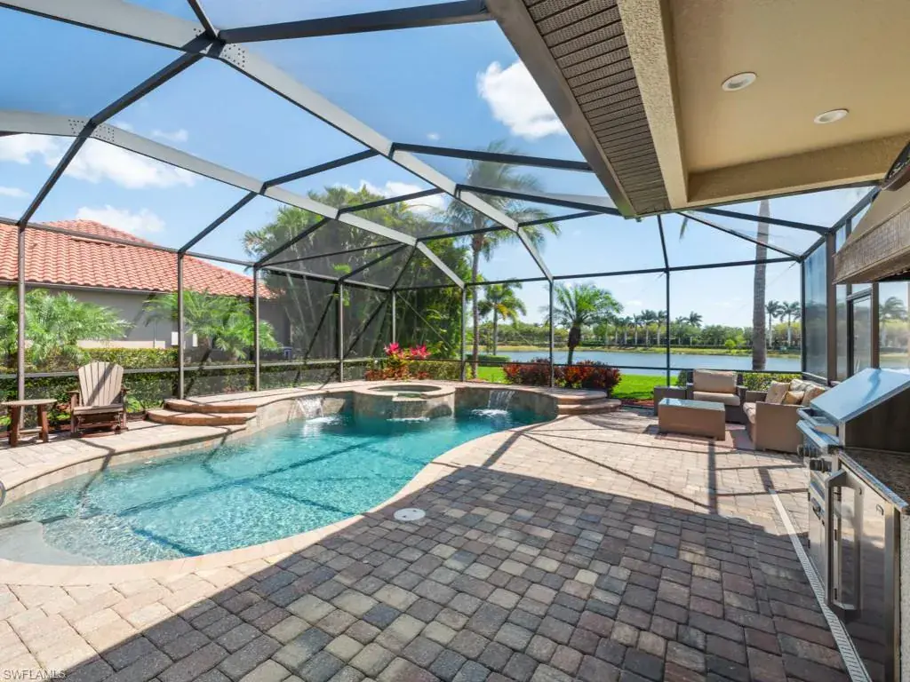 Escape the ordinary with this extraordinary dream home ~Prime LOCATION, WATER VIEWS with FULL TPC Treviso Bay golf membership! Amazing Toscana floor plan with wide water views on Italia Way in Treviso Bay in Naples, FL! The location of this home is close to the front gate and easy walking distance to the 5 star resort amenities Treviso Bay has to offer! This home is offered turnkey with 4 bedrooms/ 3 full baths /3 car garage. This Toscana floor plan features 2603 square feet of tranquil living space including great room, living room, dining room, spacious white kitchen with upgraded stainless steel appliances, white quartz countertops and island, screened no see-um lanai with salt water converted pool/spa and outdoor kitchenette featuring built-in gas grill, fire pit and mini fridge. Rear eastern exposure for sun over the pool area and gorgeous sunset views with added exterior lighting.  Three-car garage offers plenty of space for parking and storage. Enter into the home with a light and bright foyer that leads into the dining with a view of the pool and lake beyond! The kitchen pantry wall has been removed and a second island has been replaced which doubles as a serving area for the dining room. This lovely remodel opens the floor plan brings more natural light into the upgraded kitchen. The Toscana offers a much appreciated privacy as this home is a split floor plan with the master suite on one side and all 3 guest rooms on the other. There are many upgrades to this gorgeous home you must take a look!