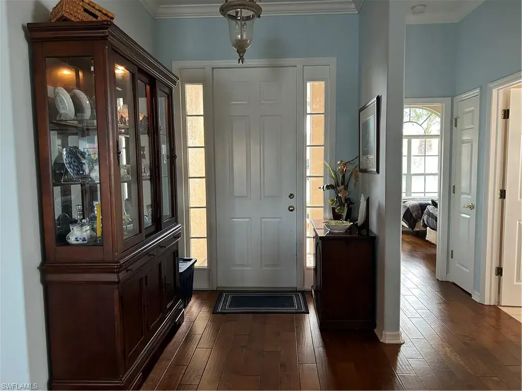 Three bedrooms, 2 full bathrooms, Dining, Living room and updated Kitchen! Beautiful view of lake and water display. Lovely Pool, lots of room to relax and enjoy the sunsets. Newer flooring through-out. A/C 2014 and Hot Water Heater 2018. Hurricane blinds on lanai.