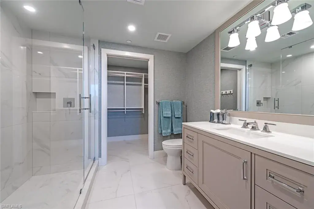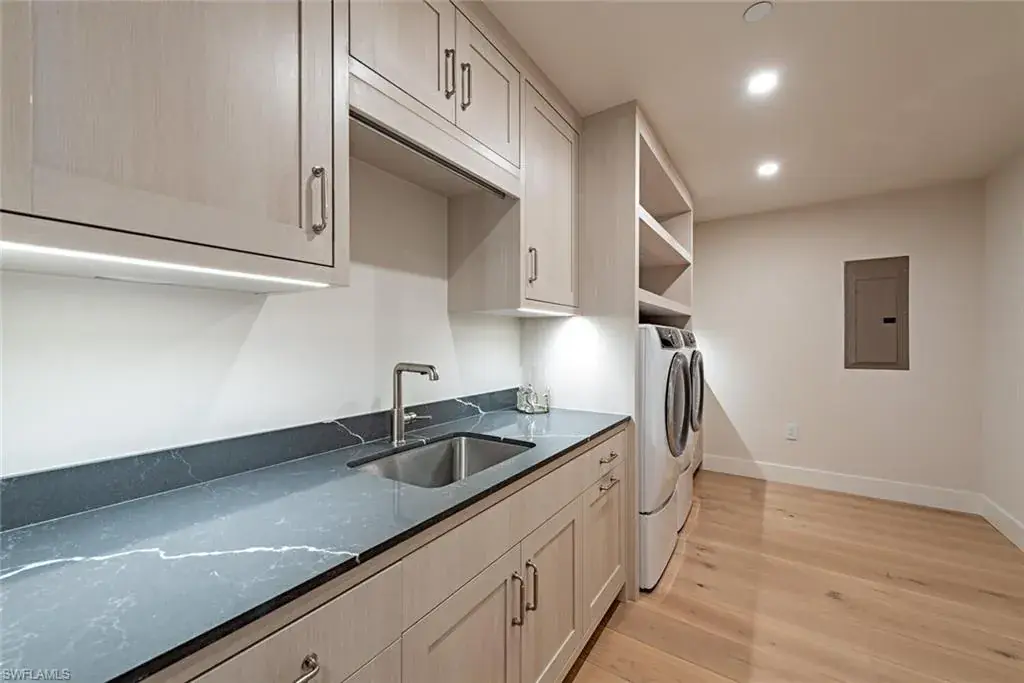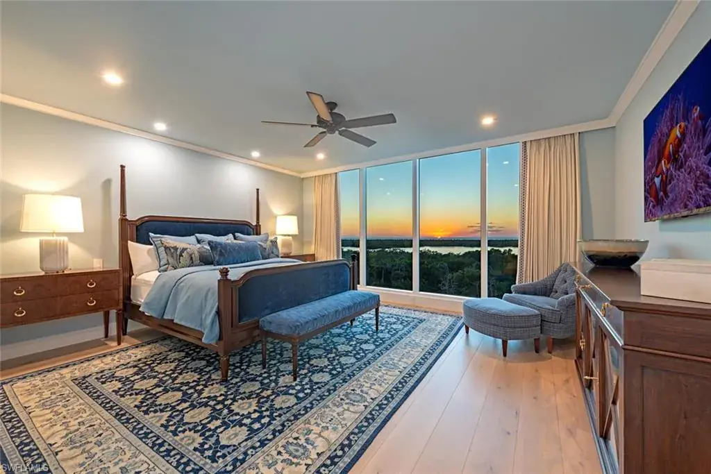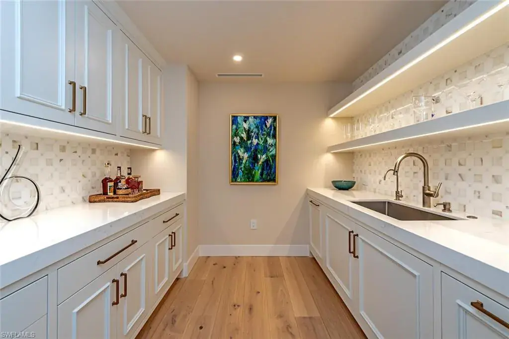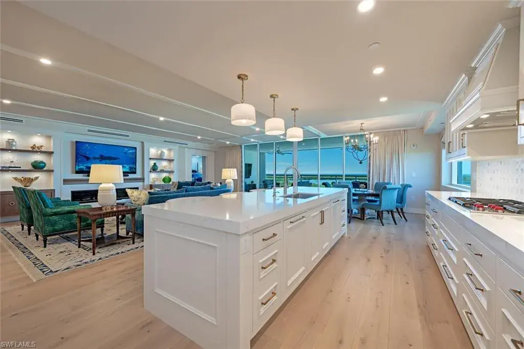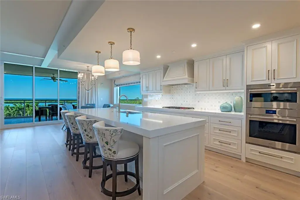 Elegant finishes and sophisticated design define this 6th-floor corner residence in Tower 300 at Kalea Bay. This turnkey home showcases professional interior design with luxurious furnishings, custom built-ins, exquisite millwork, designer wall coverings and lighting throughout. A wall of sliding glass doors opens to a spacious lanai, offering breathtaking Gulf sunsets. The residence lives like a single-family home, spanning 3,223 square feet with three bedrooms, a den with private balcony, and three-and-a-half baths, including a spectacular primary suite featuring a 9’x18.5’ custom closet. Highlights include Legno Bastone wide-plank oak floors, custom cabinetry, motorized shades, crown molding, a Kinetico water softener with carbon filter and RO drinking system and upgraded air purification. The open gourmet kitchen boasts Wolf gas appliances, Sub-Zero refrigeration, a full-height wine cooler, and a butler’s pantry with ample storage. Enjoy direct elevator access to the building’s exceptional rooftop amenities, featuring a pool, open-air fitness center, BBQ grills, and lounge areas—all with sweeping Gulf views and unforgettable Naples sunsets. — This Kalea Bay residence provides all the conveniences of living in a luxury condominium and membership to a private club with 5-star amenities, a combination that has made Kalea Bay one of the most successful and desirable communities in Naples. Built in 2022, Tower 300 is located directly across from the Club at Kalea Bay and provides easy access to 80,000 square feet of exceptional modern amenities, including a wellness center with a state-of-the art gym, spin room, Pilates, spa services plus 3 resort style pools, 2 open-air poolside bars, fine and casual dining options, outdoor fire pits, a kids’ game room, 8 pickleball and 4 tennis courts, guest cottages and more. Kalea Bay Residents also have the option to join the annual Beach Card Program, based on availability, which grants access to the private Beach Club at Moraya Bay at Vanderbilt Beach for dining both indoor and outdoor as well as beach service including food, beverages, chairs and umbrellas.