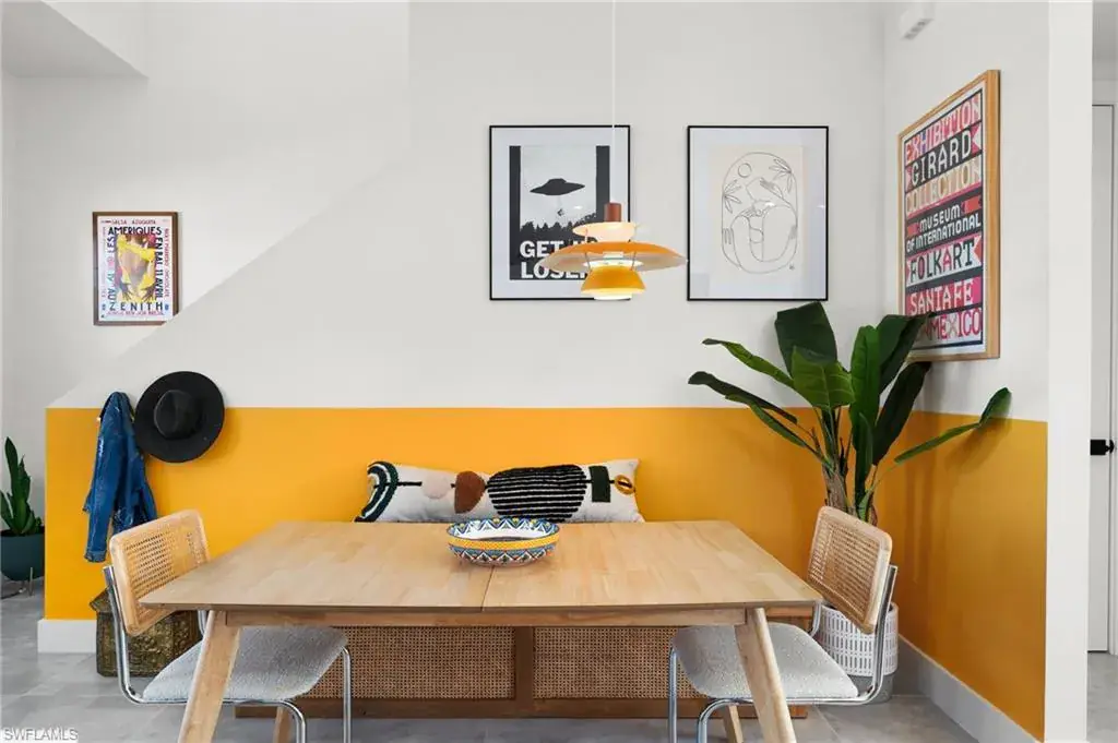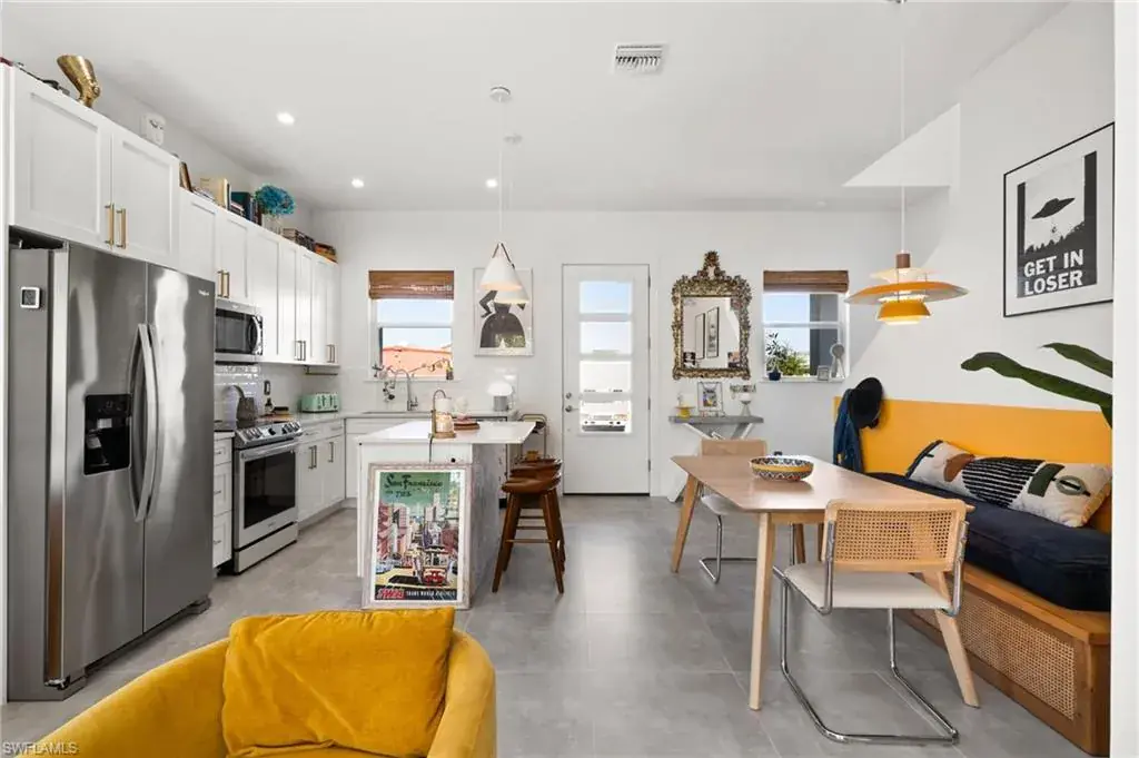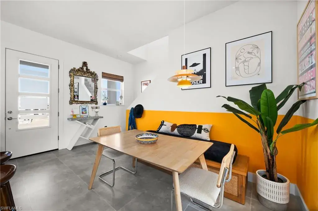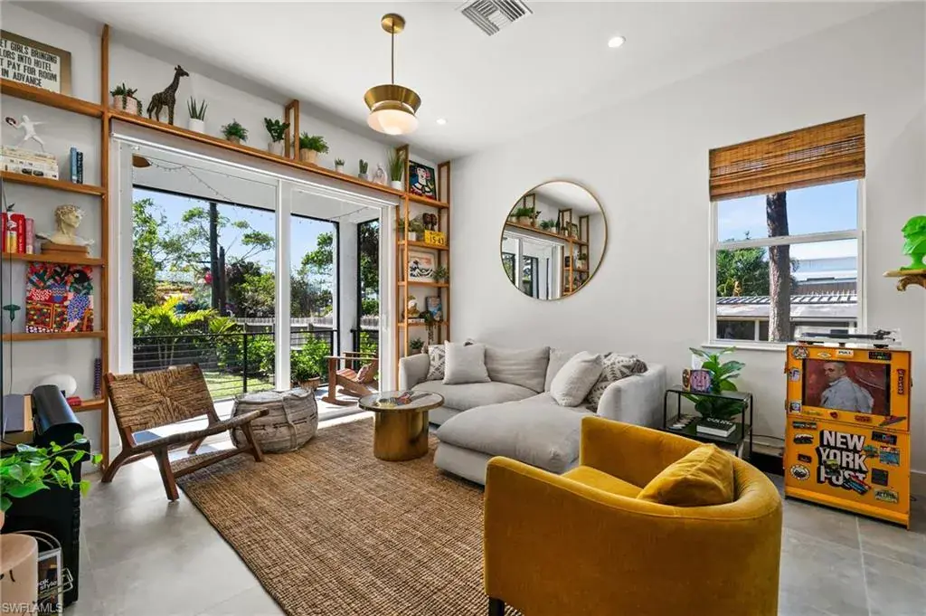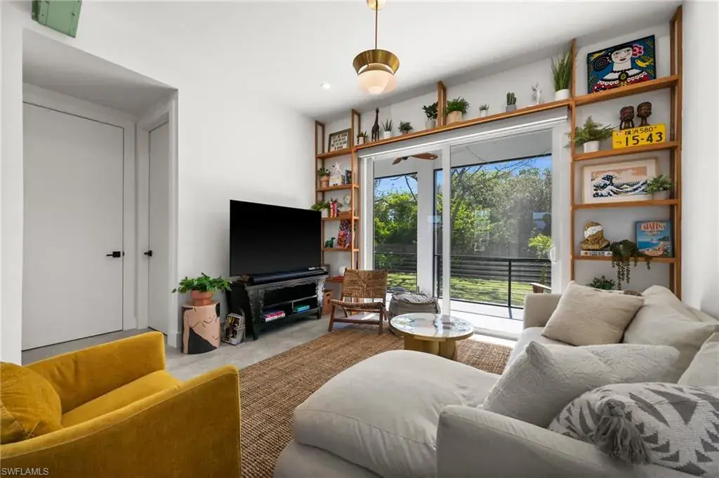 MOVE IN READY – Welcome to your modern oasis in the Bayshore Arts District with no HOA. This meticulously updated home offers a perfect blend of style and comfort, featuring 2+ spacious bedrooms and 2.5 bathrooms within 1,330 square feet of thoughtfully designed living space. Step inside to discover volume ceilings and an open floor plan, complemented by custom bamboo window treatments and designer lighting that adds a touch of elegance throughout. The living room boasts a privacy luxury screen slider; seamlessly hidden when not in use to enhance functionality and aesthetics. The kitchen is equipped with a Samsung Bespoke range (2023) and a convenient trash slide-out feature in a lower cabinet. Tile floors, sealed for durability, extend throughout the home, offering a sleek and modern design. Enjoy the comfort and security with impact glass windows and doors, with added benefit of professionally tinting to block UV and reduce heat – without sacrificing natural light. Extra attic insulation installed in 2020 to ensure energy efficiency year-round. The master bedroom is a retreat, featuring crown molding and custom wood closets. The office and second bedroom also offer custom wood closet solutions, providing ample storage and custom barn doors for space efficiency. The screened-in lanai invites you to relax and enjoy the private outdoor space, enhanced by OtO lawn irrigation units and lush landscaping. Clusia trees are strategically planted to provide a natural privacy feature, growing over eight feet tall in the not-too-distant future. This pet-friendly home is not only stylish but also practical, with a washer and dryer conveniently located in the unit. Additional features include upgraded modern door hardware, luxury wallpaper, and custom built-in bookshelves on both levels. Experience the perfect blend of modern living and privacy in this single-family home. Schedule your private tour today and envision the lifestyle that awaits you in the Bayshore Arts District. Perfect for a first-time homebuyer (FHA), a seasonal or full time resident.