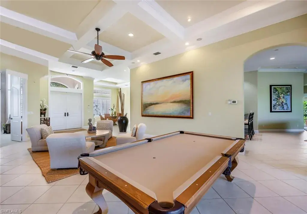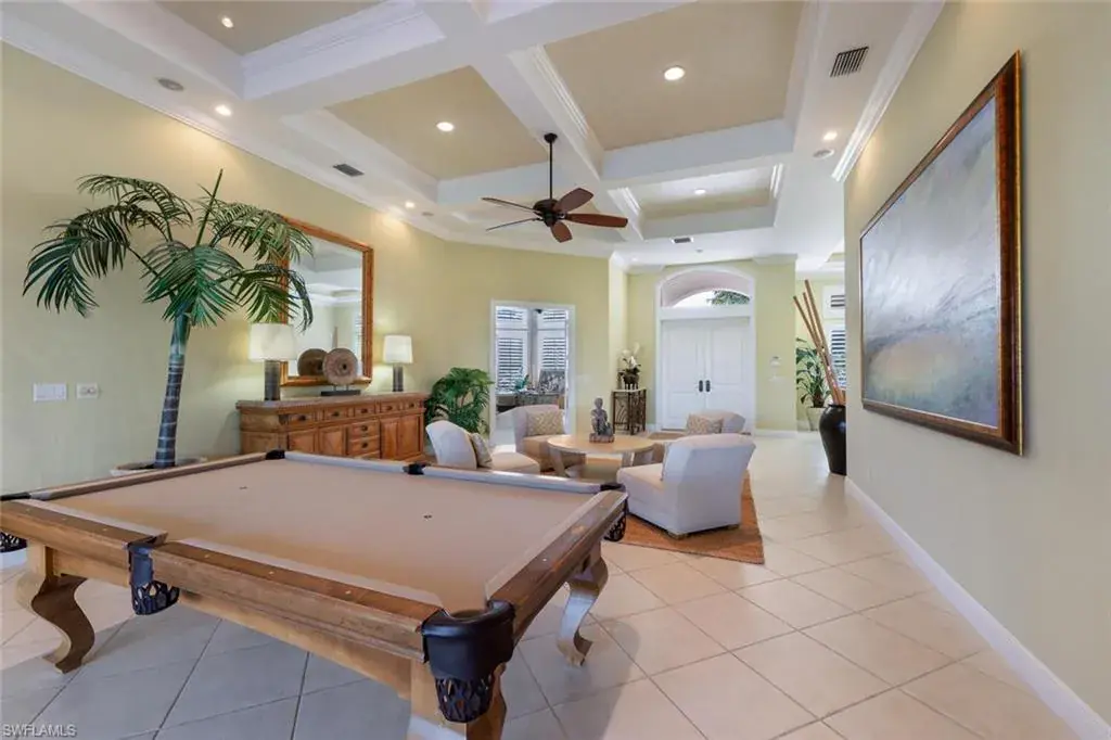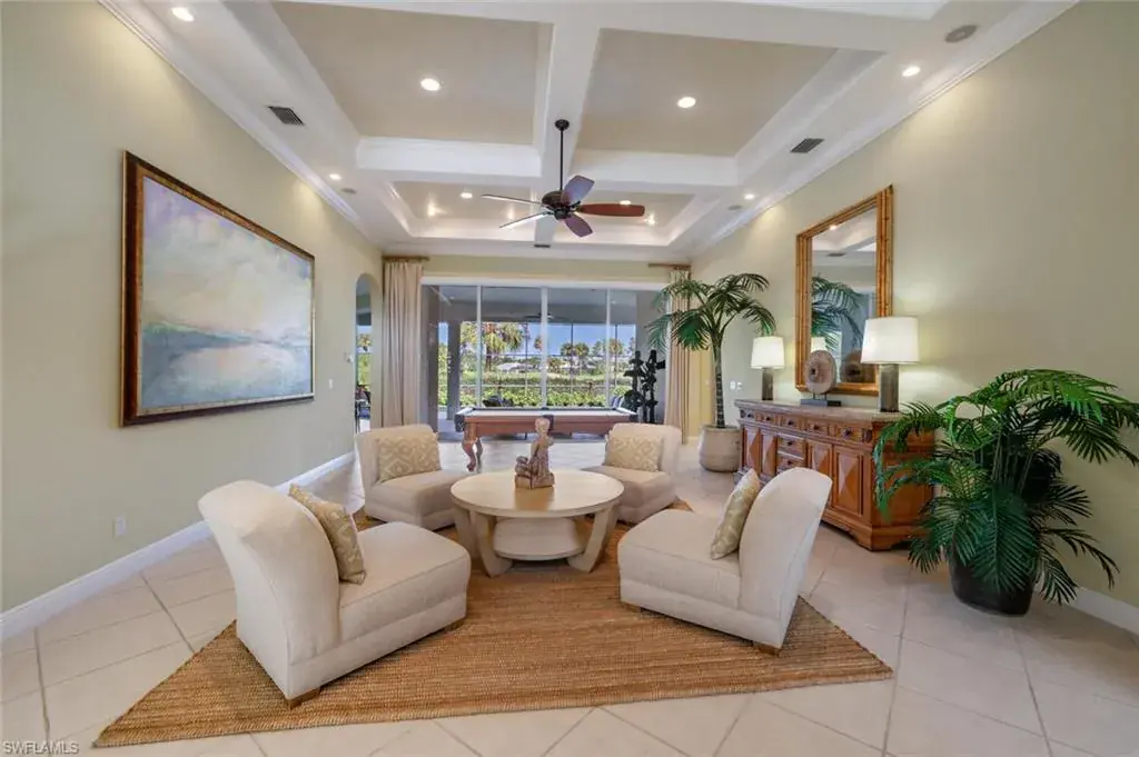Exquisite residence inside and out, ingeniously designed around breathtaking views of the prestigious KCC signature 4th hole. This home exudes a serene yet grand presence, where the lush manicured exterior offers a tantalizing glimpse of the luxury that awaits within. The thoughtful layout of this home allows each space—from the formal living and dining rooms to the family room, kitchen, and lanai—to shine individually as every room’s generous proportions are balanced by a design that encourages an easy flow, making each area a natural gathering spot. Bedroom suites are strategically positioned around three corners of the home, creating a sanctuary for owners, family, and guests alike. The kitchen is worthy of a chef’s kiss with its intuitive layout, offering quiet yet practical features. From the ample cabinetry, counter space, breakfast bar, and wet bar to the cabinets in the island and its extended counter, offering a dual purpose of prep space and seating area that invites casual interaction while meals are being prepared, turning the kitchen into a warm, inviting hub. Pocketing sliders in the family room open to the expansive lanai, dissolving the barrier between indoors and outdoors, allowing the breathtaking views of the lush greens, the shimmering pool, and the inviting spa to take center stage. The lanai itself, with its ample lounging areas, serves as a natural extension of the indoor spaces, providing the perfect setting for relaxation, entertainment, and enjoying the beauty of Florida living. The home also features a 2-car garage and a dedicated golf cart garage. Every aspect of this home has been designed with the utmost care, ensuring comfort, luxury, and a seamless indoor-outdoor living experience from nearly every living space. Ideally located in the heart of Naples, you are just minutes from Waterside, Mercato, vibrant downtown Naples, and the pristine Gulf beaches. This is not just a home—it’s a lifestyle.