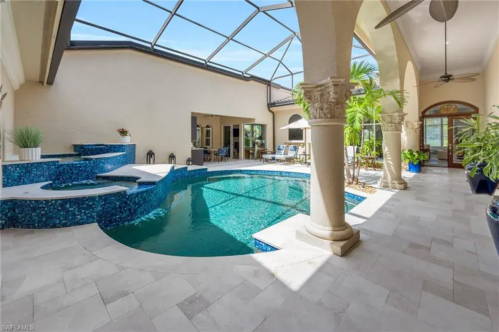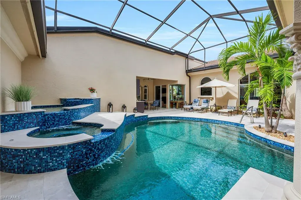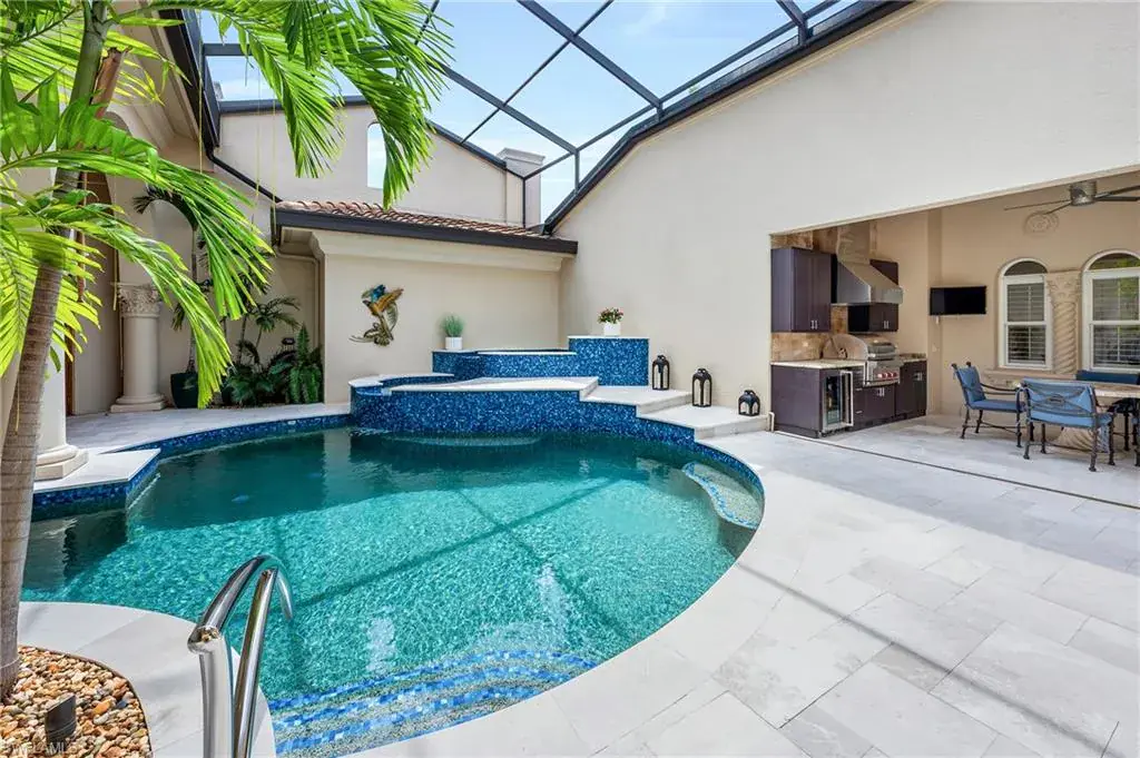 An extraordinary residence awaits in Kensington Country Club, perfectly positioned on the #4 Signature Hole. Beyond the grand Mahogany front door, an updated courtyard oasis welcomes you, where a fully renovated saltwater pool and spa, complemented by an outdoor kitchen, create a serene retreat that sets the tone for the artful craftsmanship and luxurious living that unfolds throughout this stunning 3-bed-plus-den, 3.5-bath home. The formal living room captivates with a distinctive fifth-wall teak plank accent, creating an inviting and refined ambiance. Walls of windows usher in natural light, seamlessly blending indoor and outdoor living while offering uninterrupted views of the greens through the newly added picture frame screen enclosure on the second lanai. This space feels like a front-row seat to the golf course, where western exposure provides majestic sunsets as the day fades over the fairway. The gourmet kitchen is a visual and functional masterpiece designed to delight even the most discerning chef. It’s both stylish and practical, outfitted with high-end appliances, including Sub Zero Refrigerator, Wolf gas cooktop/range, Wolf Microwave, custom cherry wood cabinetry, and a striking zebra wood island with 2 refrigerated drawers and extra storage. Thoughtful additions like a pot filler, glass subway tile backsplash, and a wine cooler elevate the culinary experience. Adjacent to the kitchen, a wet bar enhances the home’s entertaining appeal. Designed for comfort and versatility, the home features two separate living areas—a formal living room and Dining room and Kitchen Great Room with a gas fireplace for cozy evenings. The primary suite is a sanctuary of serenity, showcasing a comprehensive bathroom renovation with modern fixtures, elegant finishes, a massive walk-in shower with intricate tilework, multiple shower heads, and a freestanding soaking tub. The versatile office/den, featuring Custom Cabinetry, a Murphy bed and access to a Jack and Jill bathroom shared with added third bedroom, provides flexible sleeping space and can easily convert to a fourth bedroom, while the private casita off the pool creates an exclusive VIP retreat for guests. Recent impressive updates continue throughout, including the renovation of all bathrooms, a primary bedroom refresh, complete interior and ceiling painting, freshly painted exteriors, and new garage doors with sleek epoxy flooring. The courtyard area and pool were completely renovated, the back lanai sports new Leathered Marble and both areas have newly enclosed with super screens. Embrace a lifestyle of luxury and timeless beauty in this extraordinary Kensington estate.
