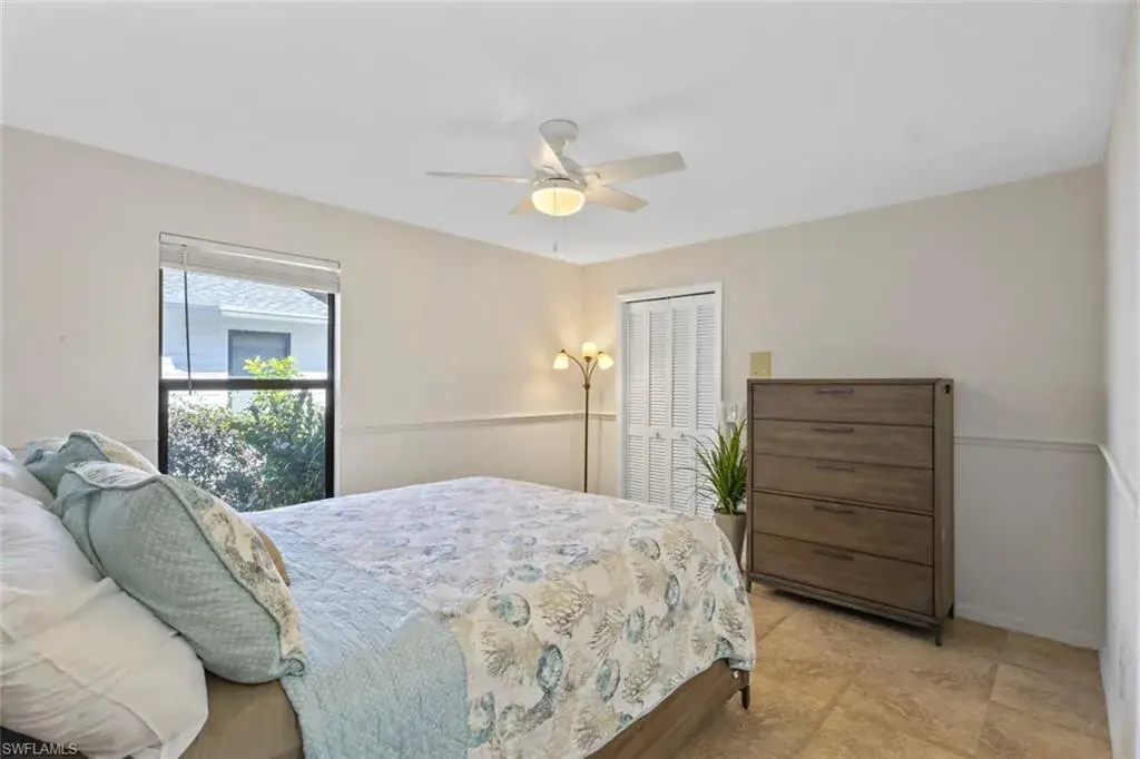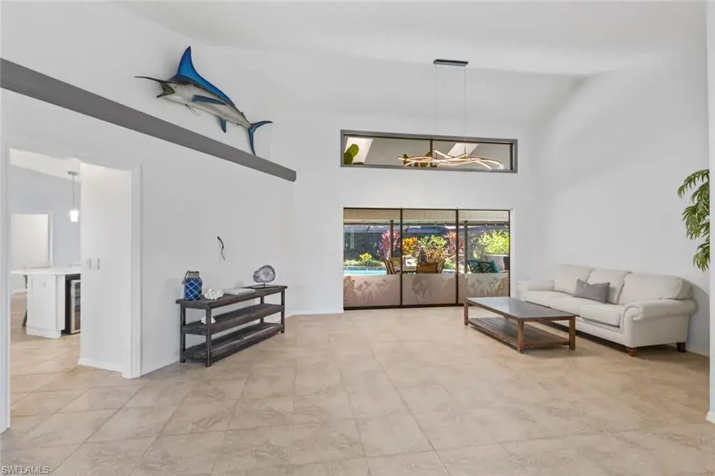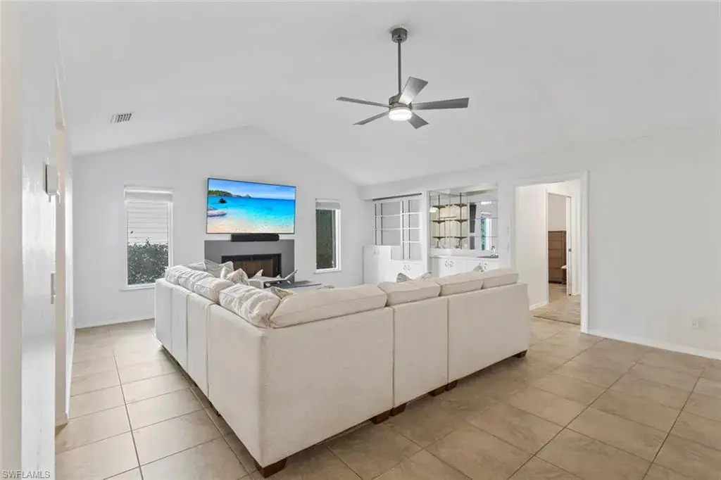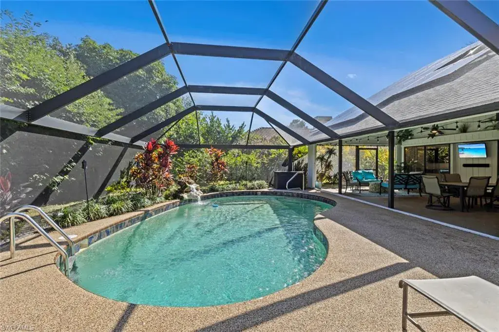 Beautifully updated pool home in the coveted community of Kings Lake. This 3-bedroom, 2.5-bath residence offers nearly 2,500 sq ft of living space with multiple living areas, soaring vaulted ceilings, and a bright, open layout. The upgraded kitchen features new countertops (2025) and a convenient pass-through window to the pool area. Recent improvements include upgraded electric, two new HVAC units, new washer and dryer, new refrigerator, and fresh paint (all 2023). The home also features solar panels, a cozy fireplace, hurricane shutters, and abundant natural light from multiple skylights. The landscaping has been refreshed with new plantings and numerous fruit trees throughout the yard. Enjoy the large screened lanai with pool and a private backyard backing to the walking trail—no rear neighbors! Kings Lake offers scenic walking paths and a prime Naples location just minutes to downtown and the beach. Ideal for full-time or seasonal living.