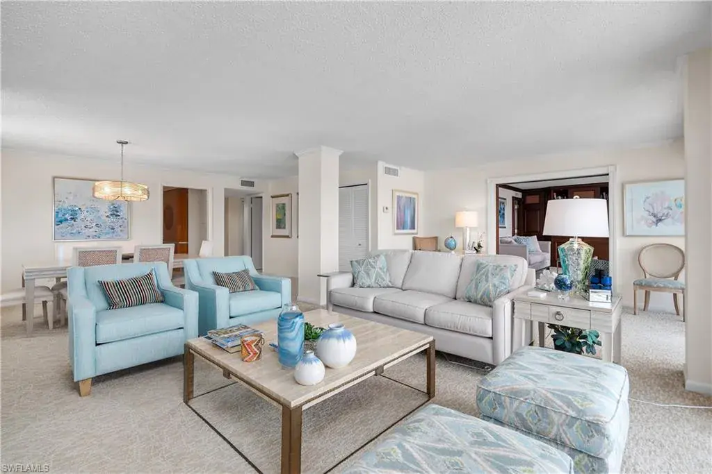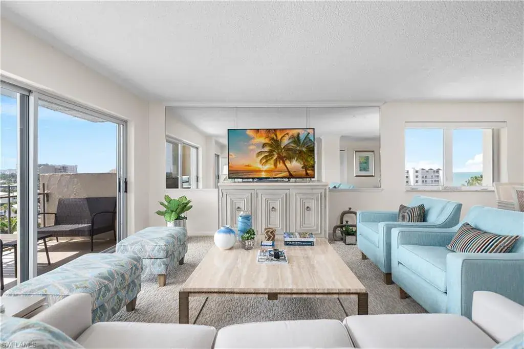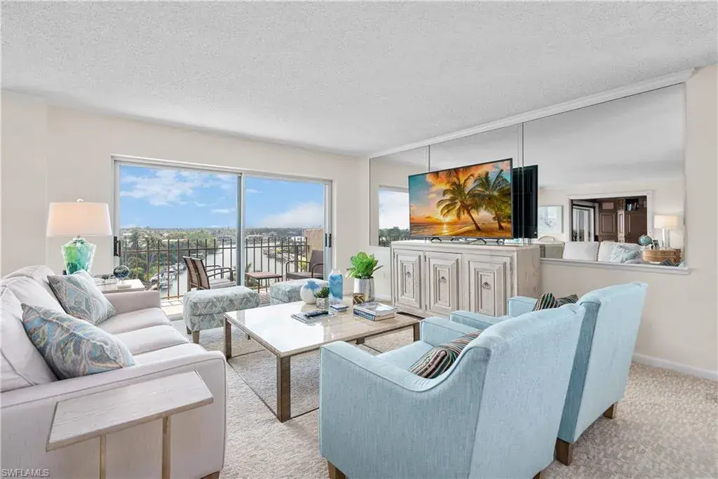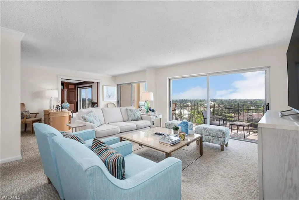 Enjoy the beautiful bay views and a glimpse of the Gulf from this large penthouse home in Kingsport. The boutique Kings Port COOP is ideally located just south of Mooring Line Dr. bridge with quick access to downtown. The open floor plan with 3 bedrooms plus a den and over 2,300 square feet, is well-maintained and can comfortably house residents and guests or serve as a profitable rental. This home has a divided area for the master to enjoy privacy with its own library/den area and balcony views. Residents will appreciate the two open lanais, modern kitchen cabinetry, true den space,and 2 parking spaces with storage. Residents of Kings Port are also immediate members of the Moorings Beach Association with beach access almost directly across the street. Location!