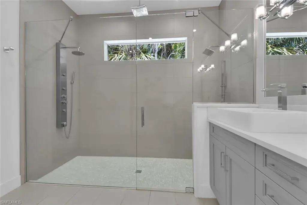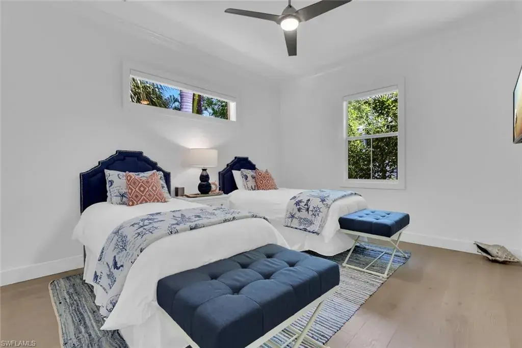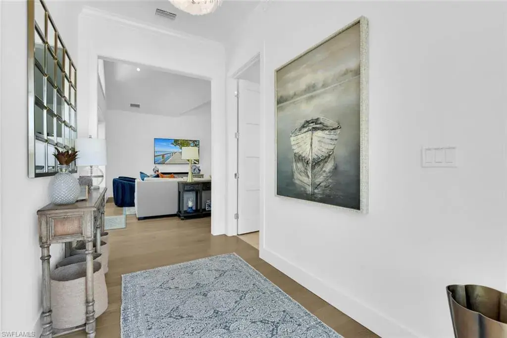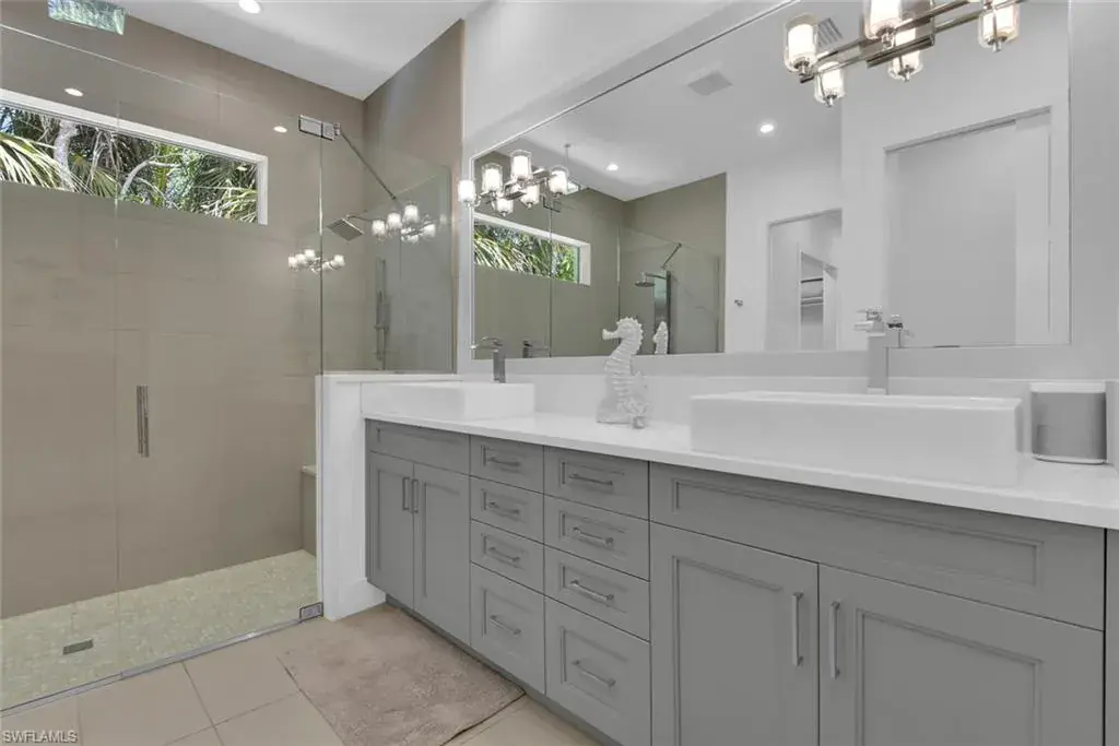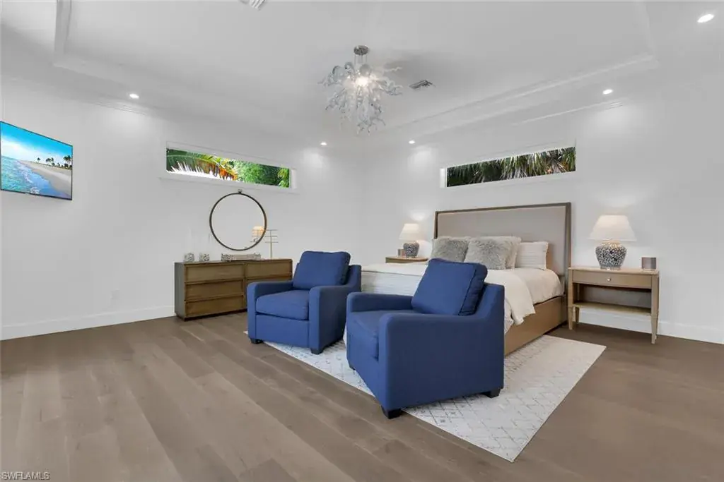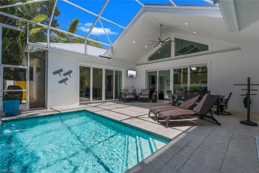 Escape to this beautifully updated 3-bedroom, 3-bathroom home nestled in a tranquil neighborhood of Naples. Just minutes from the vibrant 5th Avenue, pristine beaches, and local attractions, this residence offers the perfect blend of relaxation and convenience. Step through the front door and into a light-filled space featuring soaring 15-foot ceilings, skylights, and an open-concept design that flows seamlessly from the great room to the chef-inspired kitchen. With high-end stainless steel appliances—including a Fisher & Paykel 5-burner gas cooktop, Sub-Zero wine fridge, and sleek European-style cabinetry—this kitchen was made for entertaining. The oversized quartz island and reverse osmosis water filtration system add the perfect touch of functionality and flair. A wall of glass sliders opens to your private, screened-in lanai, where a heated saltwater pool with LED lighting and a modern water feature creates a relaxing outdoor oasis. Whether you’re enjoying a morning coffee, poolside lunch, or a sunset cocktail, this space is made for memorable moments with family and friends. Inside, the luxurious primary suite offers a true retreat with a spa-like en suite bath and direct access to the lanai. The second bedroom features a plush king bed, while the third bedroom is set up with two comfortable twin beds—perfect for kids or additional guests. Every detail has been thoughtfully designed to make your stay feel special—from the warm hardwood floors and elegant coffered ceilings to the sleek electric blinds and classic crown molding. The home is spotless and lovingly maintained, creating a fresh, comfortable space you’ll love coming back to after a day in the sun. For beach days, we’ve got you covered—chairs, umbrella, and a cooler are all provided. This is the Naples vacation you’ve been dreaming of—stylish, spacious, and perfectly located.