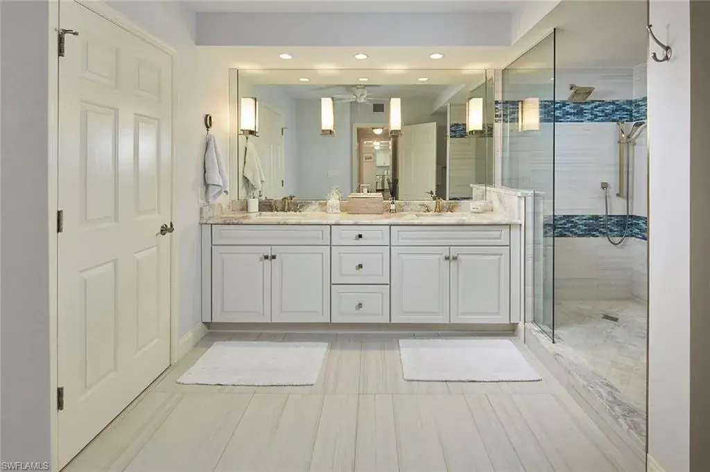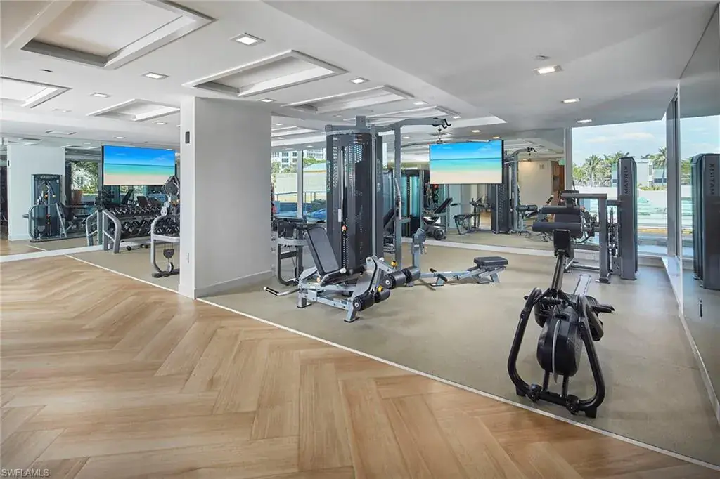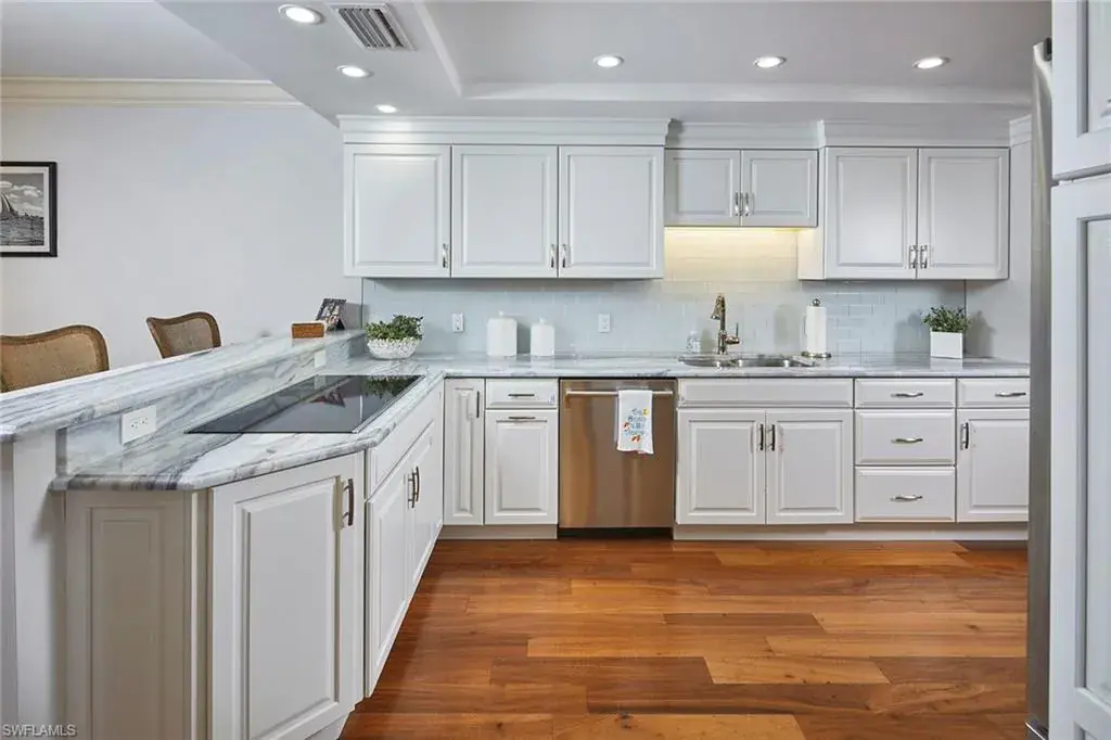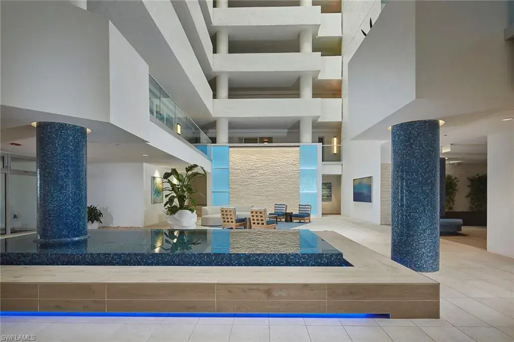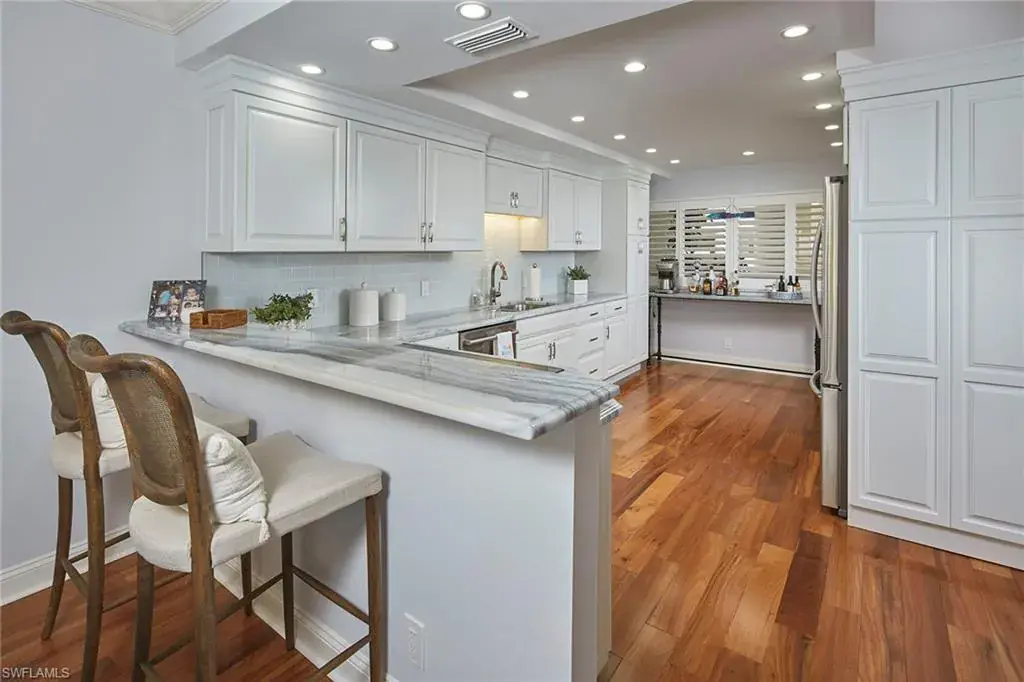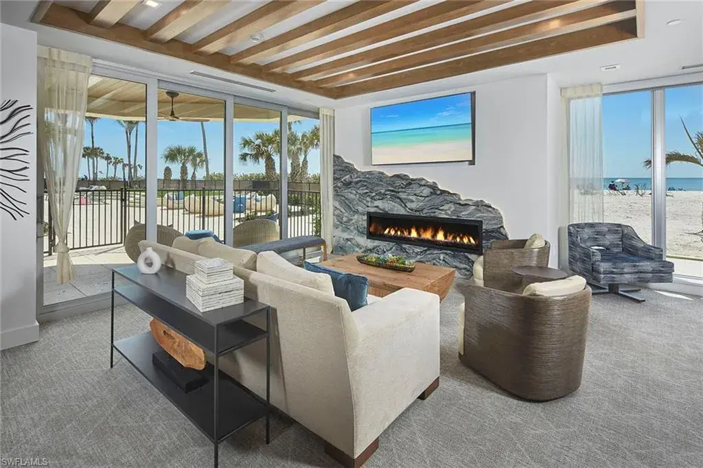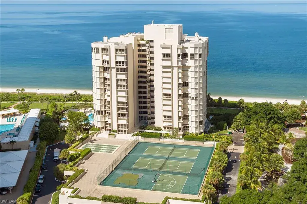 Stunning long range southerly Gulf and Park Shore beach views can be seen from nearly every room in this updated luxurious La Mer residence. The ideally located 12th-floor home was tastefully remodeled including wood flooring in the main living areas, a new kitchen with white cabinets and quartzite countertops along with stainless-steel appliances. The large great room has an adjacent dining area and two sets of sliding glass doors that open to a spacious screened-in lanai ideal for enjoying the Naples mild winters and picturesque beach views. The owner’s suite has a spacious custom walk-in closet, a completely updated bath with dual sinks, quartzite countertops, large walk-in shower and endless beach and water views from the bedroom through three floor-to-ceiling windows. Additional features include electric storm shutters throughout, newer air-conditioning unit, an updated guest bath, in-residence laundry room and exterior storage closet. La Mer amenities include a modern coastal common area decor, 24-hour staffed front door, beachside resort pool and spa, direct beach access, newly remodeled fitness center, tennis and pickleball courts, gas grills, three guest suites and rooftop observation terrace. La Mer is in distance of upscale shopping and waterfront dining at Venetian Village. Also in proximity is the Venetian Bay Yacht Club which features boat docks for lease or purchase.