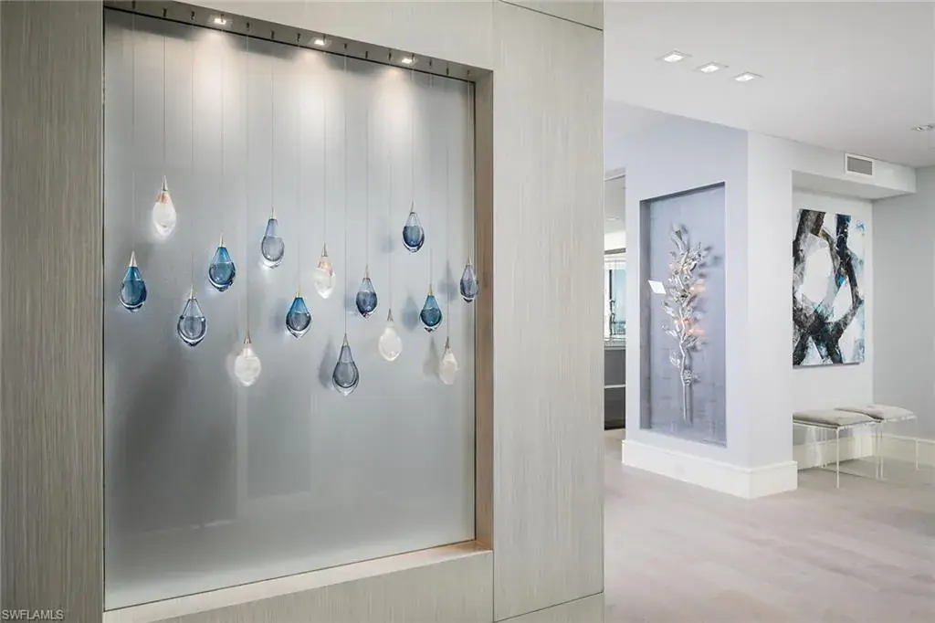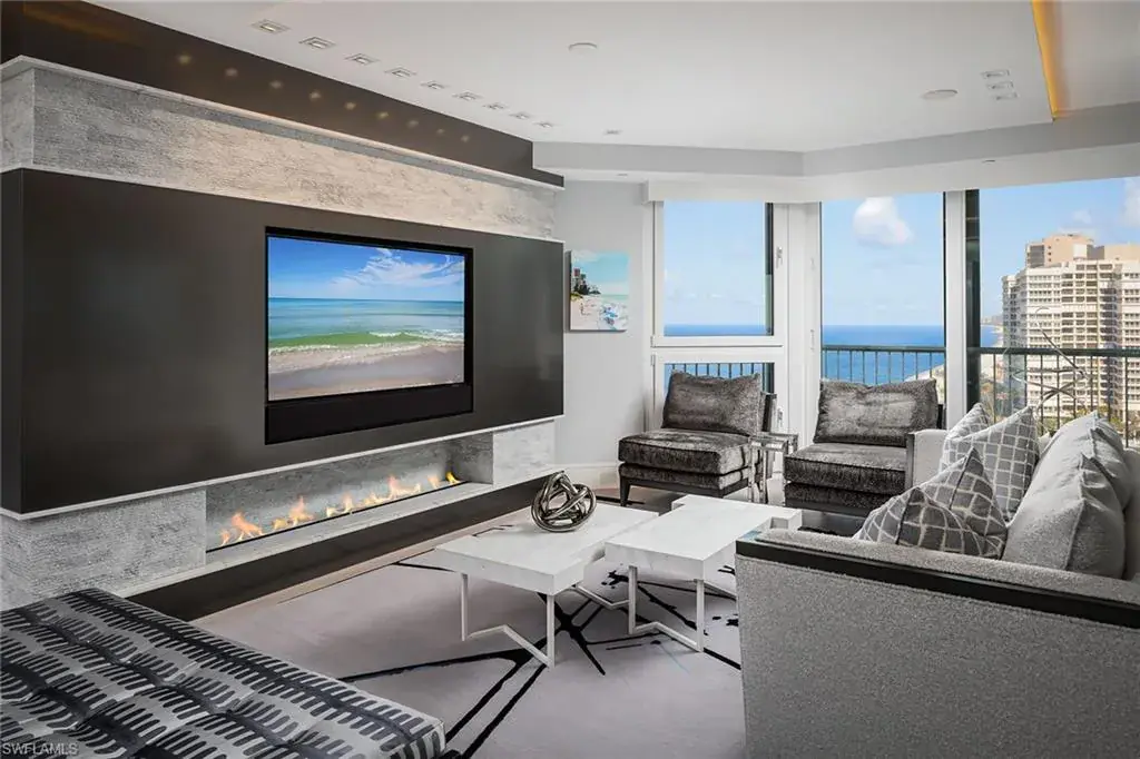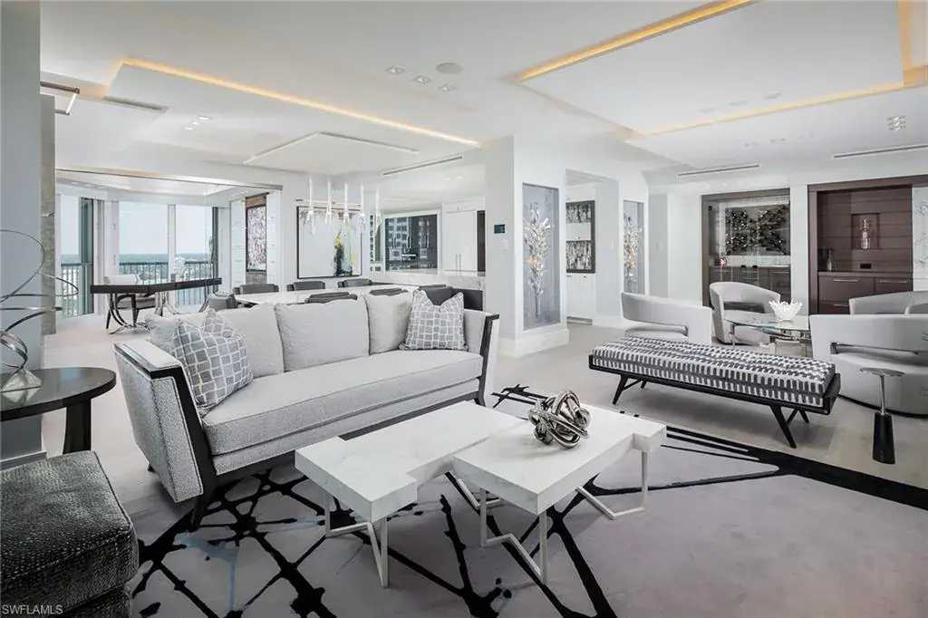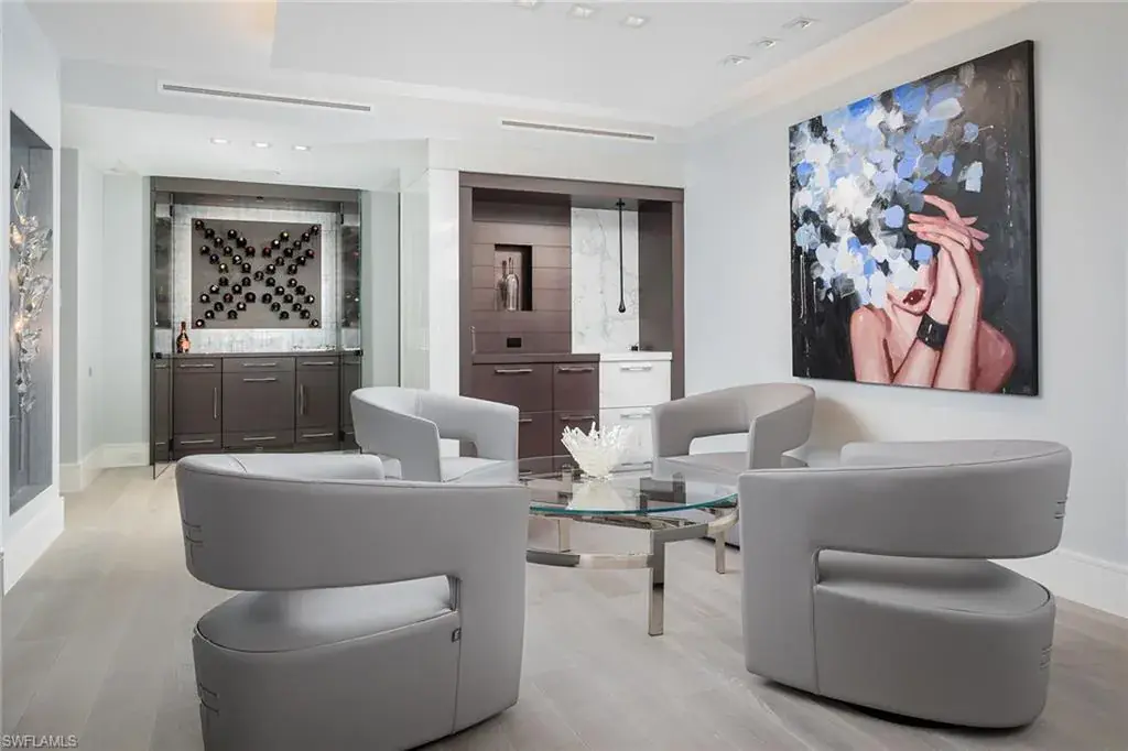 This exquisite Gulf of Mexico penthouse was fully gutted and reconstructed to create open living, dining, kitchen areas. It is offered turnkey. Residence captures the full essence of life on the beach and offers stunning evening views of “city” lights. Architecturally designed with “Manhattan on the beach” as the theme. Utilizes imported stone/Carrera marble/quartzite to maximize views and use of light. Minimalist style features artwork from distinguished local artisans, custom furniture from Italy, custom imported cabinetry, custom high-tech panels to control ambiance, 2 bars, glass-enclosed study/office to afford panoramic views of both the beach and Naples Bay/Venetian Village. Two assigned garage parking spaces. Building update scheduled to be substantially completed by end of 2023. Amenities: 2 guest suites, 24-hour manned front desk, heated pool and spa overlooking the Gulf of Mexico, club/card room/library, exercise/fitness, billiards, entertainment room, tennis and more. Located in the Park Shore beach community, minutes to Old Naples, fine dining, shopping, and cultural activities. Naples private airport is minutes away, the international airport is about 30 minutes away.