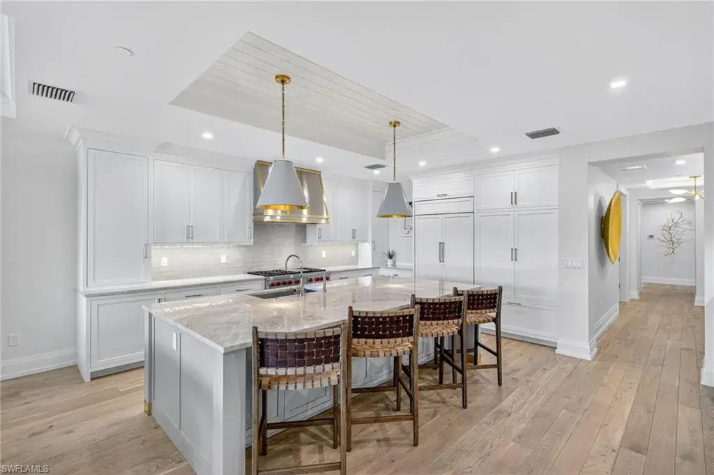 Arrive via a secure elevator into a thoughtfully curated interior that blends classic elegance with modern comfort. Wide-plank hardwood and tile flooring, detailed millwork, and custom tray ceilings set the stage for gracious living. The chef’s kitchen anchors the home with a spacious central island, Wolf gas range, Sub-Zero appliances, and bespoke cabinetry—effortlessly flowing into expansive living and dining areas designed for both intimate gatherings and refined entertaining.