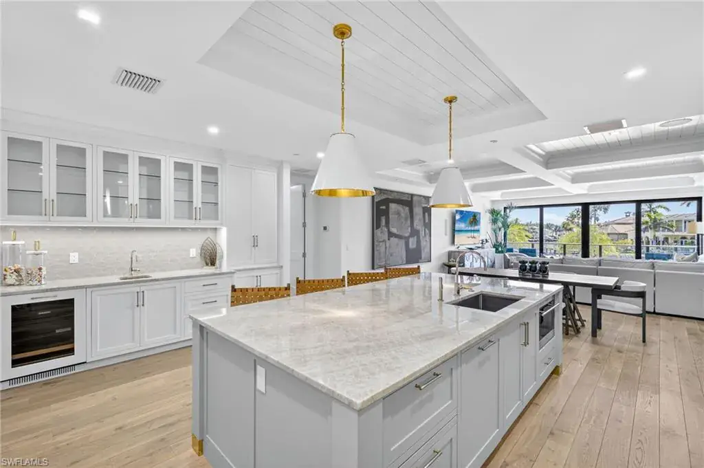 An expansive main balcony showcases tranquil bay views perfect for morning coffee or an evening cocktail, while guest suites feature their own private balconies—perfect for enjoying Naples’ famed sunsets. The primary suite is a true sanctuary, complete with balcony access, a spa-inspired bath with dual vanities, a glass-enclosed shower, soaking tub, and custom walk-in closets. A wet bar, powder room, and full laundry suite further elevate the home’s functionality and style.