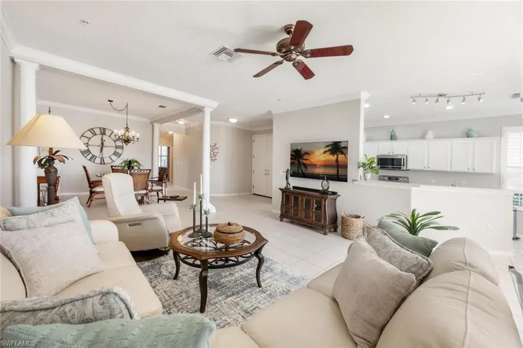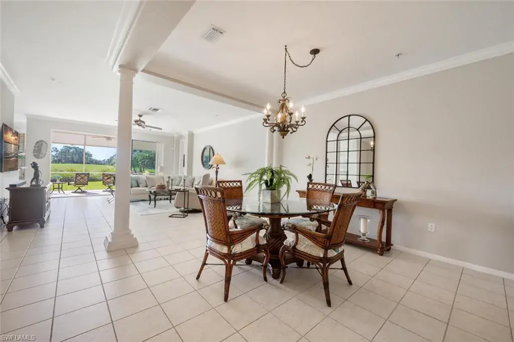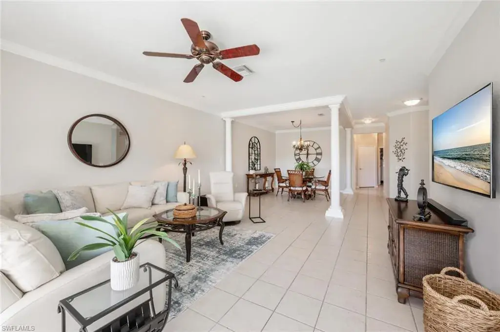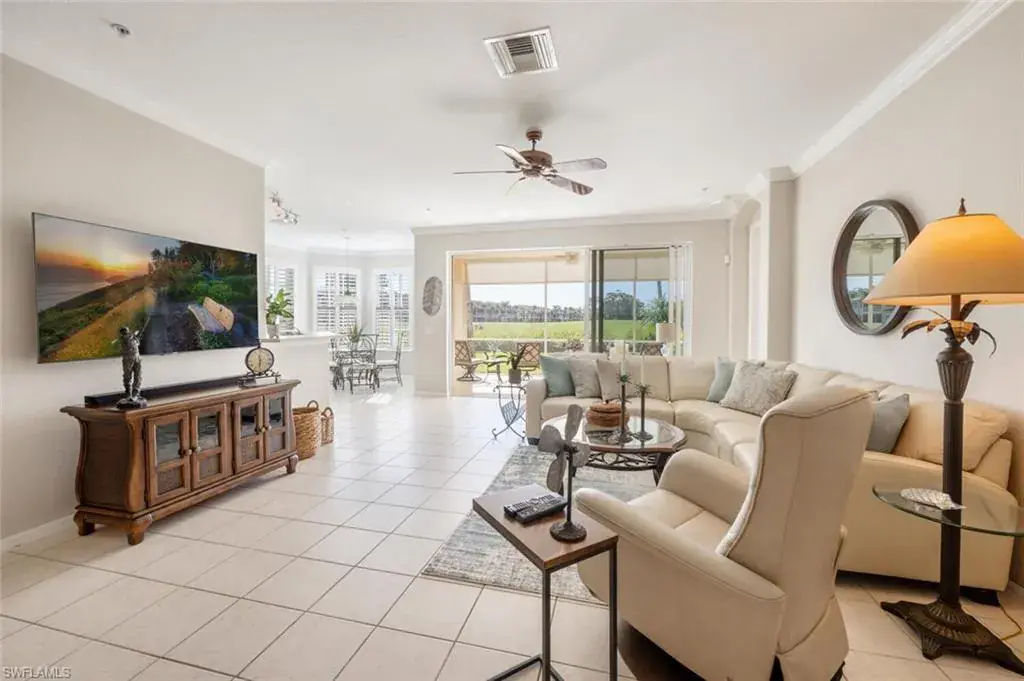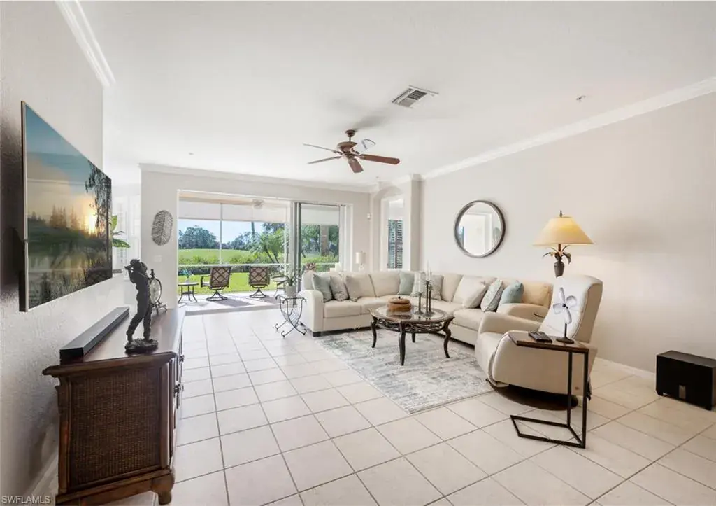 Welcome to this coastal themed carriage home in the beautiful, bundled golf community, Naples Lakes Country Club. This property is in a prime location; it has it all– privacy, it’s on the cue-de-sac, surrounded by nature — you hear birds and trees-rustling, has a golf view the #10 green, it’s a first floor end unit – generous space, just under 2,000 square feet, 3 bedrooms and 2 full baths, a one car attached garage, and lots of sunshine with southern exposure, light and bright, sunlight floods this home. It is being sold turnkey with lovely furnishings, TV’s, and full kitchen. One of the bedrooms is shown as a multi-purpose room, pull out sofa, tv, and printer. It has crown molding, plantation shutters, tiled floor in the main living space and wood plank floors in the bedrooms. It has a large lanai with pull down shades for complete privacy. There are 8 units per building, 4 upper and 4 lower. It’s ready for the new buyer to arrive, drop a bag, and begin to enjoy the many amenities offered in Naples Lakes Country Club. Use your personal golf cart on the course with the purchase of a trail fee. It’s close to Marco Island, Naples beaches, and Fifth Ave South for shopping and dining. Naples Lakes is a beautiful Gated Resort style community with an 18 hole Arnold Palmer Signature golf course, new outdoor cabana, heated pool & spa, outdoor and indoor dining, outdoor expansive bar, fire pits, tennis, dillyball, bocce ball and fitness center. EVERY HOME PURCHASE = IMMEDIATE GOLF MEMBERSHIP; NO BUY-IN, NO WAITLIST!