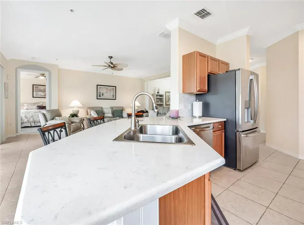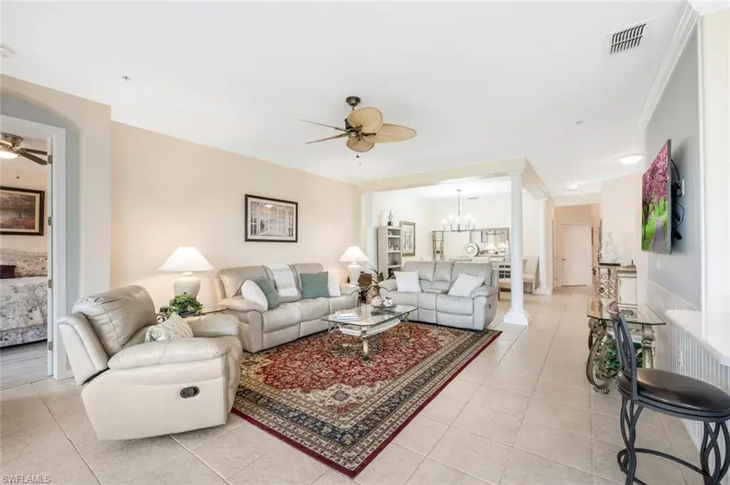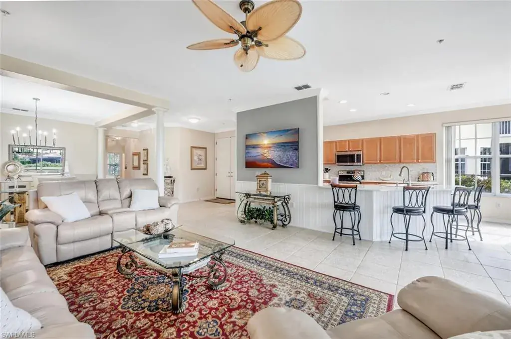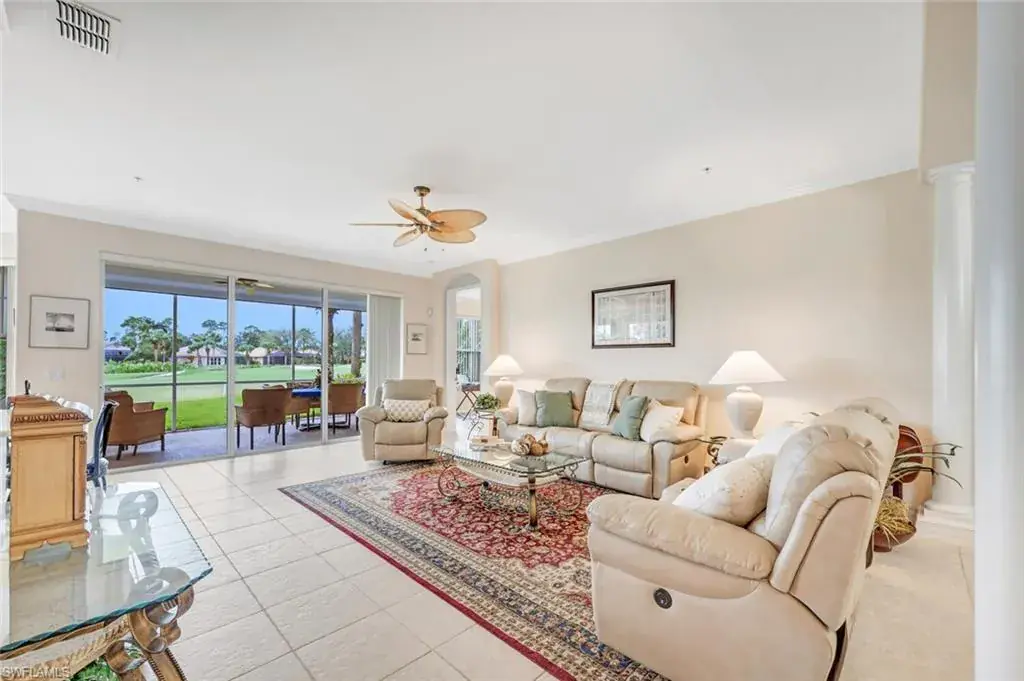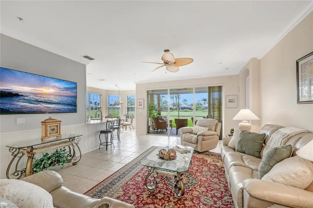 LOCATION, LOCATION. Welcome to this beautiful furnished Carriage Home in Naples Lakes Country Club. Its location is superb — right on the approach to the green on #10 on the fabulous 18 hole Arnold Palmer Signature Golf Course. It has what buyers are looking for; location on the golf course, first floor, 3 bedrooms, 2 full bathrooms, furniture to get started with, power storm protection and more. It has high ceilings, ~9.2′ tall, it’s spacious just shy of 2,000 square feet, an end unit and an attached one car garage. The home is equipped with an electrical transfer system that allows for a portable generator. There are 8 units per building, 4 uppers and 4 lowers. It’s ready for the new buyer to arrive, drop a bag and begin to enjoy the many amenities offered in the Naples Lakes Country Club. Use your personal golf cart on the course with the purchase of a trail fee. It’s close to Marco Island, Naples beaches, and Fifth Ave South for shopping and dining.Naples Lakes is a beautiful Gated Resort style community with an 18 hole Arnold Palmer Signature golf course, New outdoor cabana, heated pool & spa, outdoor and indoor dining, outdoor expansive bar, Fire Pit, Tennis, Dillyball, Bocce ball and fitness center. EVERY HOME PURCHASE = IMMEDIATE GOLF MEMBERSHIP; NO BUY-IN, NO WAITLIST!