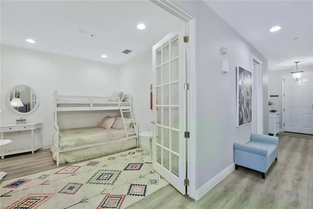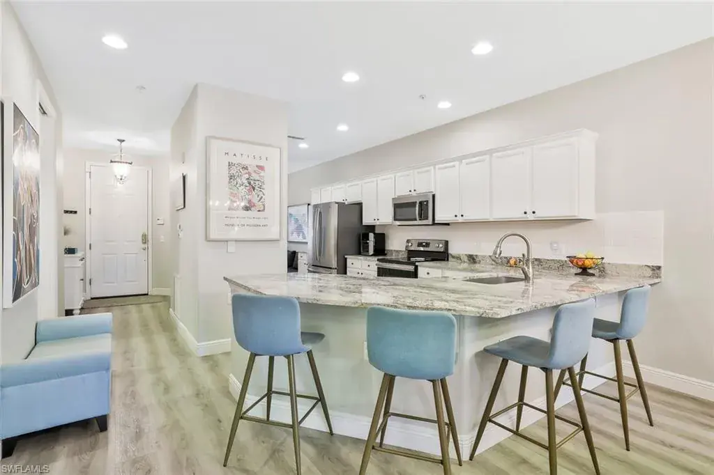 Experience sweeping lake-to-golf vistas that capture the very essence of Naples living. Overlooking the 16th hole of the Signature Arnold Palmer–designed course, this beautifully renovated residence in Lake Barrington at Naples Lakes Country Club pairs captivating scenery with timeless sophistication. Meticulously updated in 2021/2022, the 2-bedroom plus den, 2-bath condominium offers a seamless blend of comfort, elegance, and versatility. The den currently serves as a grandchild’s sleeping and playroom quarters, while the kitchen’s breakfast nook has been reimagined as a cozy sitting area—showcasing the home’s thoughtful design and adaptability. From your private lanai, enjoy breathtaking lake-to-fairway views that create the perfect backdrop for unforgettable Naples sunsets.