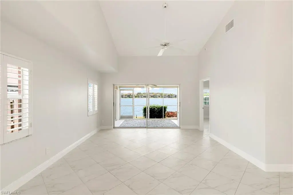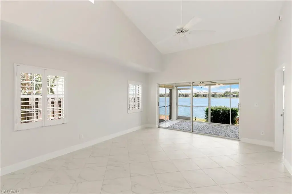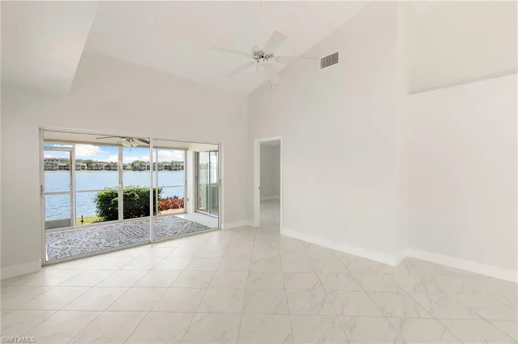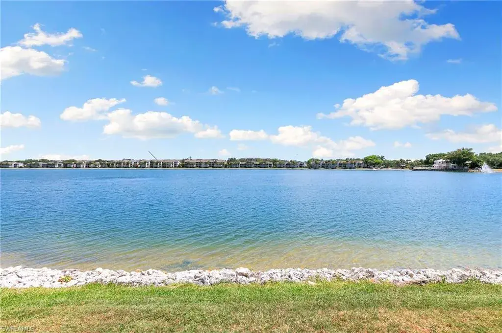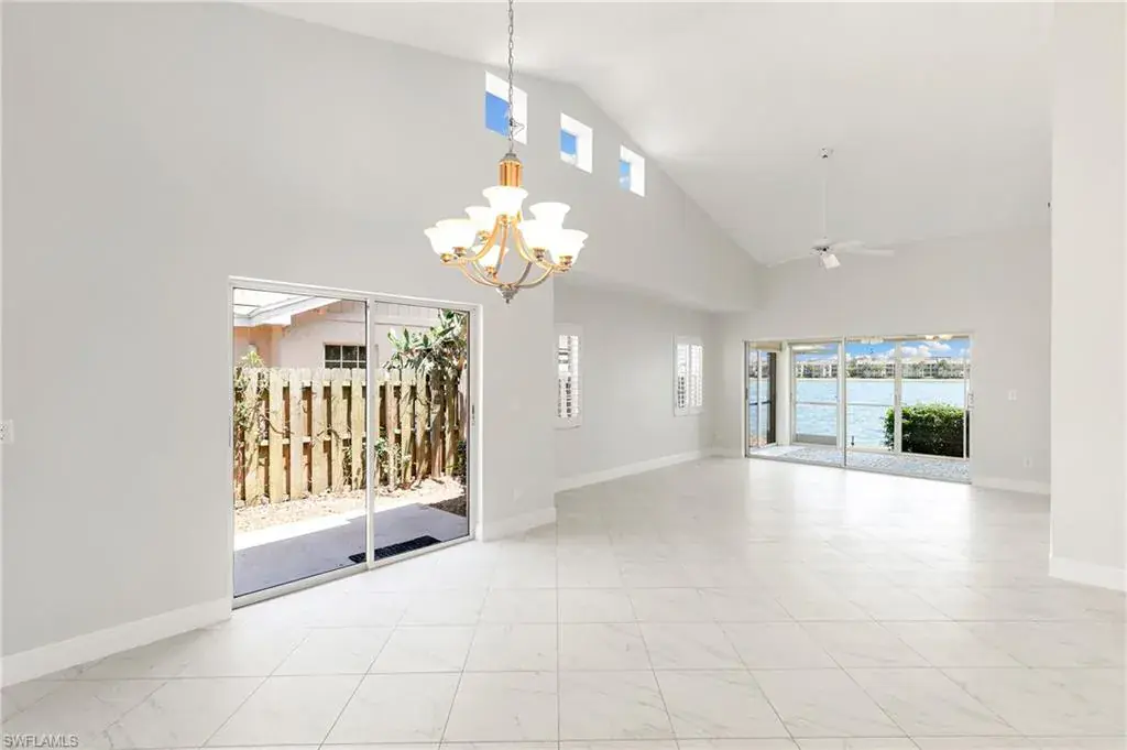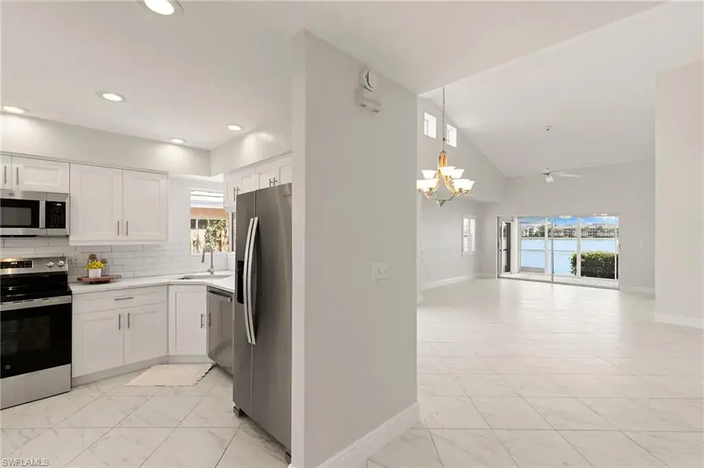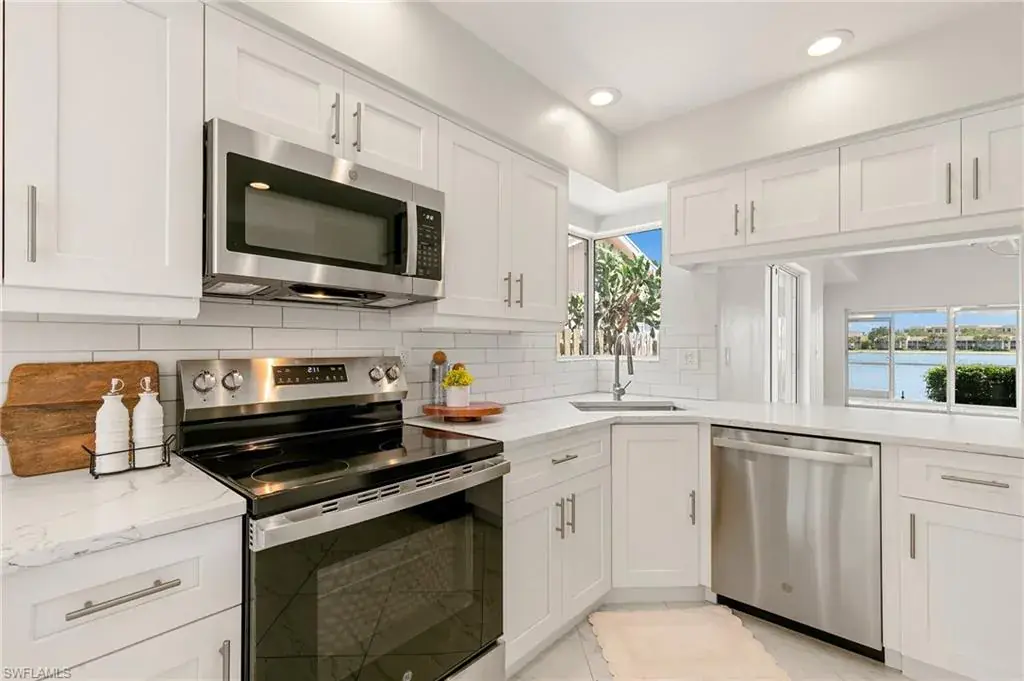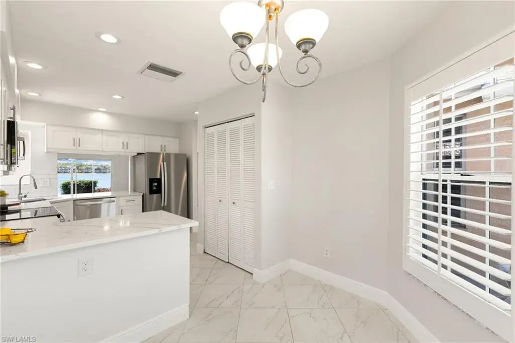 This lakefront villa offers stunning southern views of a 42-acre lake from the kitchen, living room, dining room, and primary bedroom. It’s bright and airy with vaulted ceilings, fresh paint, and a recently renovated kitchen featuring quartz countertops with stainless steel appliances.
