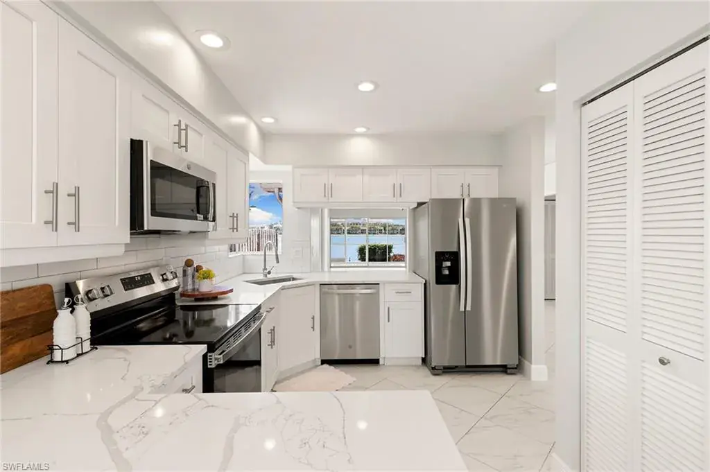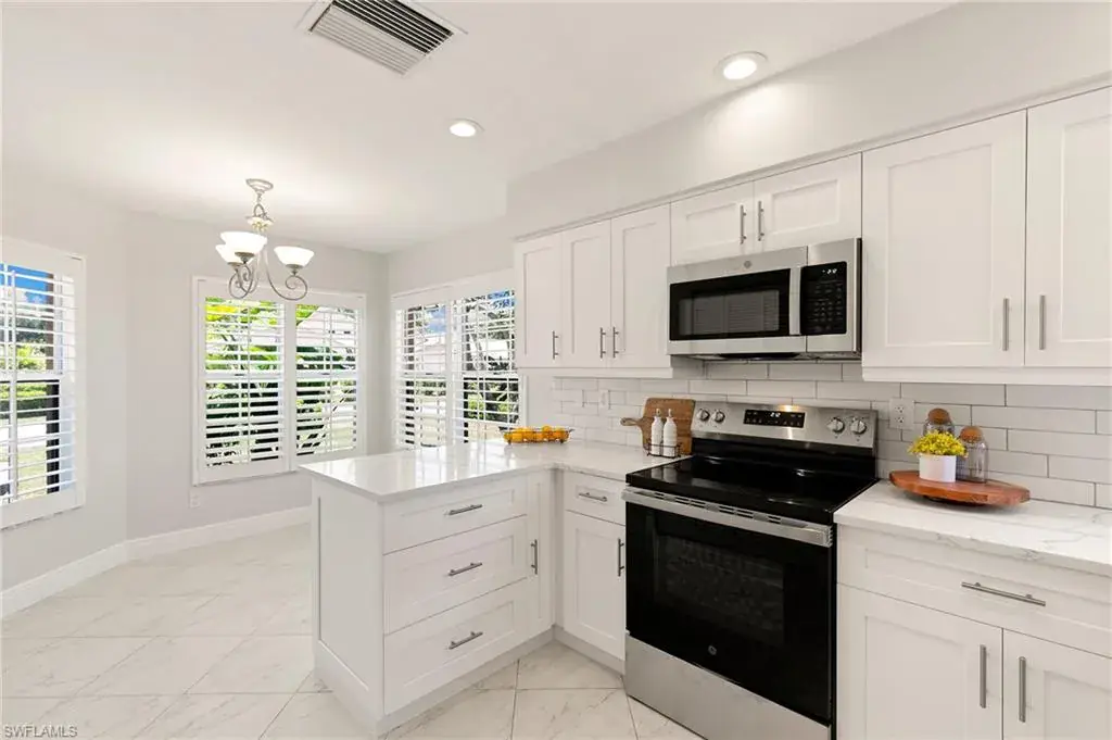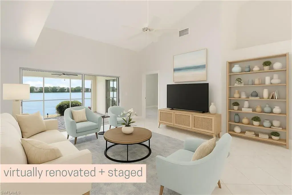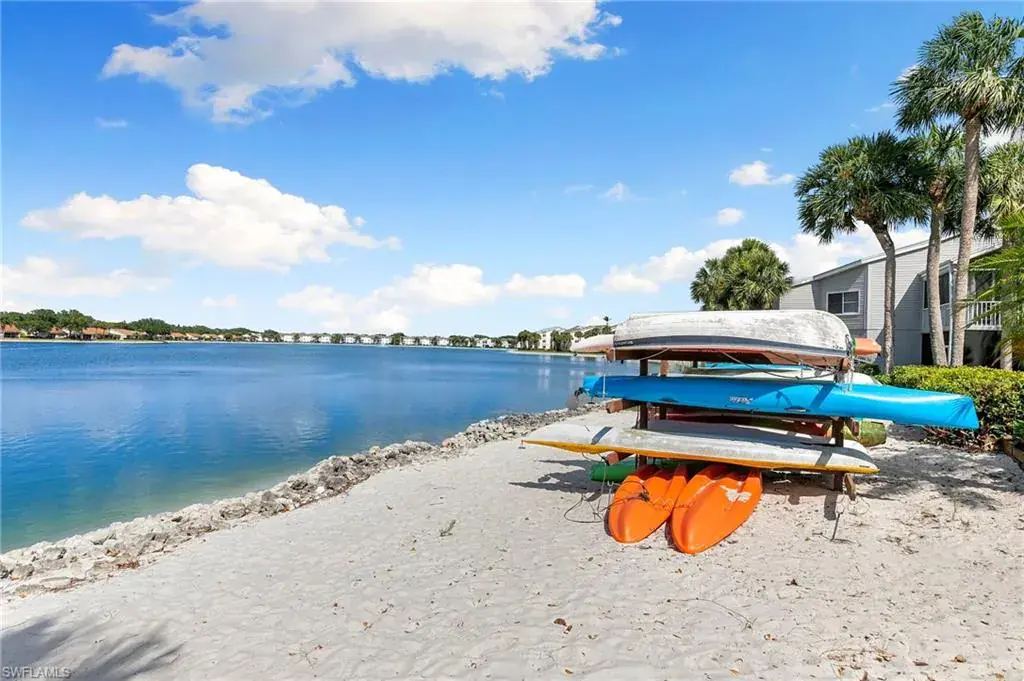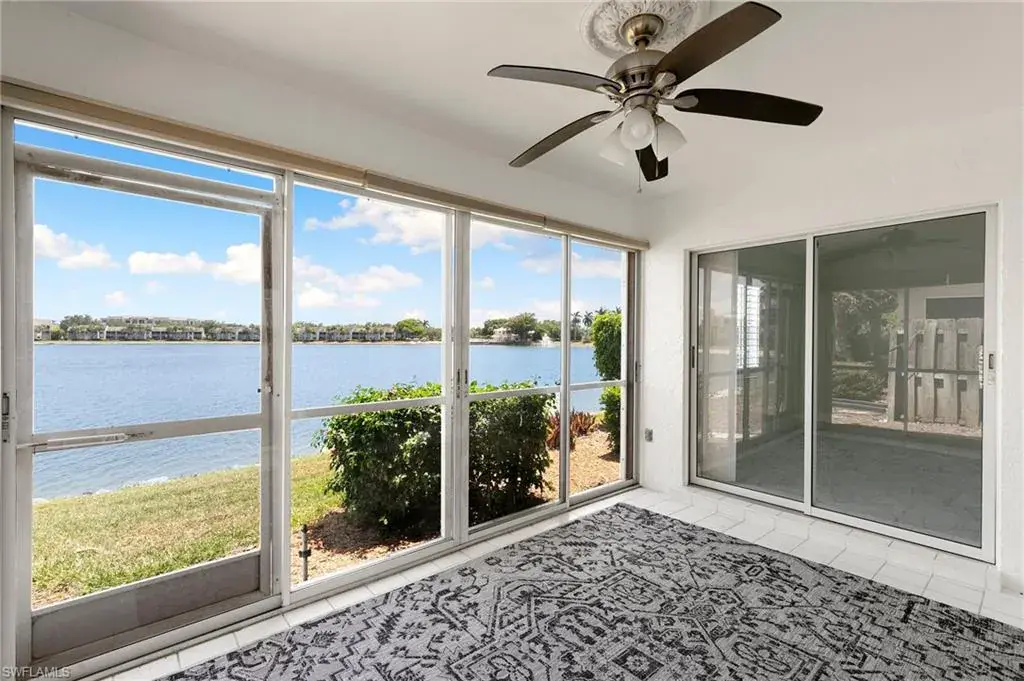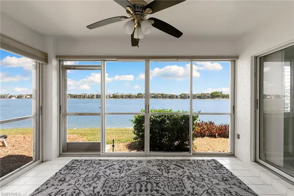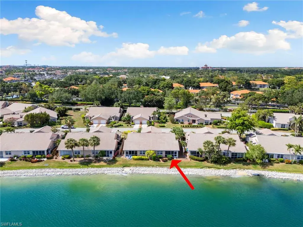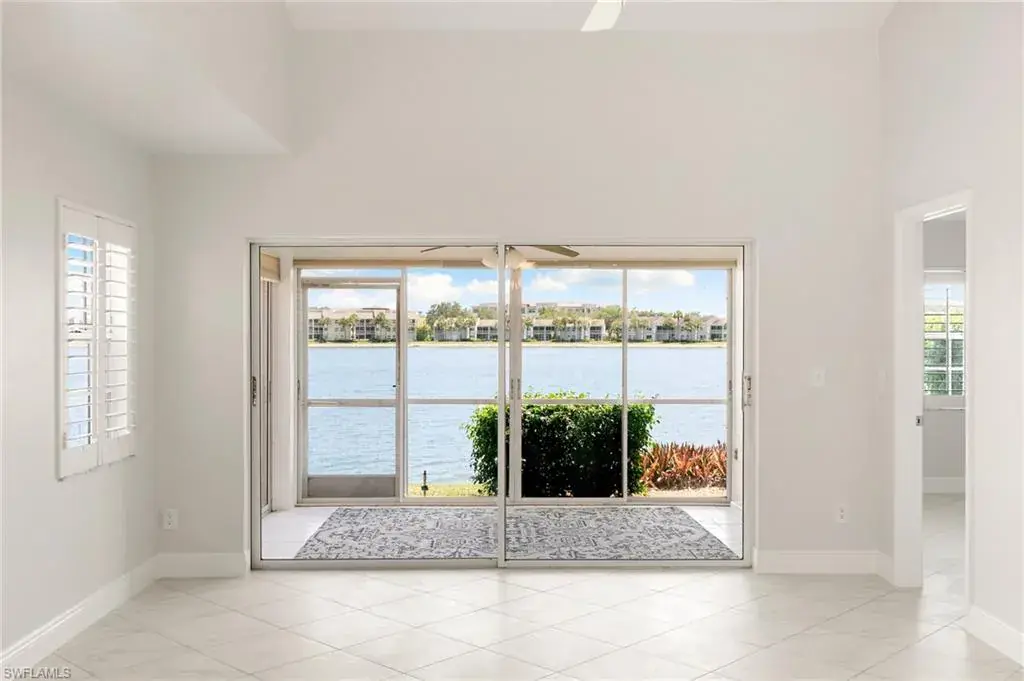 This lakefront villa offers stunning southern views of a 42-acre lake from the kitchen, living room, dining room, and primary bedroom. It’s bright and airy with vaulted ceilings, fresh paint, and a recently renovated kitchen featuring quartz countertops with stainless steel appliances.