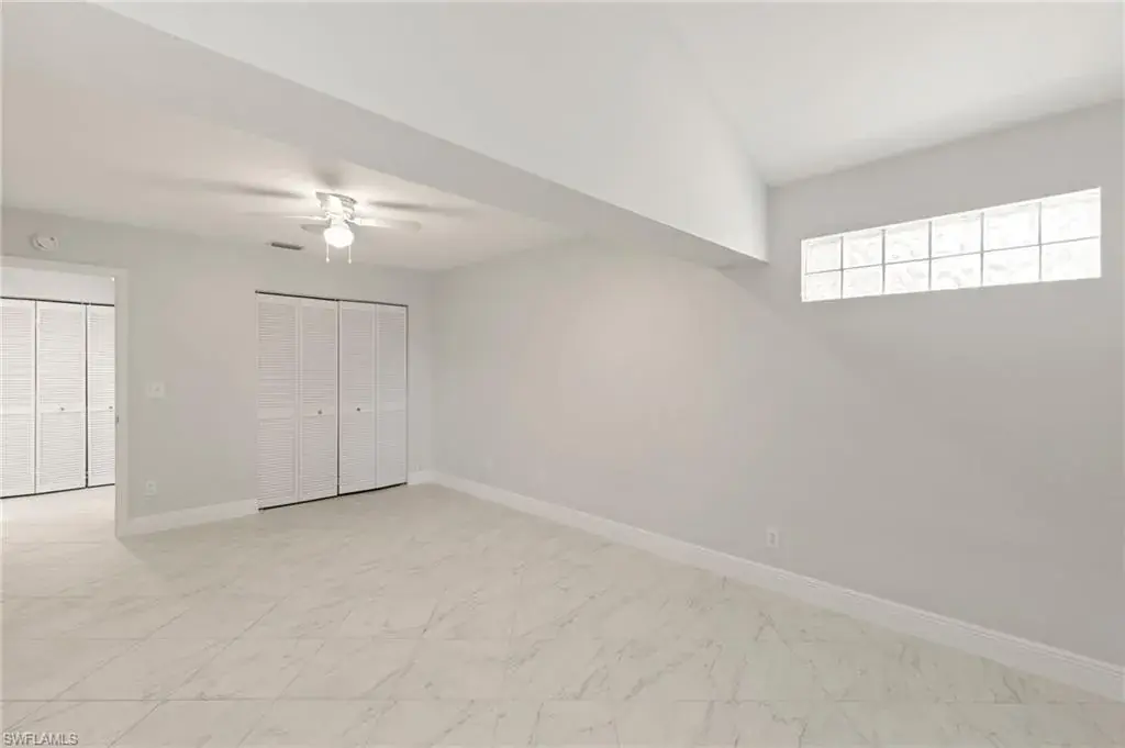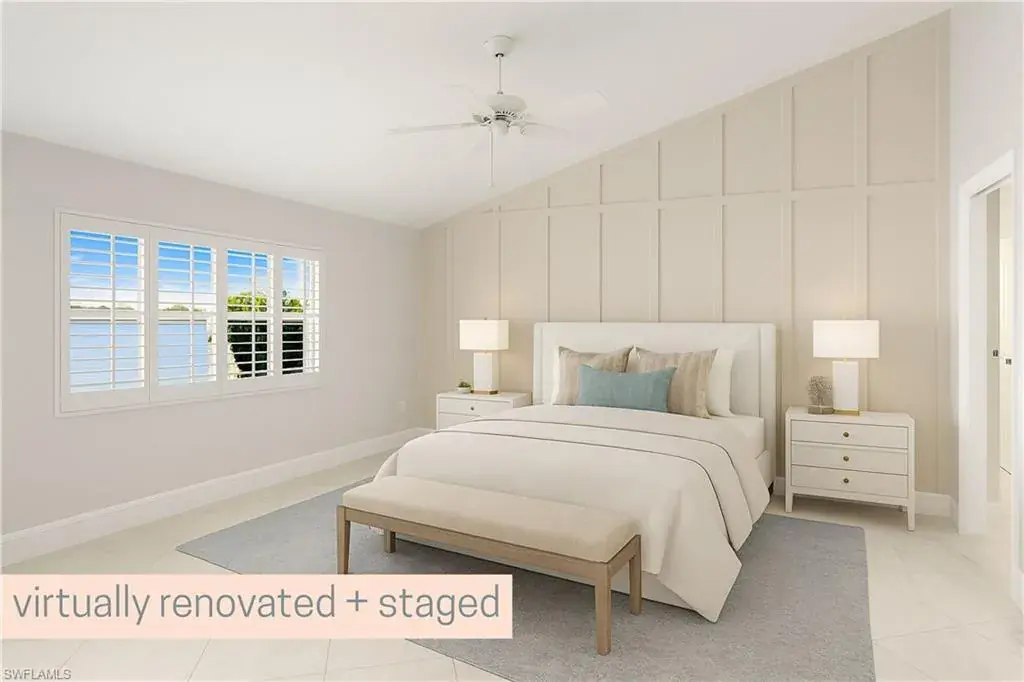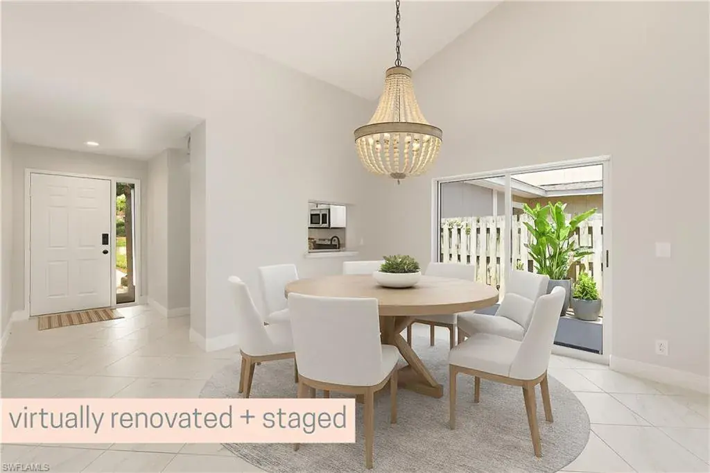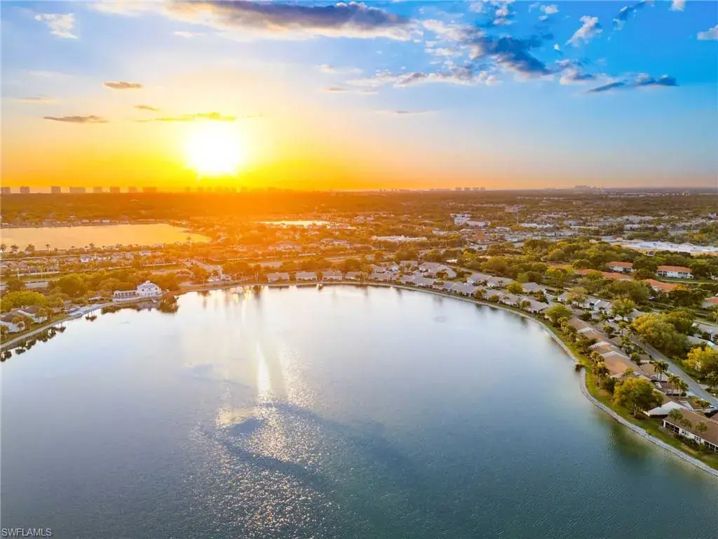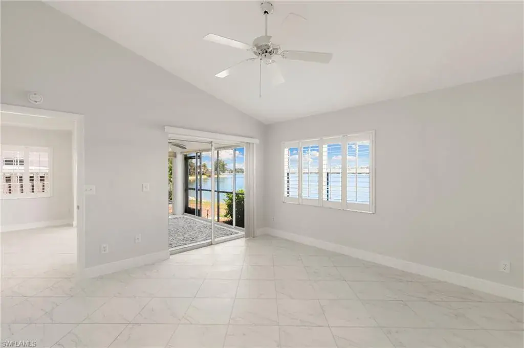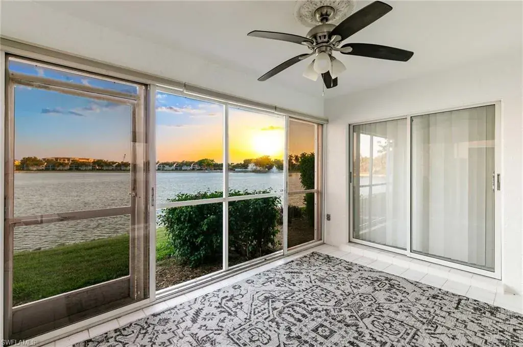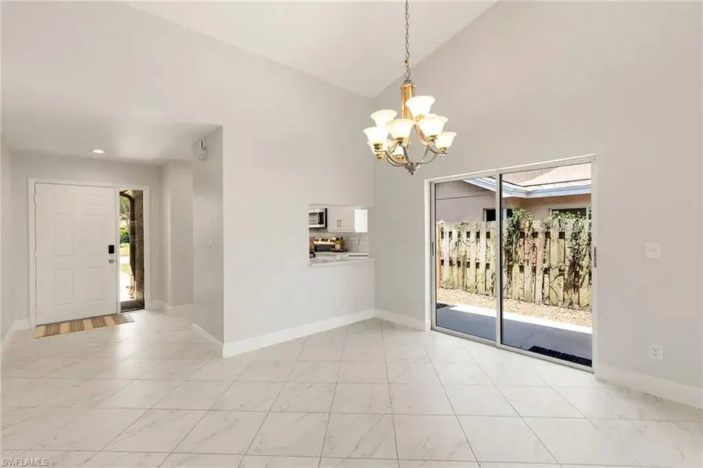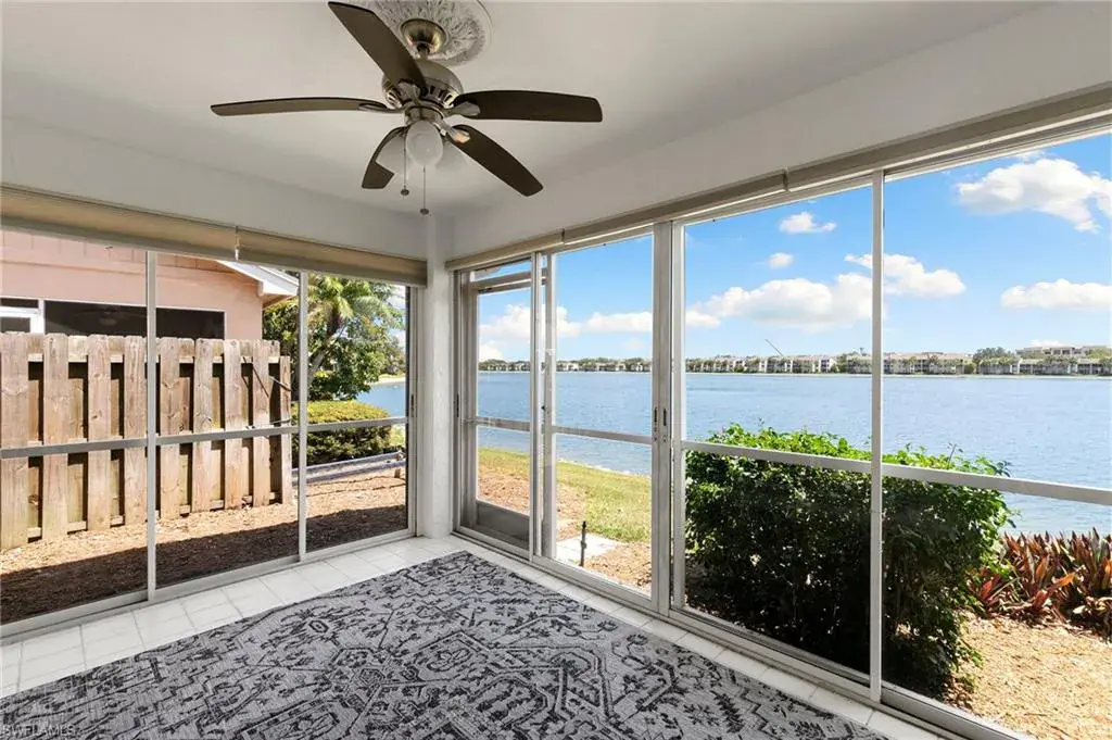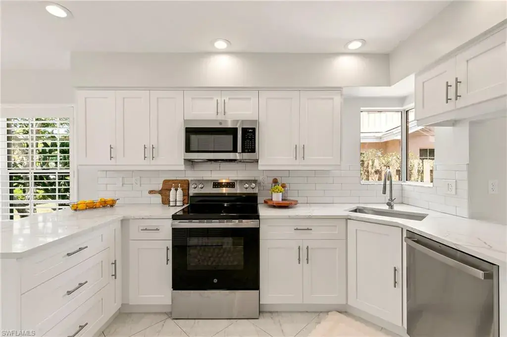 This lakefront villa offers stunning southern views of a 42-acre lake from the kitchen, living room, dining room, and primary bedroom. It’s bright and airy with vaulted ceilings, fresh paint, and a recently renovated kitchen featuring quartz countertops with stainless steel appliances.