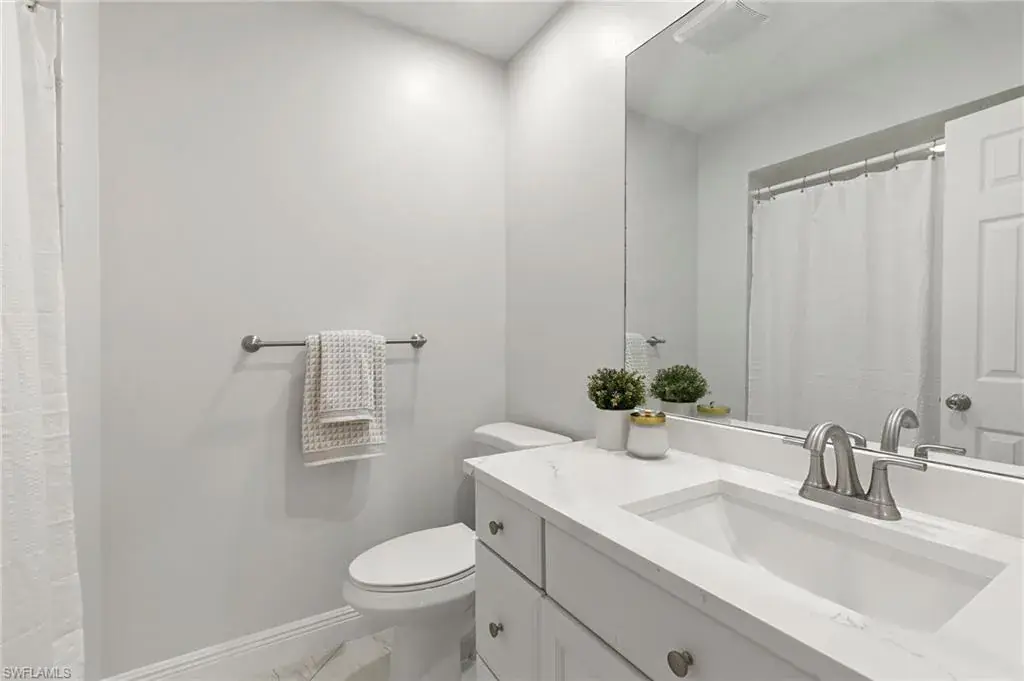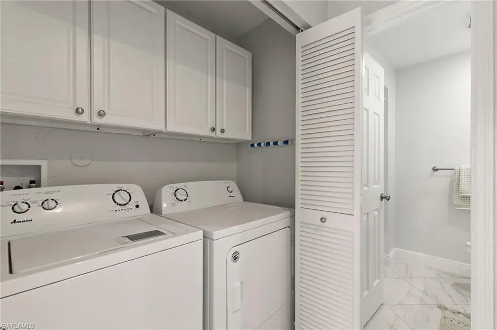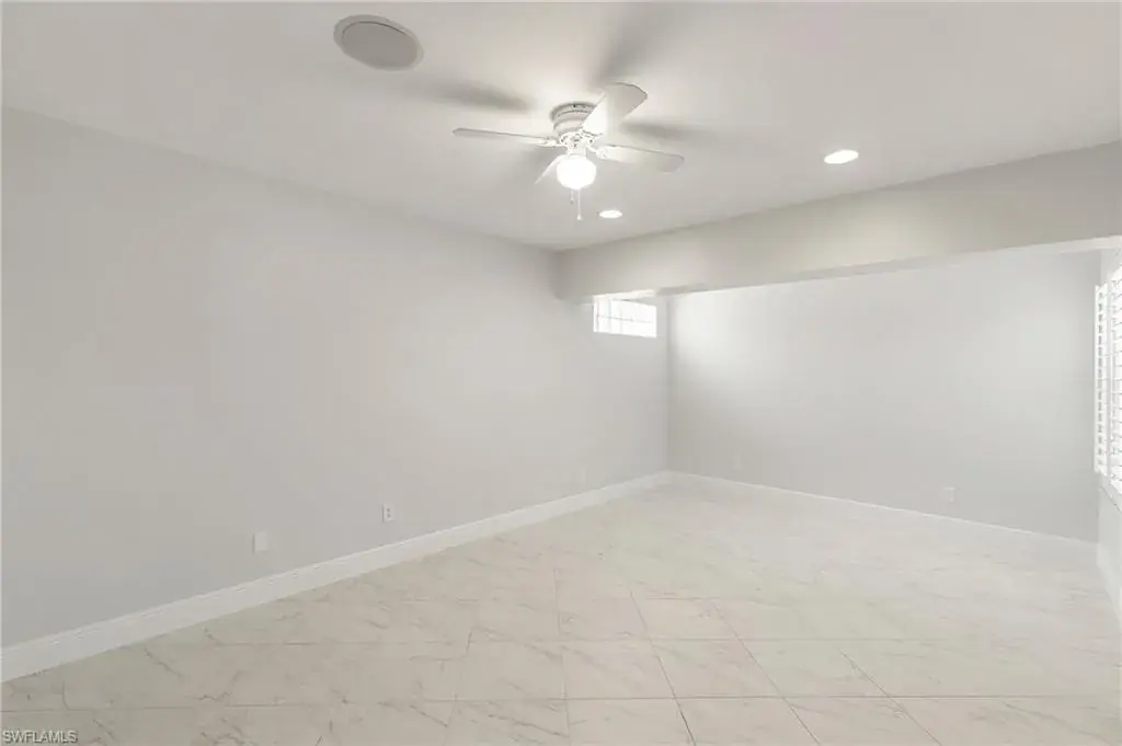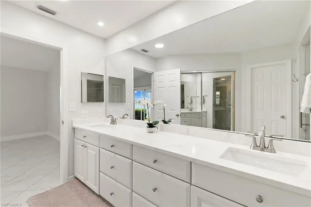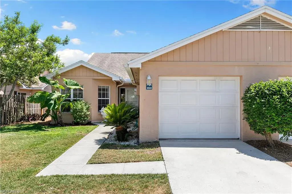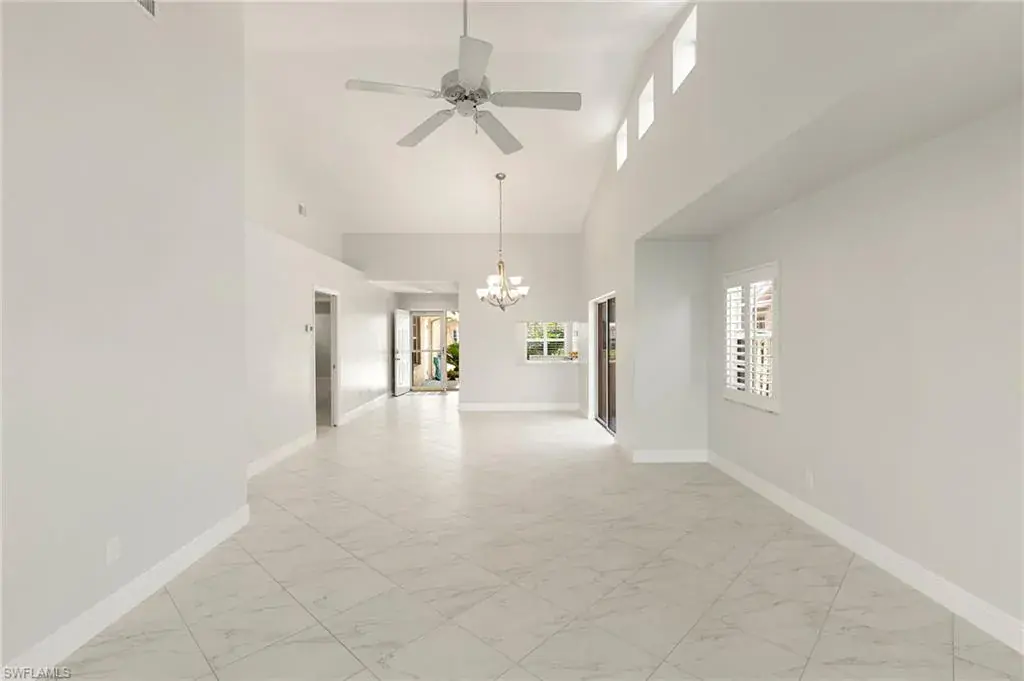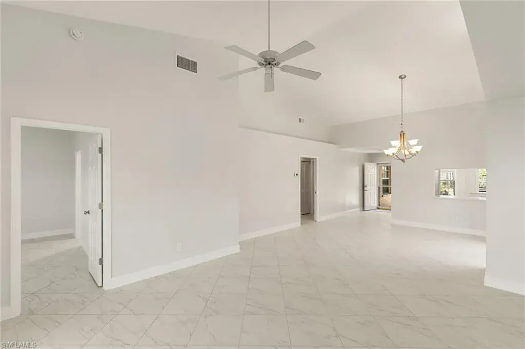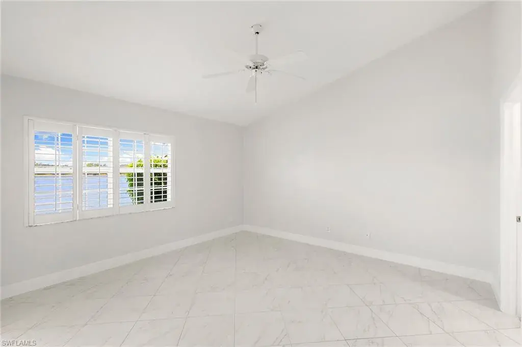 This lakefront villa offers stunning southern views of a 42-acre lake from the kitchen, living room, dining room, and primary bedroom. It’s bright and airy with vaulted ceilings, fresh paint, and a recently renovated kitchen featuring quartz countertops with stainless steel appliances.
