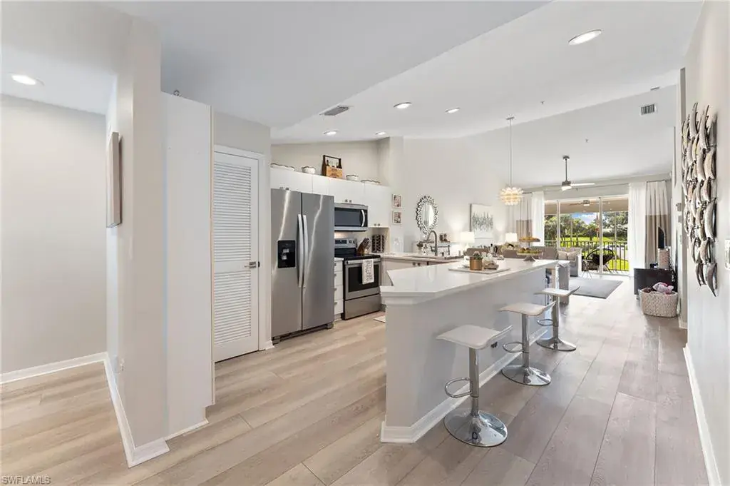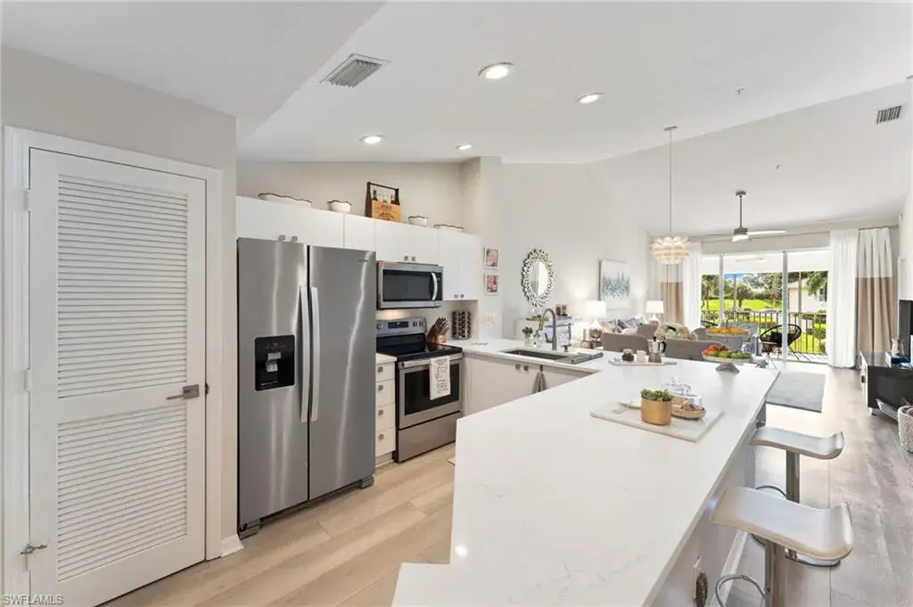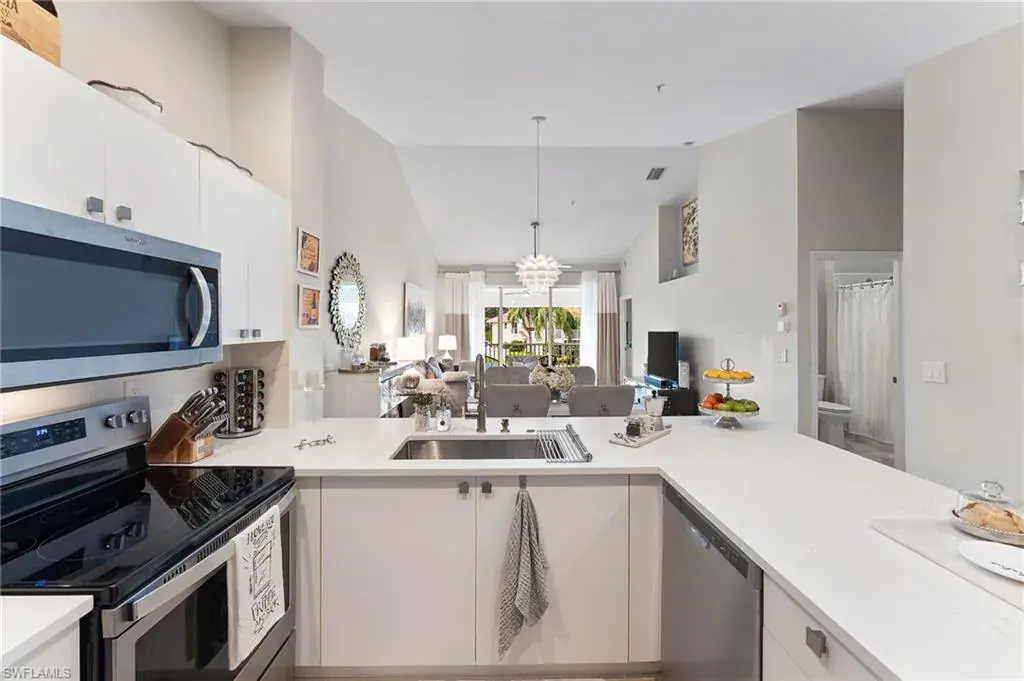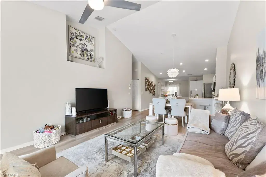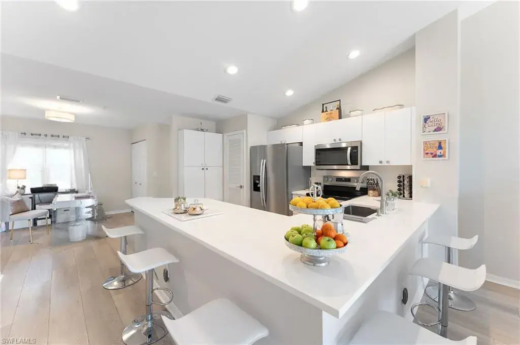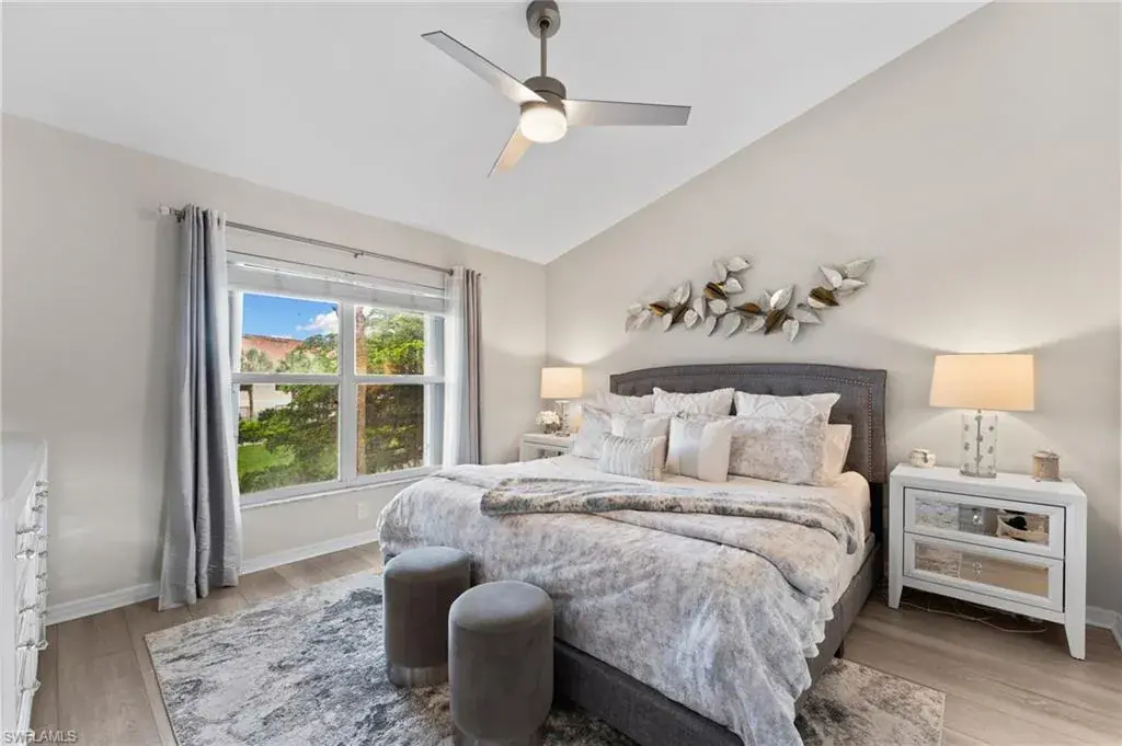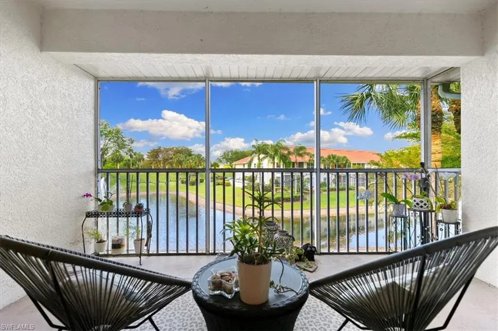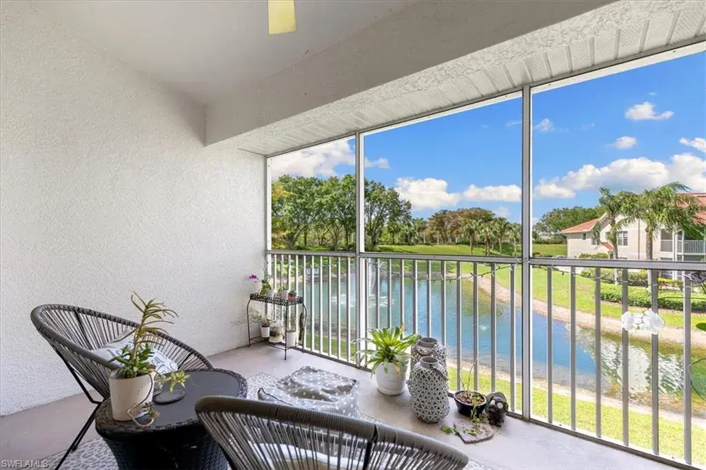 This property has been meticulously maintained and is move-in ready. Enjoy private entry to your unit as this condo offers the seclusion of a multi-level residence with a dedicated entrance foyer and private internal staircase that ascends up to a split bedroom floor plan. The spacious primary suite features a picturesque lake view, walk-in closet, and a double white shaker vanity with granite countertops in the en-suite primary bathroom. The guest bedroom features ample closet space and is adjacent to the guest bathroom that also features white shaker vanity with granite countertops. The soaring 14 foot vaulted ceilings throughout allow for an open and airy feel that lives large. The kitchen gleams with quartz countertops, stainless steel appliances, and plenty of prep space—perfect for everyday living or entertaining guests. Live without worry as this condo features wide width durable LVT flooring throughout, updated light fixtures/dimmers, ring doorbell, and is equipped with hurricane shutters. Enjoy morning coffee or evening wine on your private screened lanai, where peaceful lake views and Naples sunsets become part of your daily rhythm.