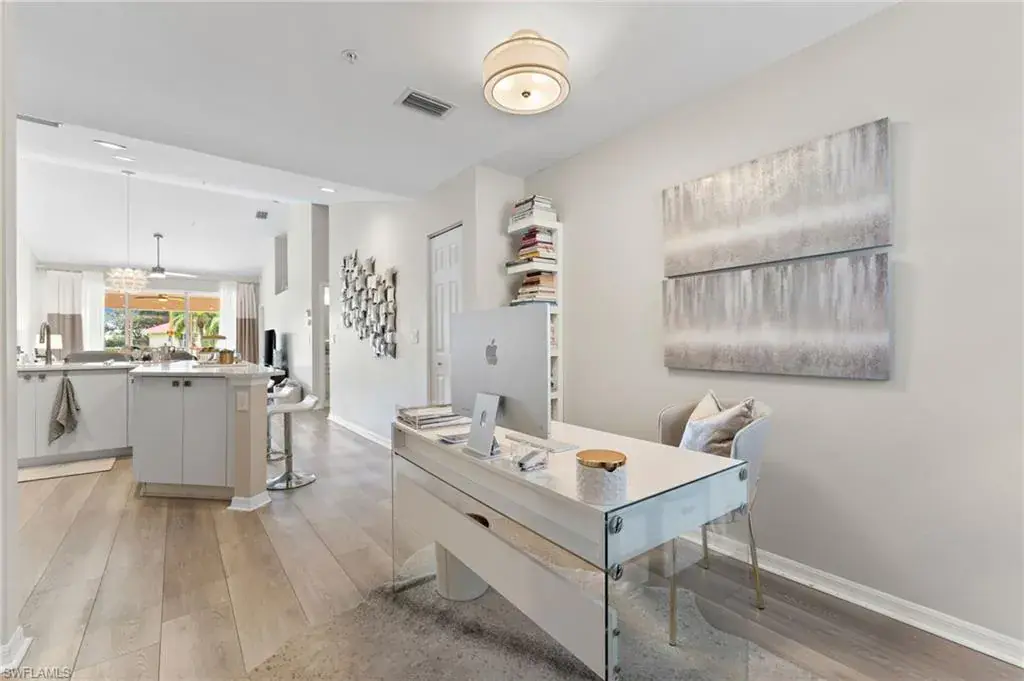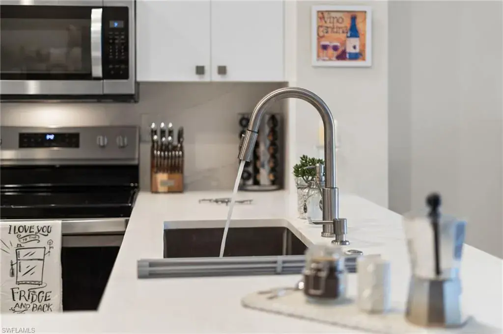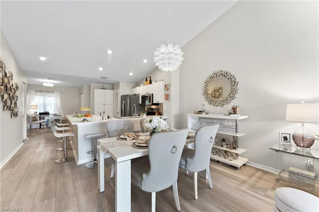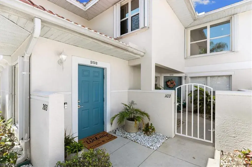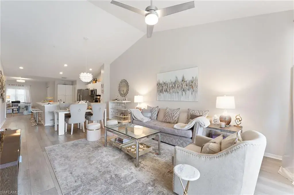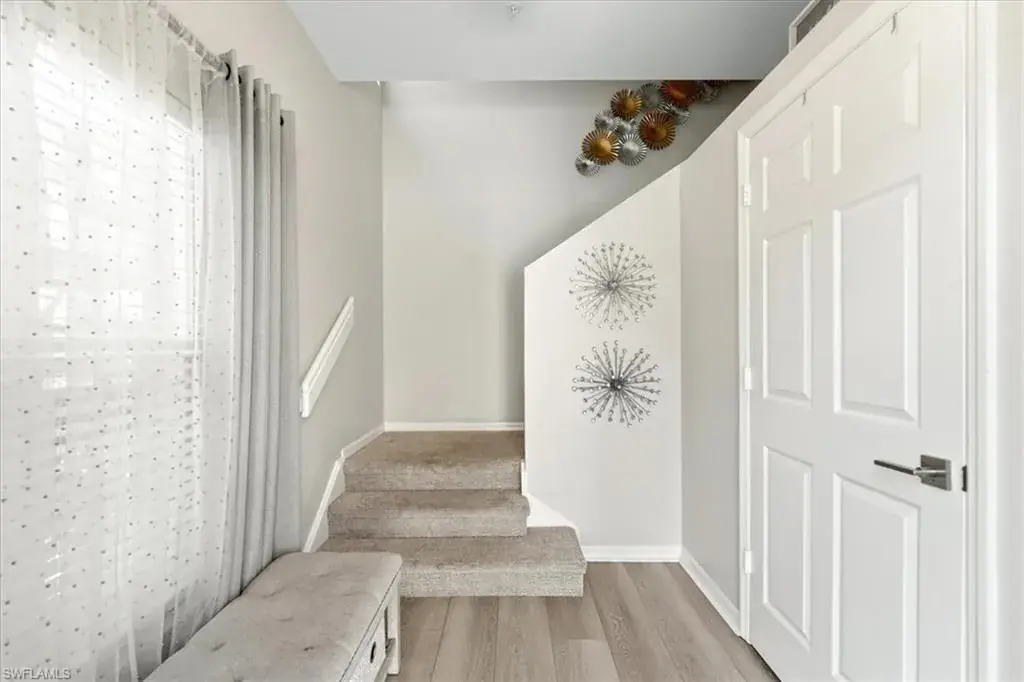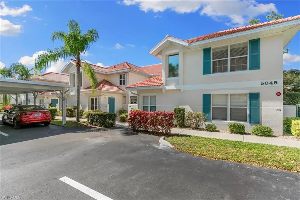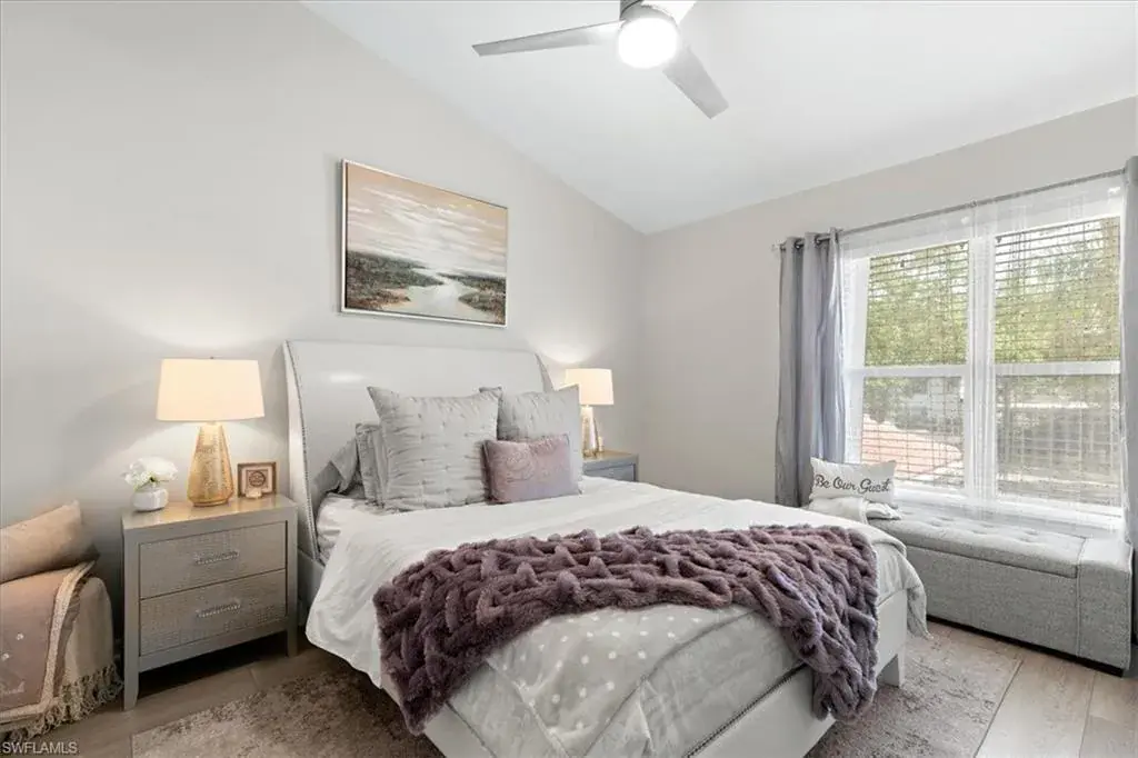 This property has been meticulously maintained and is move-in ready. Enjoy private entry to your unit as this condo offers the seclusion of a multi-level residence with a dedicated entrance foyer and private internal staircase that ascends up to a split bedroom floor plan. The spacious primary suite features a picturesque lake view, walk-in closet, and a double white shaker vanity with granite countertops in the en-suite primary bathroom. The guest bedroom features ample closet space and is adjacent to the guest bathroom that also features white shaker vanity with granite countertops. The soaring 14 foot vaulted ceilings throughout allow for an open and airy feel that lives large. The kitchen gleams with quartz countertops, stainless steel appliances, and plenty of prep space—perfect for everyday living or entertaining guests. Live without worry as this condo features wide width durable LVT flooring throughout, updated light fixtures/dimmers, ring doorbell, and is equipped with hurricane shutters. Enjoy morning coffee or evening wine on your private screened lanai, where peaceful lake views and Naples sunsets become part of your daily rhythm.