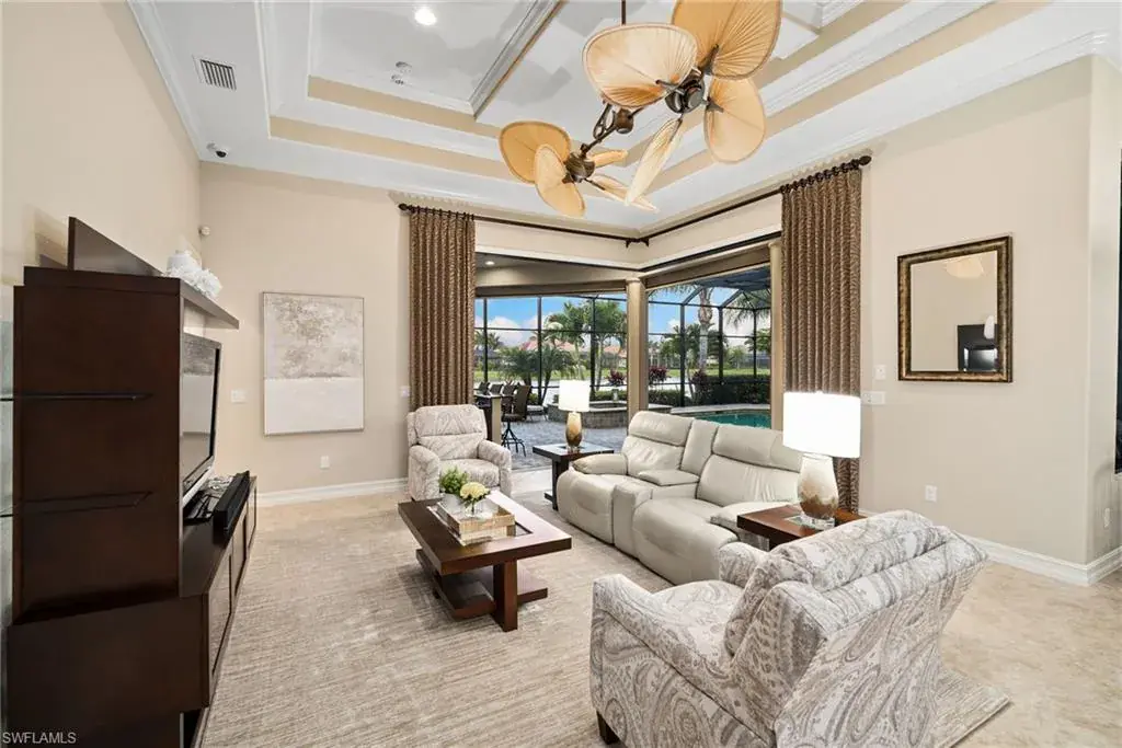 Prestigious Lakoya Rivera II floor plan with upgraded NEW QUARTZ COUNTERTOPS AND BACKSPLASH! This 4 bedroom plus den, 4.5 baths boasts 3,236 Sq. Ft., where each bedroom features its own ensuite bathroom! The moment you step into the stunning oversized foyer it opens up the home to the main living area and the covered lanai. You and your guests will enjoy plenty of space for entertaining inside and out! Loaded with upgrades, features natural gas, impact glass, retractable hurricane and clear screens on the lanai, tankless hot water heater, two new A/C systems, to include an A/C system in the garage! Enjoy your outdoor oasis that includes a fantastic outdoor grill and bar area with the custom pool, spa and plenty of covered lanai! All this and the immediate membership to the Players Club and Spa! Three resort pools to include a lap pool, full service spa, fitness, bocce, pickleball, tennis, tiki bar and indoor restaurant. Optional Private golf at The Classics and 2 public golf courses, the Mustand and Flamingo! Start living your best life today!