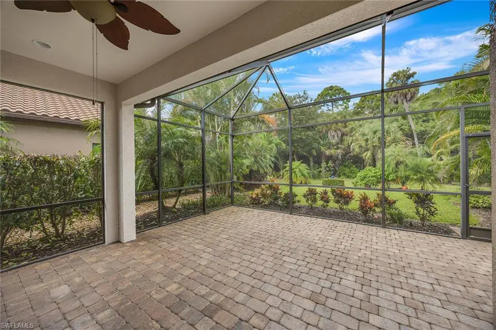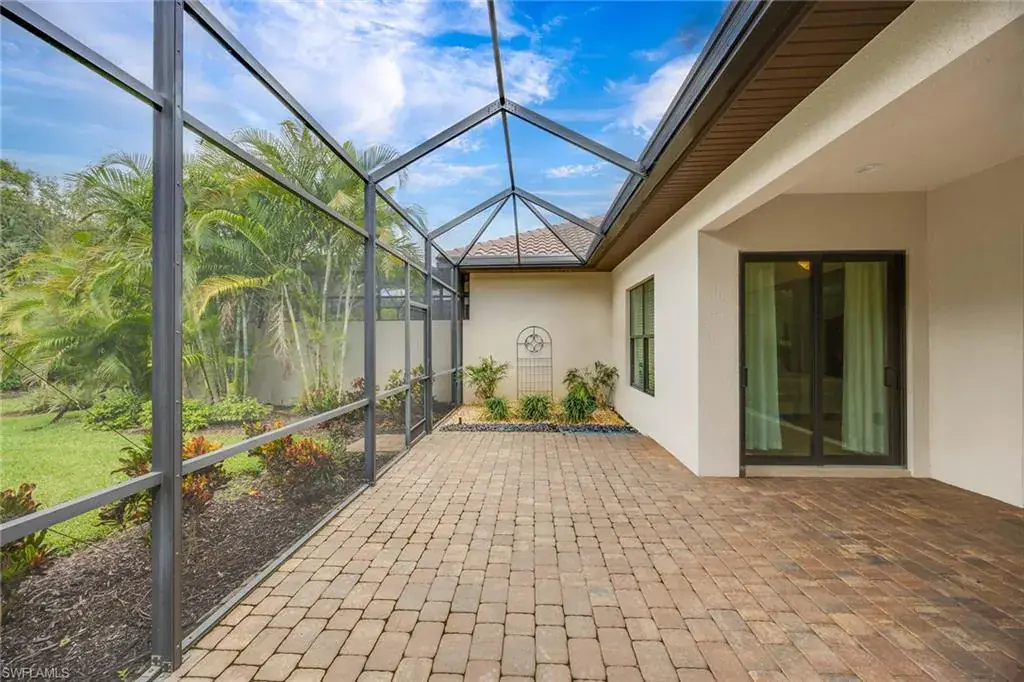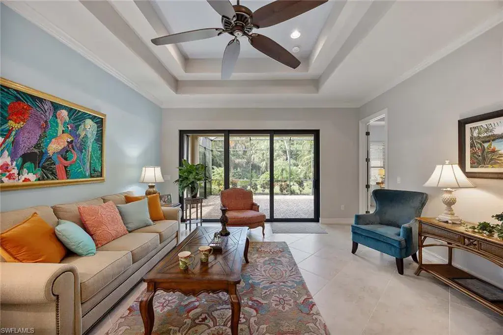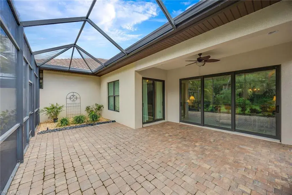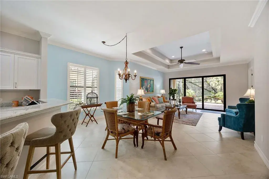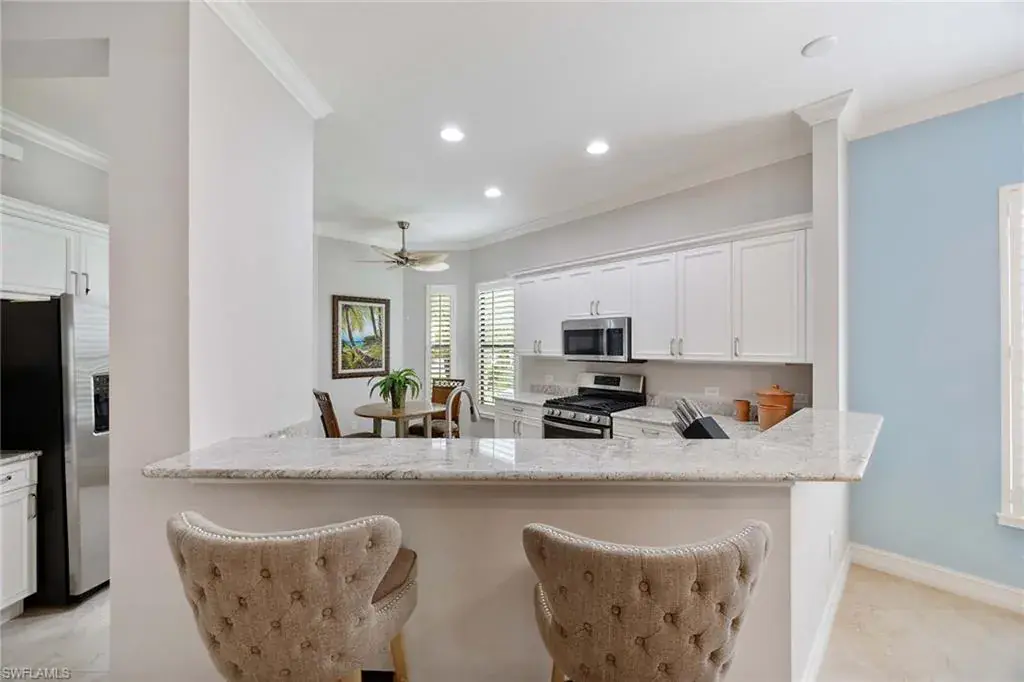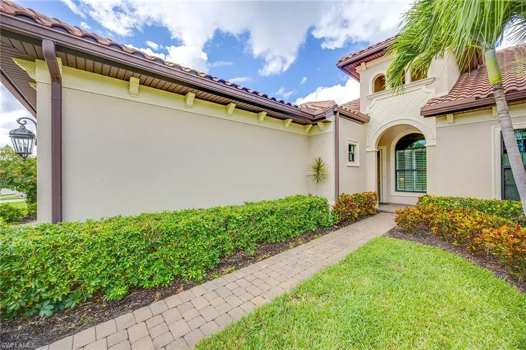 Experience the quiet serenity of this beautifully upgraded Napoli Villa by Stock Development, in the exclusive gated community of Lakoya at Lely Resort. Offering over 1,882 square feet of refined living space, this three-bedroom, two-bath home combines timeless elegance with modern comforts. Enjoy the convenience and security of natural gas, impact-resistant windows and doors, and a whole-home generator. The spacious layout includes a generous main suite, formal and casual dining areas, and a contemporary kitchen featuring upgraded white cabinetry with soft-close drawers, granite countertops and stainless steel appliances. Thoughtful design details throughout the home include a soaring 12-foot double tray ceiling in the main living area, crown molding, plantation shutters, eight-foot interior doors, elegant lighting fixtures and ceiling fans. Flooring includes diagonally set tile in the main living areas and rich wood floors in the second and third bedrooms. Go outside to an extended lanai, ideal for entertaining guests, with ample space to add a pool and spa if desired. Residents of Lakoya enjoy exclusive access to the award-winning Players Club & Spa at Lely Resort, offering 13 tennis courts, pickleball and bocce ball courts, two resort-style pools, a lap pool, full-service spa, state-of-the-art fitness center, and indoor and outdoor dining, including a lively tiki bar. Golf enthusiasts can take advantage of two public courses or opt for private membership at the prestigious Classics Golf and Country Club. This exceptional home offers a blend of luxury, comfort and lifestyle in one of Naples sought-after communities.