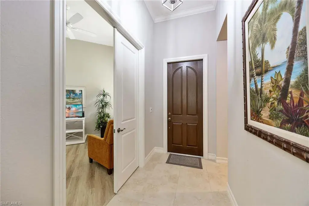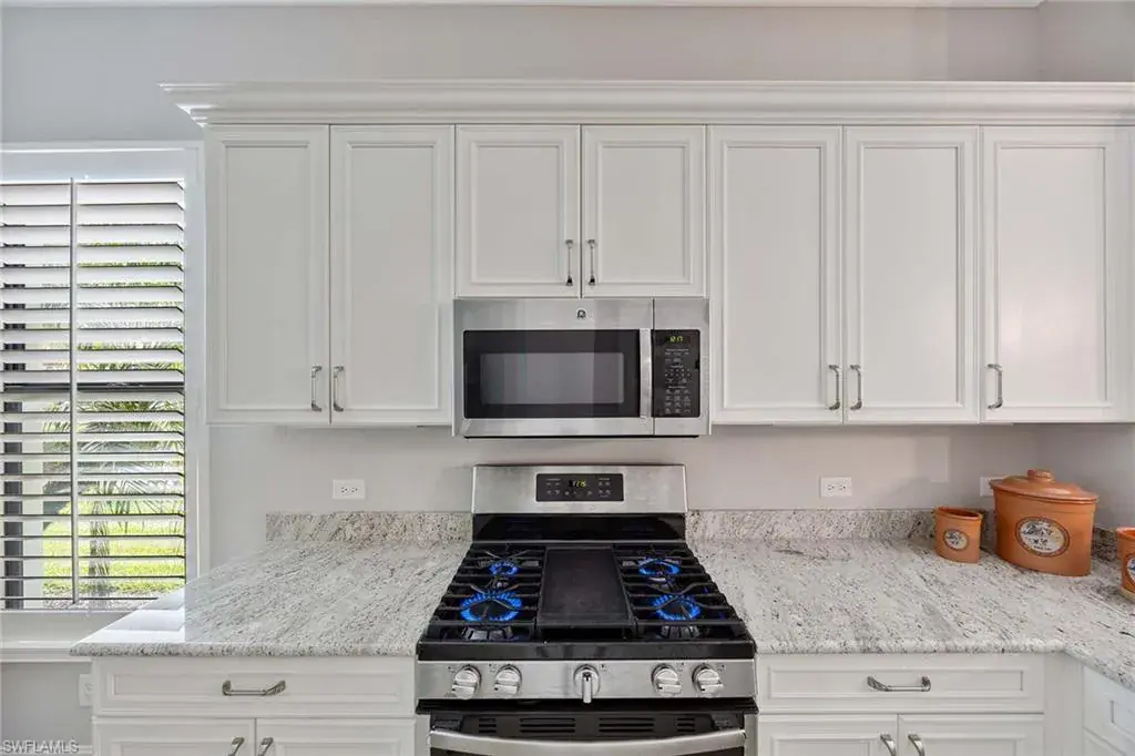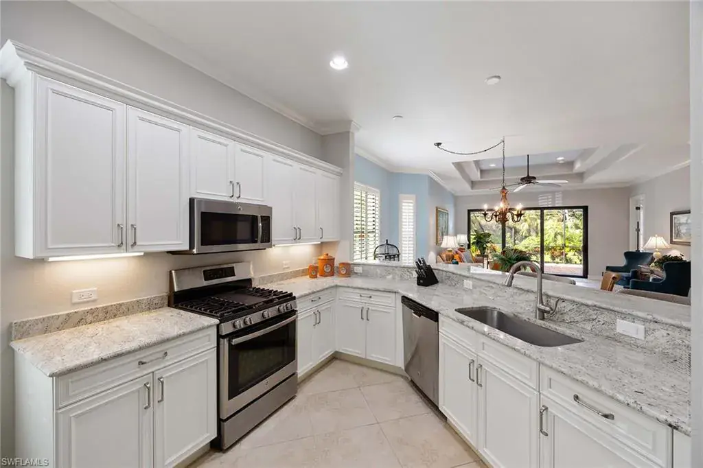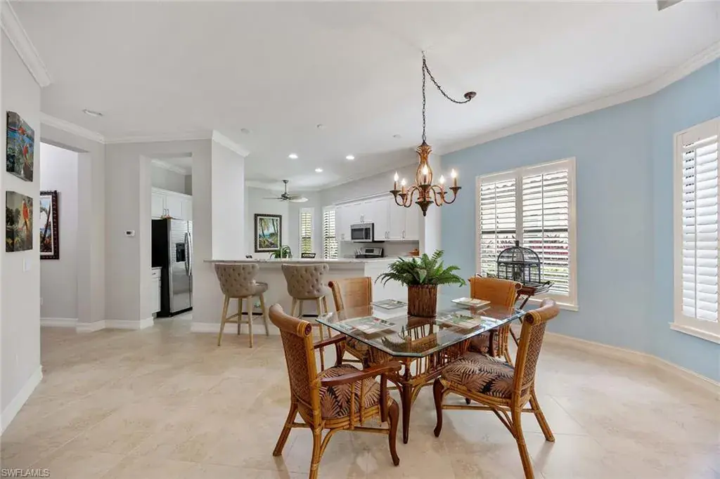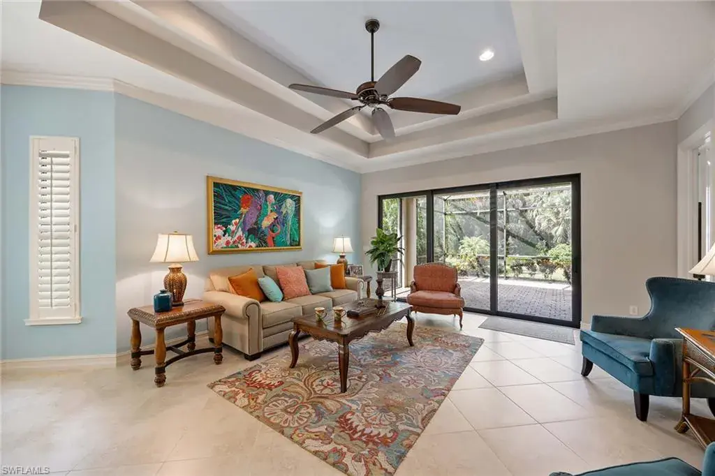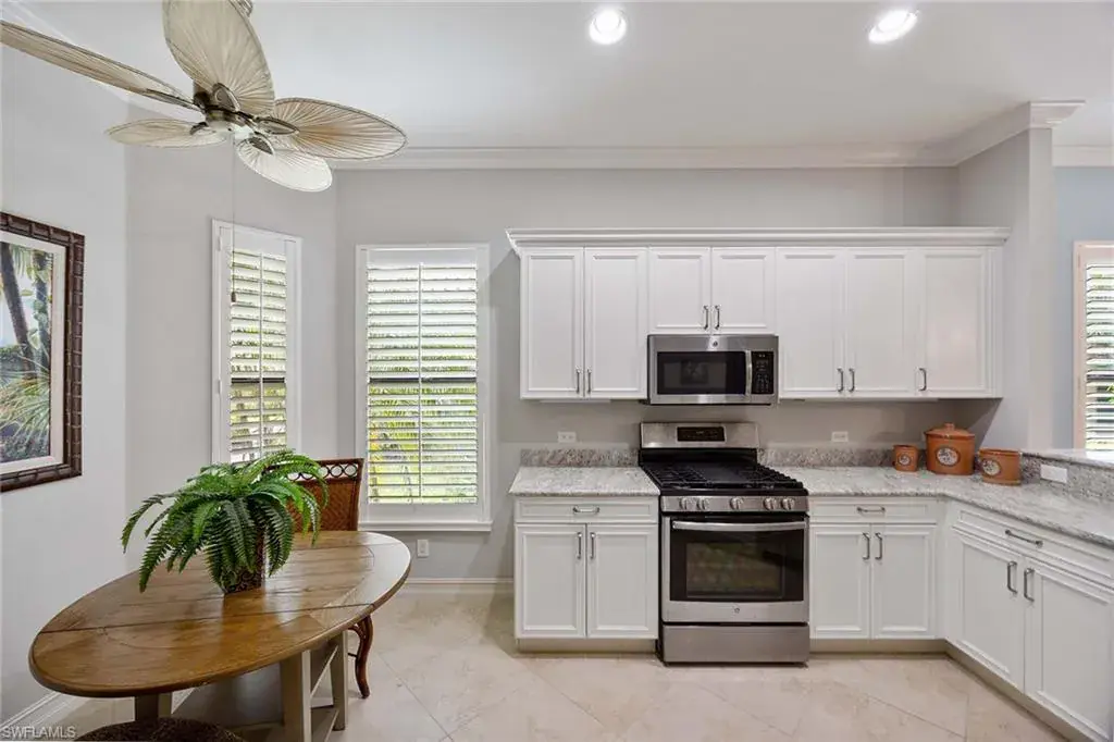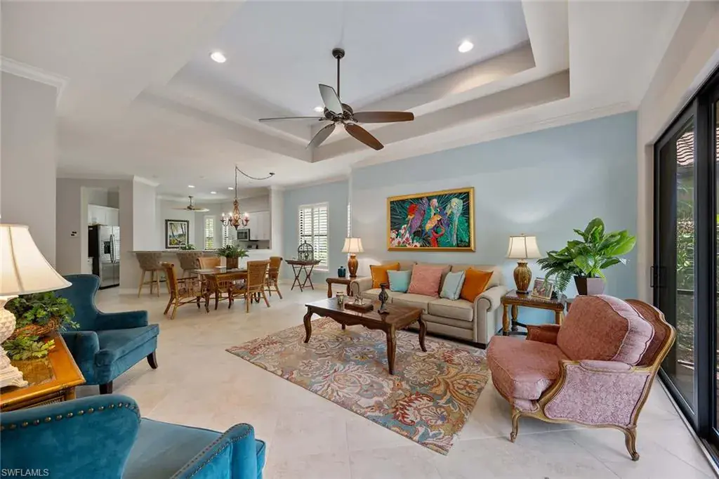 Experience the quiet serenity of this beautifully upgraded Napoli Villa by Stock Development, in the exclusive gated community of Lakoya at Lely Resort. Offering over 1,882 square feet of refined living space, this three-bedroom, two-bath home combines timeless elegance with modern comforts. Enjoy the convenience and security of natural gas, impact-resistant windows and doors, and a whole-home generator. The spacious layout includes a generous main suite, formal and casual dining areas, and a contemporary kitchen featuring upgraded white cabinetry with soft-close drawers, granite countertops and stainless steel appliances. Thoughtful design details throughout the home include a soaring 12-foot double tray ceiling in the main living area, crown molding, plantation shutters, eight-foot interior doors, elegant lighting fixtures and ceiling fans. Flooring includes diagonally set tile in the main living areas and rich wood floors in the second and third bedrooms. Go outside to an extended lanai, ideal for entertaining guests, with ample space to add a pool and spa if desired. Residents of Lakoya enjoy exclusive access to the award-winning Players Club & Spa at Lely Resort, offering 13 tennis courts, pickleball and bocce ball courts, two resort-style pools, a lap pool, full-service spa, state-of-the-art fitness center, and indoor and outdoor dining, including a lively tiki bar. Golf enthusiasts can take advantage of two public courses or opt for private membership at the prestigious Classics Golf and Country Club. This exceptional home offers a blend of luxury, comfort and lifestyle in one of Naples sought-after communities.