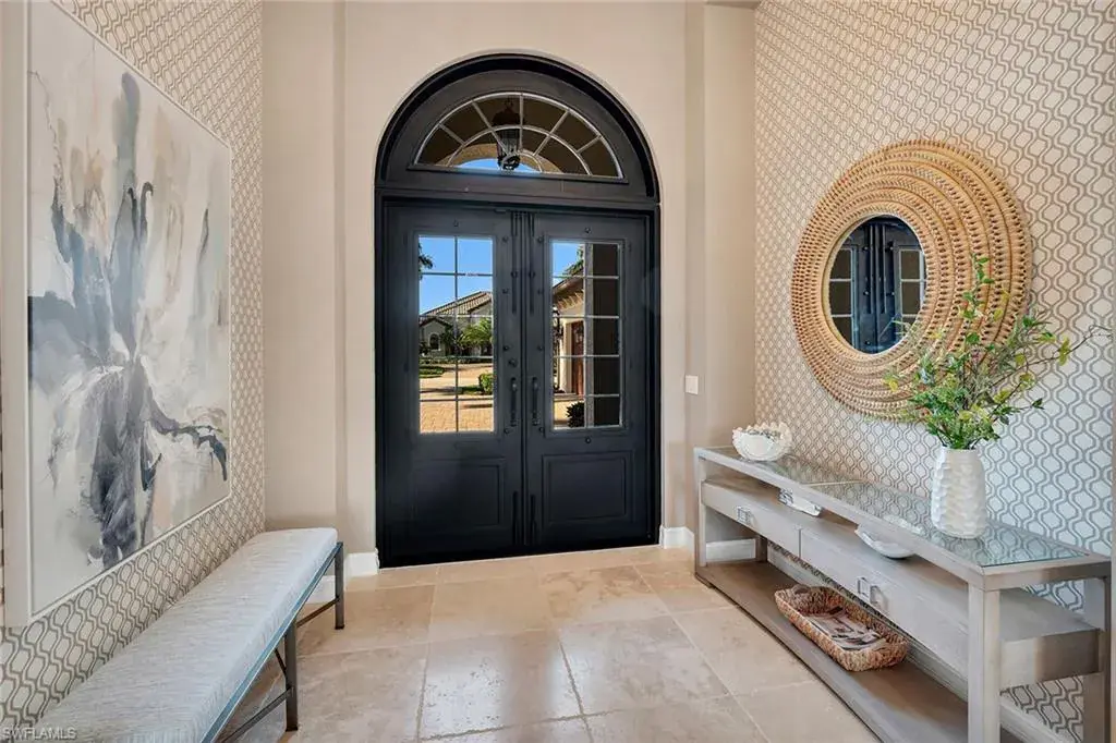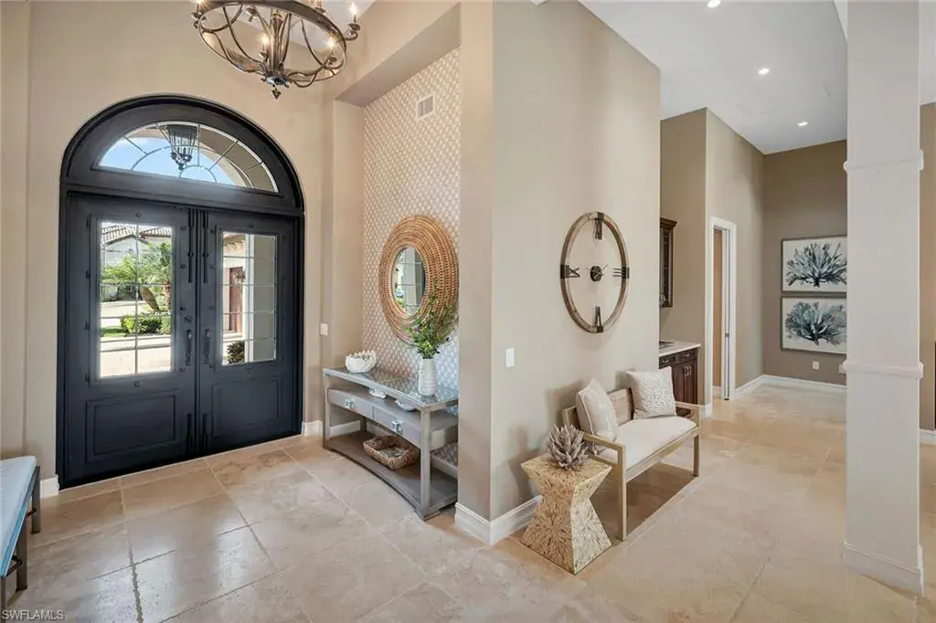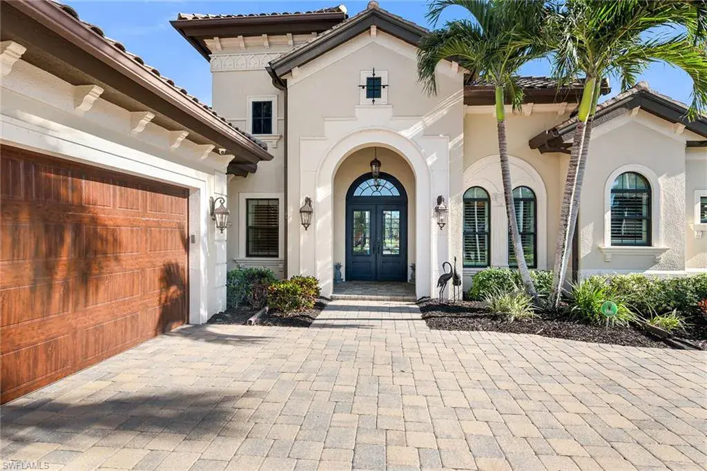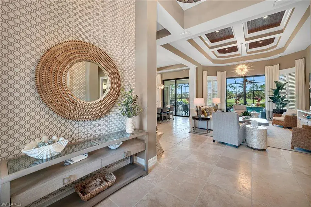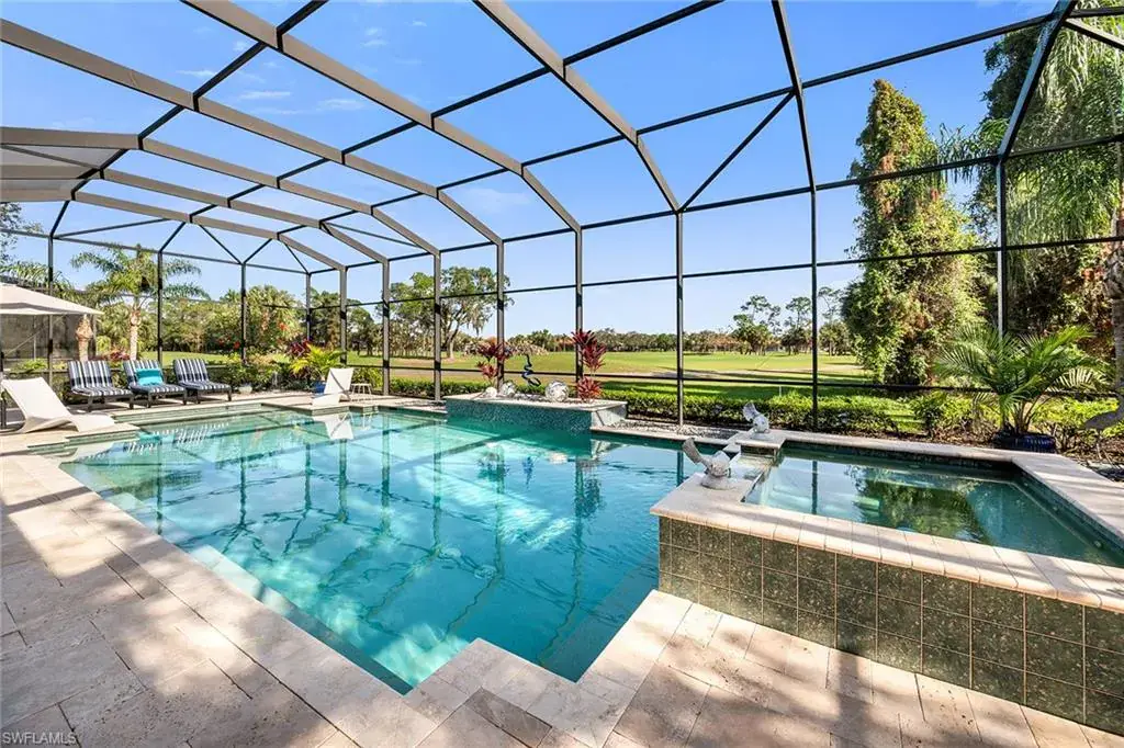 This exceptional single-family home offers a perfect blend of luxury, privacy, and serene golf course views. Situated on an oversized lot with southeast exposure, this Stock-built Scottsdale II floor plan spans 2,739 square feet of living space, featuring three bedrooms, a den, three bathrooms, and a spacious three-car garage. The split-bedroom layout ensures privacy, while the open-concept design highlights seamless indoor and outdoor living. The oversized lanai, with travertine flooring and a screened enclosure, is ideal for relaxing or entertaining. Enjoy tranquil views of the heated pool and spa, complete with a sun lounge area, water feature, newer pool pump, and electric shutters. The outdoor kitchen boasts a built-in gas grill, two mini-fridges, a sink, marble countertops, and a mosaic tile backsplash. Impact doors and windows enhance the home’s durability and security. Inside, the home is equally impressive, with volume ceilings, fresh paint, tray ceilings, travertine tile flooring, plantation shutters, new light fixtures, a Sonos speaker system, central vacuum, a generator, and a security system. Designer furnishings are negotiable. The kitchen is a chef’s dream, with shaker-style cabinets, quartz countertops, a mosaic tile backsplash, under-cabinet lighting, a walk-in pantry, and GE stainless steel appliances, including a gas stove with a paneled hood. Adjacent to the kitchen, the breakfast corner offers a built-in coffee bar, wine storage, and a cooler, along with access to the lanai. The great room, featuring a custom shiplap-paneled wall and coffered tray ceiling, opens to the lanai through glass sliders. The adjacent dining area, complete with a dry bar and lanai access, adds to the home’s entertainment appeal. The owner’s suite is a true retreat with wood flooring, a bay window overlooking the golf course, lanai access, two walk-in closets with built-ins, and a spa-like en-suite bath with dual vanities, a soaking tub, a walk-in shower with multiple shower heads, and a linen closet. Two guest bedrooms with crown molding offer comfort and privacy, with one bathroom featuring a shower/tub combo and the third bathroom serving as a pool bath with a walk-in shower and glass enclosure. The den or office, accessed through elegant glass French doors, provides a quiet workspace or study area. The laundry room includes cabinets, a utility sink, and GE washer and dryer. The oversized garage features epoxy flooring, windows, and a storage closet. Located in Lakoya within Lely Resort, this home offers immediate membership to The Players Club & Spa, with access to three resort pools, tennis, pickleball, bocce, a fitness center, a full-service spa, and both fine and casual dining. Golf enthusiasts can enjoy private access to The Classics course and two public courses, the Mustang and Flamingo. This home is the ultimate Florida lifestyle retreat.
