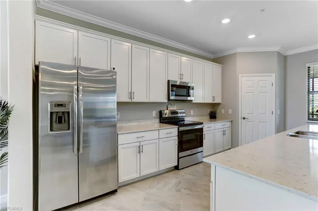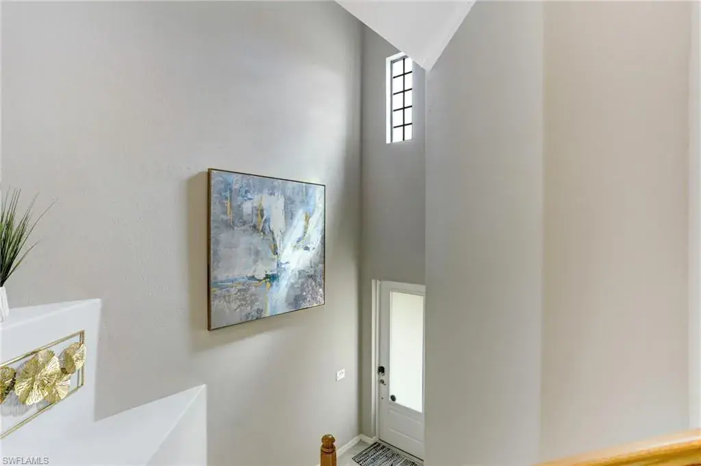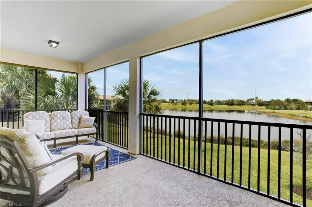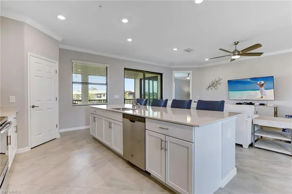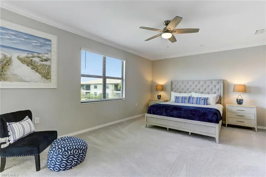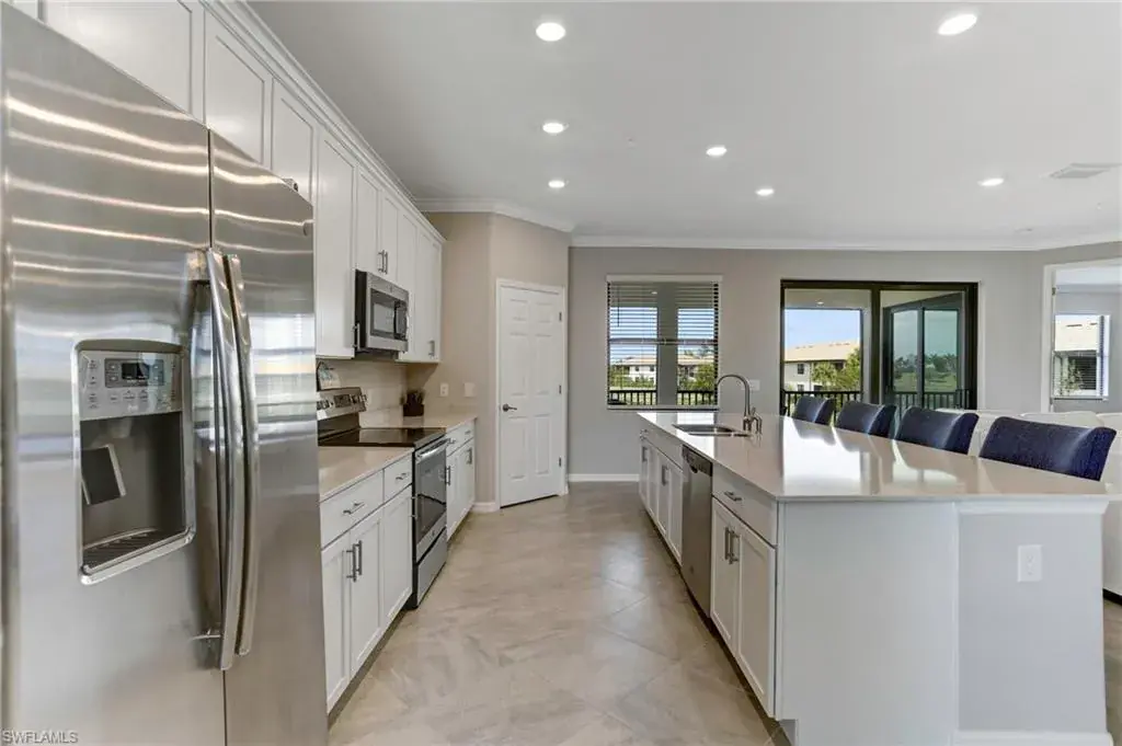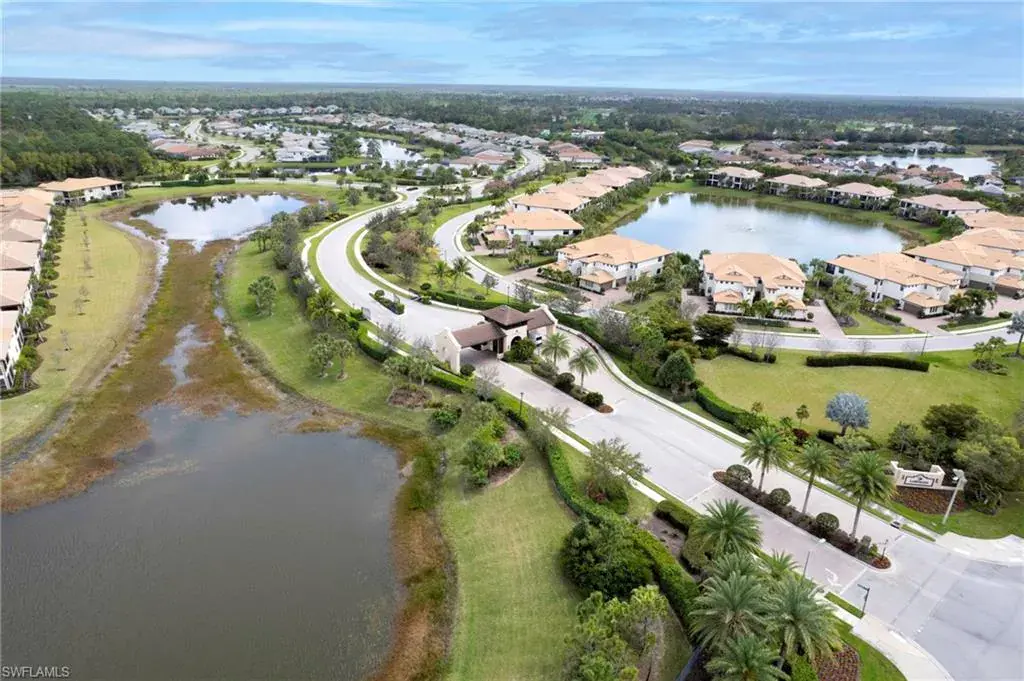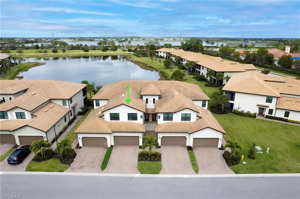 Built in 2020 and impeccably maintained, this sophisticated second-floor coach home in gated LaMorada blends modern finishes with serene lake views. Enjoy 2,100+ sq. ft. of thoughtfully designed living featuring an open, split-bedroom layout and an expansive screened lanai that becomes a true outdoor living room. Upgrades include custom crown molding, designer lighting, and contemporary ceiling fans throughout. The chef’s kitchen showcases quartz countertops, an oversized island/breakfast bar, and seamless flow to the lanai—perfect for relaxed mornings or effortless entertaining. The private primary suite opens to the lanai and offers two walk-in closets plus a spa-style bath with dual quartz vanities and an oversized shower. An rare 2.5-car garage provides abundant storage for bikes, beach gear, and more. LaMorada’s resort amenities elevate everyday living: clubhouse with fitness center, sparkling pool & spa, tennis, pickleball, bocce, library, and theater room. Prime North Naples location close to beaches, dining, shopping, and cultural venues. A move-in-ready lakefront retreat.