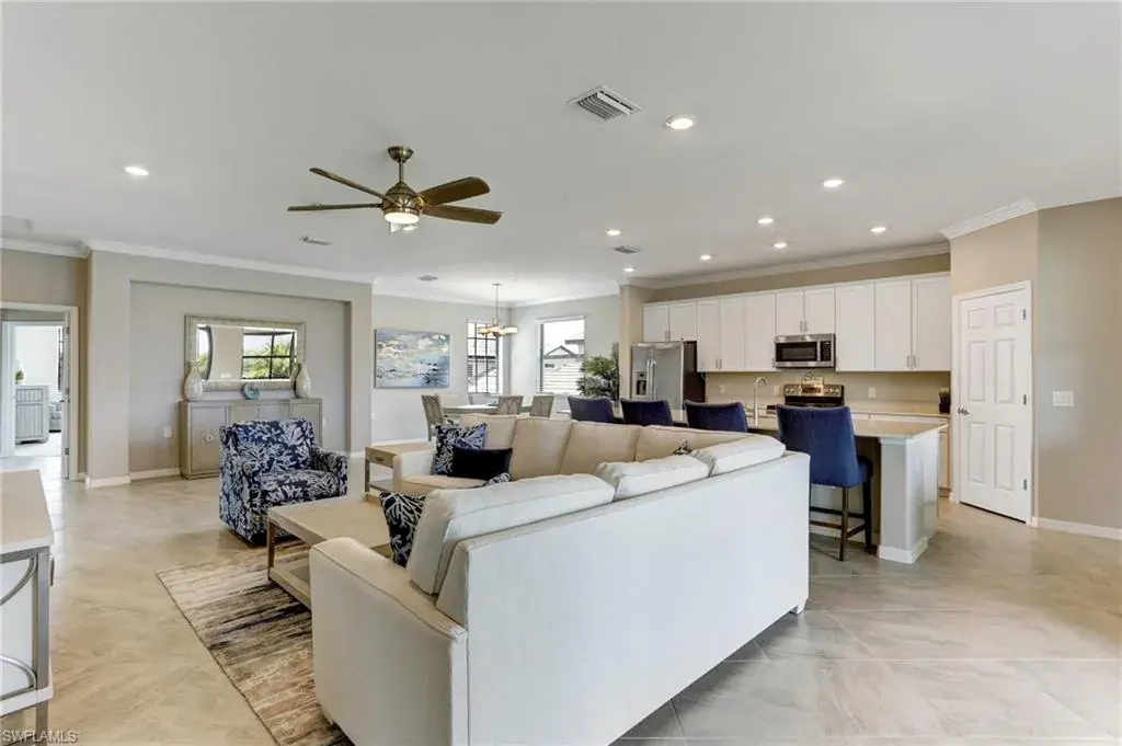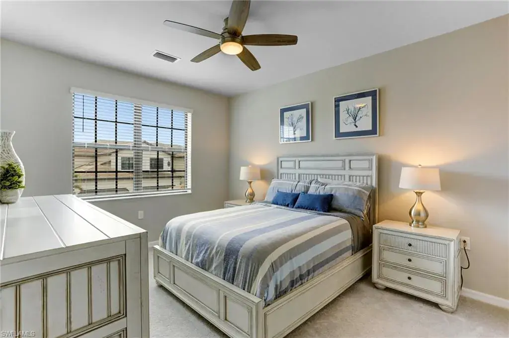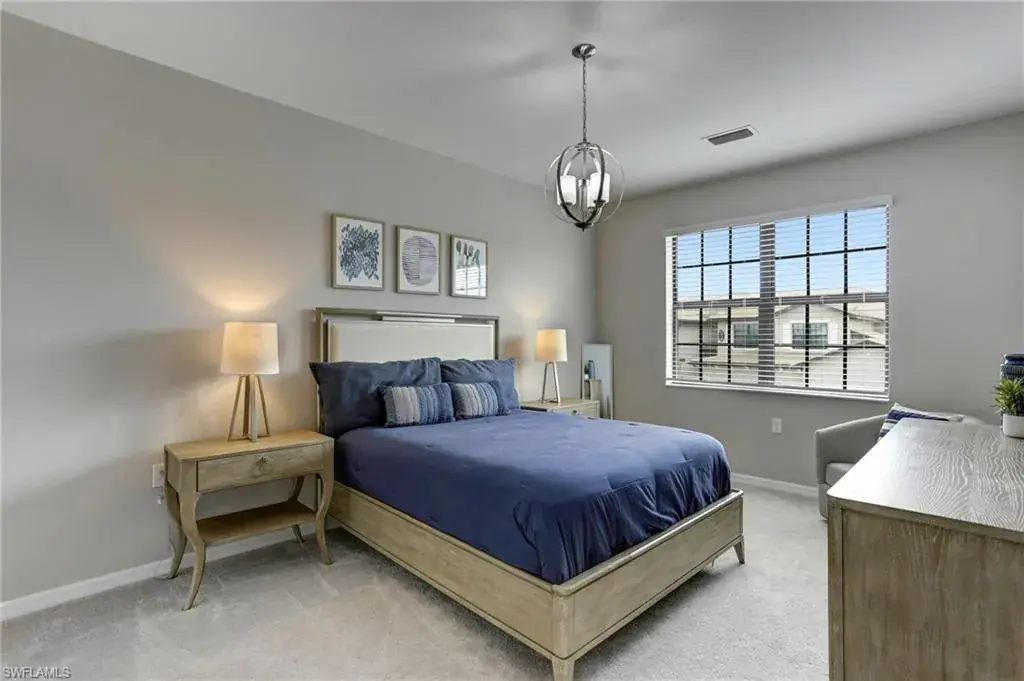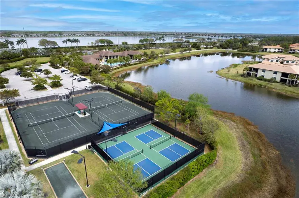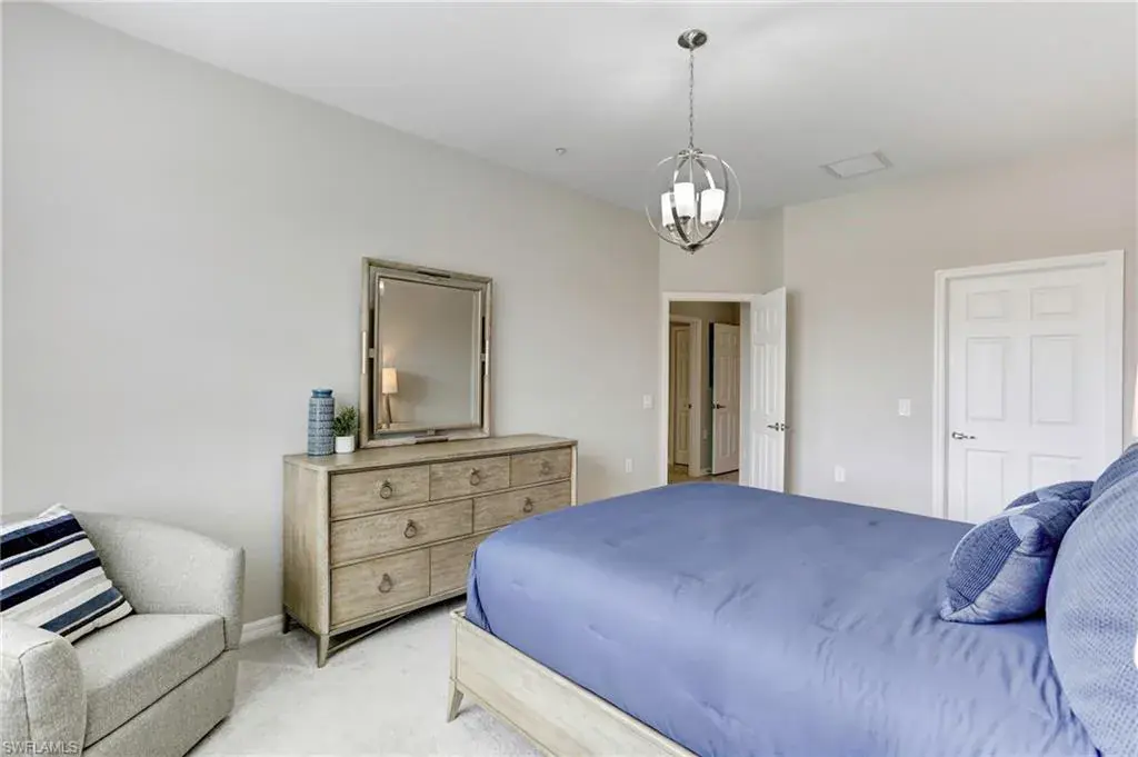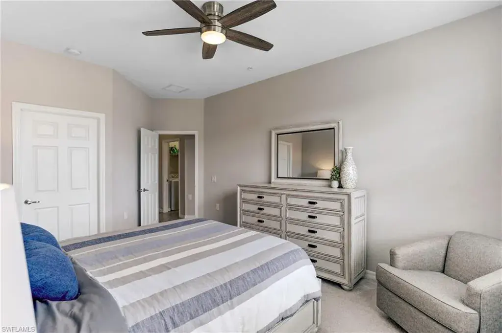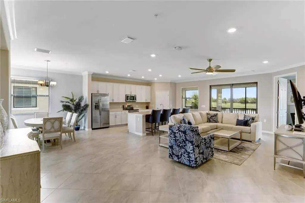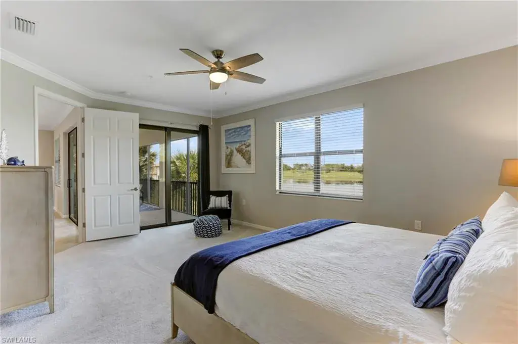 Built in 2020 and impeccably maintained, this sophisticated second-floor coach home in gated LaMorada blends modern finishes with serene lake views. Enjoy 2,100+ sq. ft. of thoughtfully designed living featuring an open, split-bedroom layout and an expansive screened lanai that becomes a true outdoor living room. Upgrades include custom crown molding, designer lighting, and contemporary ceiling fans throughout. The chef’s kitchen showcases quartz countertops, an oversized island/breakfast bar, and seamless flow to the lanai—perfect for relaxed mornings or effortless entertaining. The private primary suite opens to the lanai and offers two walk-in closets plus a spa-style bath with dual quartz vanities and an oversized shower. An rare 2.5-car garage provides abundant storage for bikes, beach gear, and more. LaMorada’s resort amenities elevate everyday living: clubhouse with fitness center, sparkling pool & spa, tennis, pickleball, bocce, library, and theater room. Prime North Naples location close to beaches, dining, shopping, and cultural venues. A move-in-ready lakefront retreat.
