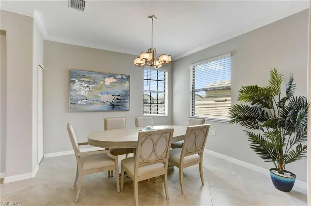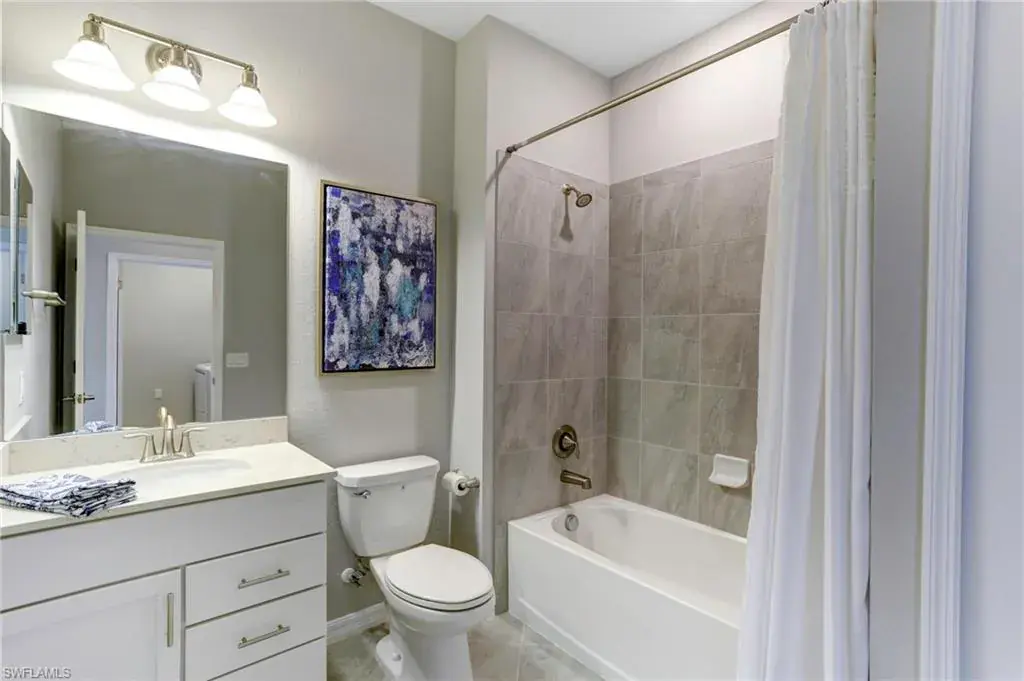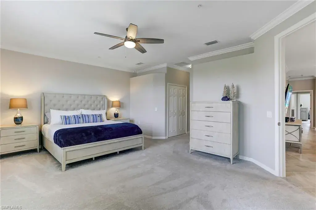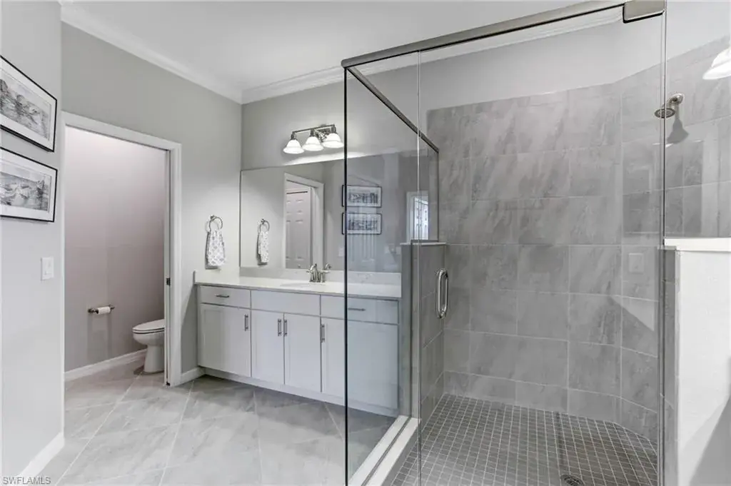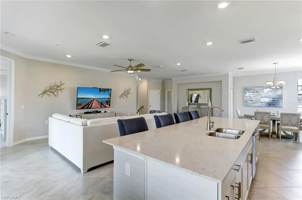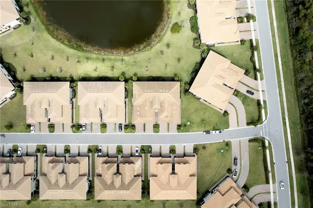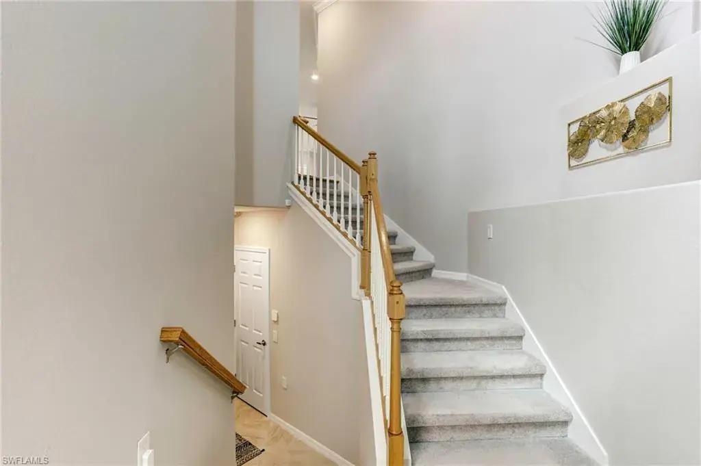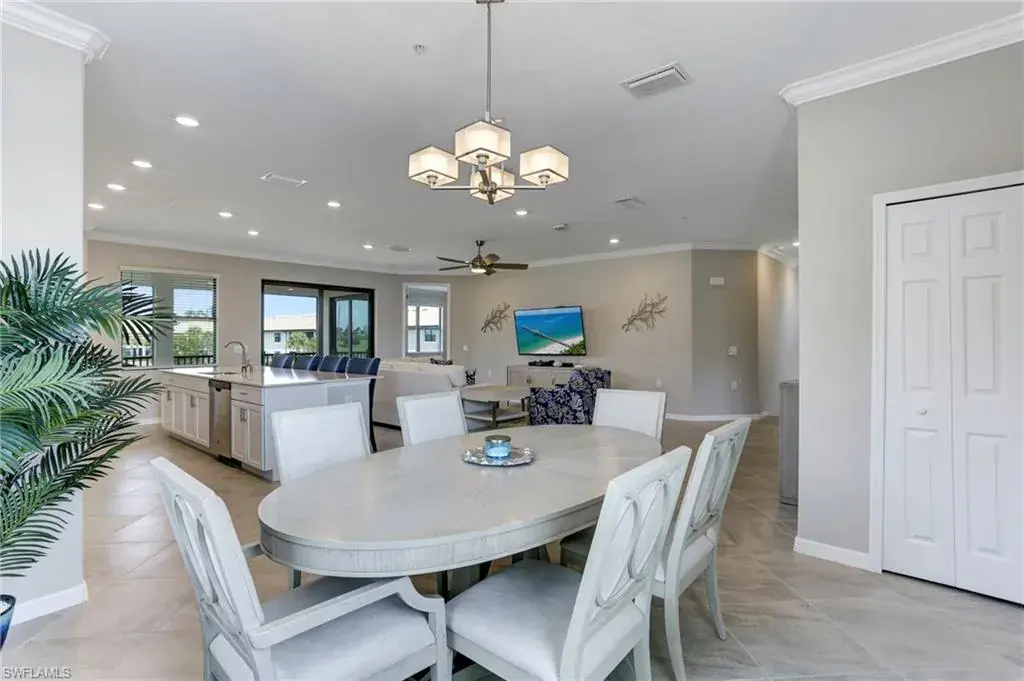 Built in 2020 and impeccably maintained, this sophisticated second-floor coach home in gated LaMorada blends modern finishes with serene lake views. Enjoy 2,100+ sq. ft. of thoughtfully designed living featuring an open, split-bedroom layout and an expansive screened lanai that becomes a true outdoor living room. Upgrades include custom crown molding, designer lighting, and contemporary ceiling fans throughout. The chef’s kitchen showcases quartz countertops, an oversized island/breakfast bar, and seamless flow to the lanai—perfect for relaxed mornings or effortless entertaining. The private primary suite opens to the lanai and offers two walk-in closets plus a spa-style bath with dual quartz vanities and an oversized shower. An rare 2.5-car garage provides abundant storage for bikes, beach gear, and more. LaMorada’s resort amenities elevate everyday living: clubhouse with fitness center, sparkling pool & spa, tennis, pickleball, bocce, library, and theater room. Prime North Naples location close to beaches, dining, shopping, and cultural venues. A move-in-ready lakefront retreat.
