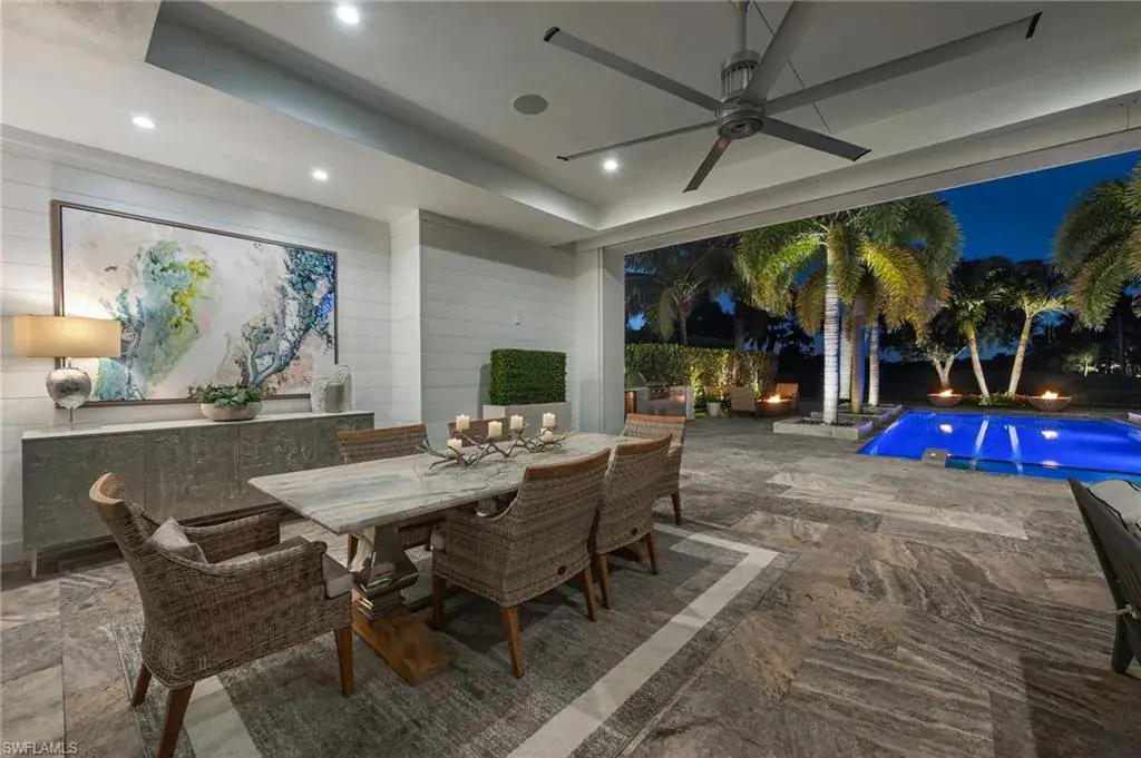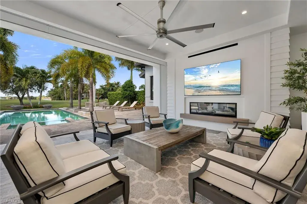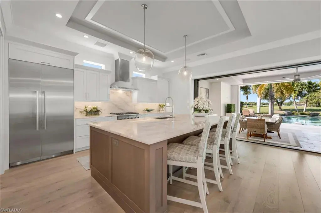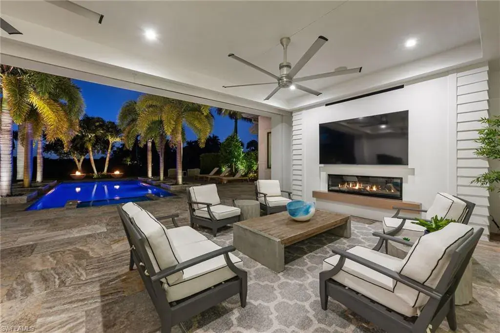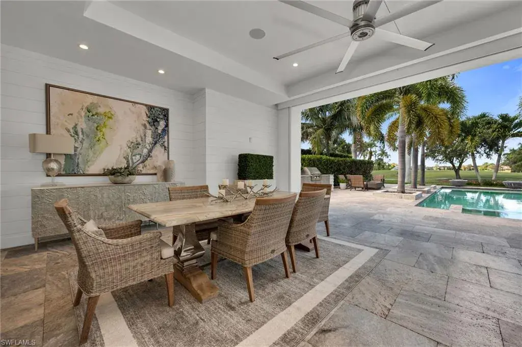 Step outside and enjoy your golf course views right from your expansive 1900 sf lanai, featuring a custom fireplace, fully equipped outdoor kitchen, resort-style pool with fire bowls and fire table, perfect for sunset cocktails or weekend gatherings. Plus, your private dock with boat slip offers direct access to the Gulf, for endless adventures.