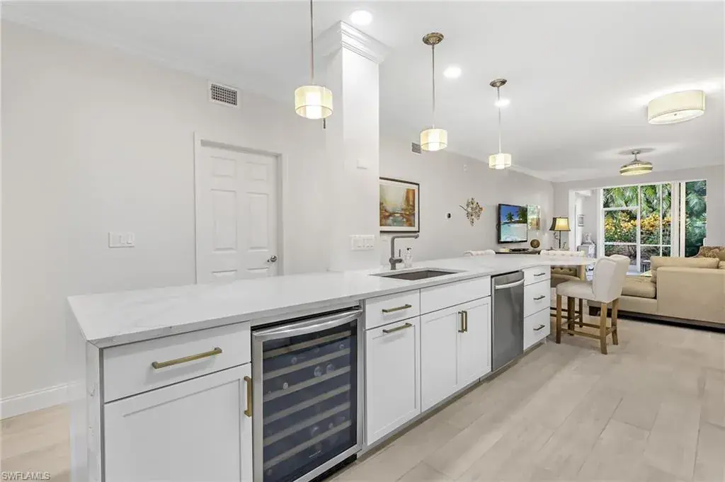 TAKE ME TO TANBARK!! This absolutely stunning, “one of a kind”, fully remodeled, 1st floor, light and bright condo in Laural Oaks at Pelican Bay will have you saying take me to Tanbark #104! The highlight is a FULLY UPGRADED MODERN-CHIC KITCHEN (2019) w/ gorgeous 18FT QUARTZ TOPPED CENTER ISLAND w/ waterfall edge, 42″ soft close cabinets, hexagonal gold inlay backsplash, coffee bar cabinet, & SS appliances. Additional features include NEGOTIABLE FURNISHINGS, NEW A/C 2021, NEW HOT WATER HEATER 2021, wide plank, “wood like” porcelain tile floors; a fully upgraded primary bedroom w/ spacious ensuite, custom closet, & walk-in shower w/ rain head; large guest bedroom w/ stunning en-suite lathed in modern marble; upscale fans & fixtures, LUTRON SYSTEM & more! Bringing in the outdoors, enjoy a charming FRONT LANAI w/ custom shades & glass doors; REAR LANAI CONVERSION w/ glass sliders blending the space into the living area; landscaped views, covered carport & more! All of this, plus the unique, amenity rich, private beach, exclusive club lifestyle that only Pelican Bay has to offer! This condo is ideally located, walkable to some of the area’s best shopping, dining, entertainment & more!!