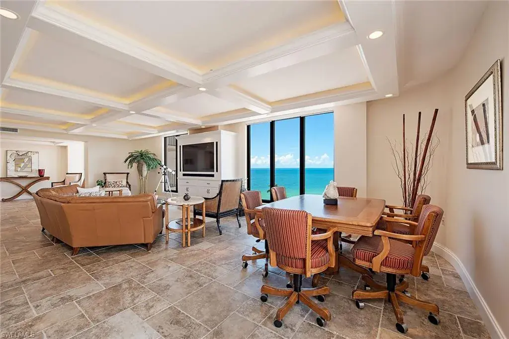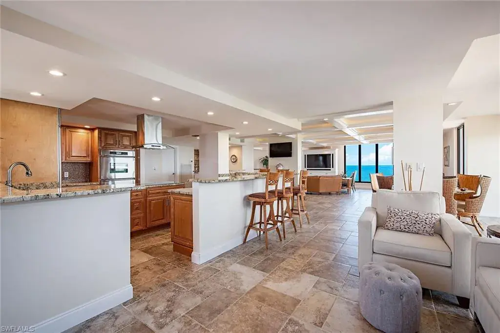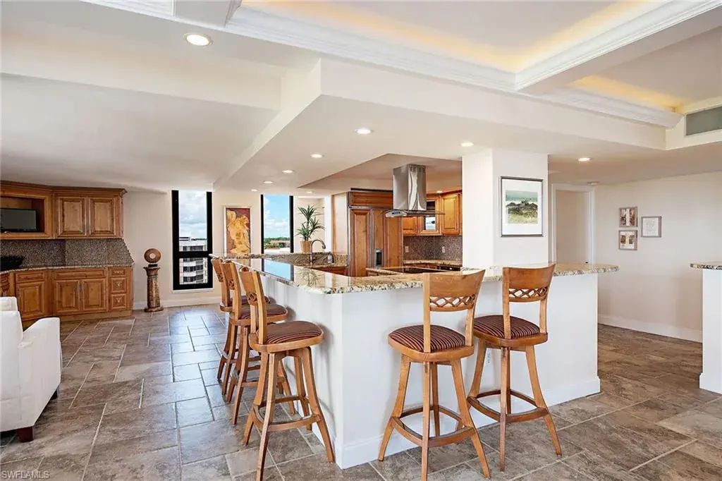 Delight in tranquil sunrises, gorgeous sunsets and spacious living from this seventh-floor penthouse! Encompassing 3,500 square feet of interior space, this move-in ready home features four bedrooms, four full baths and an open floor plan ideal for entertaining. The kitchen area includes a center island with cooktop, Sub-Zero and Décor appliances plus ample storage. The oversized primary suite has double vanities, separate water closet, large shower and walk-in closet. Additional features are two balconies, wet bar, laundry room, custom millwork and two entrances. Lausanne boasts one of the largest pool decks on Moorings Beach. The updated resort style pool deck includes pergola areas for those requiring shade as well as fire pits for evening enjoyment at sunset. Some of the many amenities include 24-hour reception, an expansive beach area with barbecue deck, fitness room, billiards room, social room, bocce court and on-site management. For shopping, dining or entertainment, check out the bay to Venetian Village or take a short drive to Fifth Avenue/Third Street or Waterside Shops. The home is ready for your immediate enjoyment.