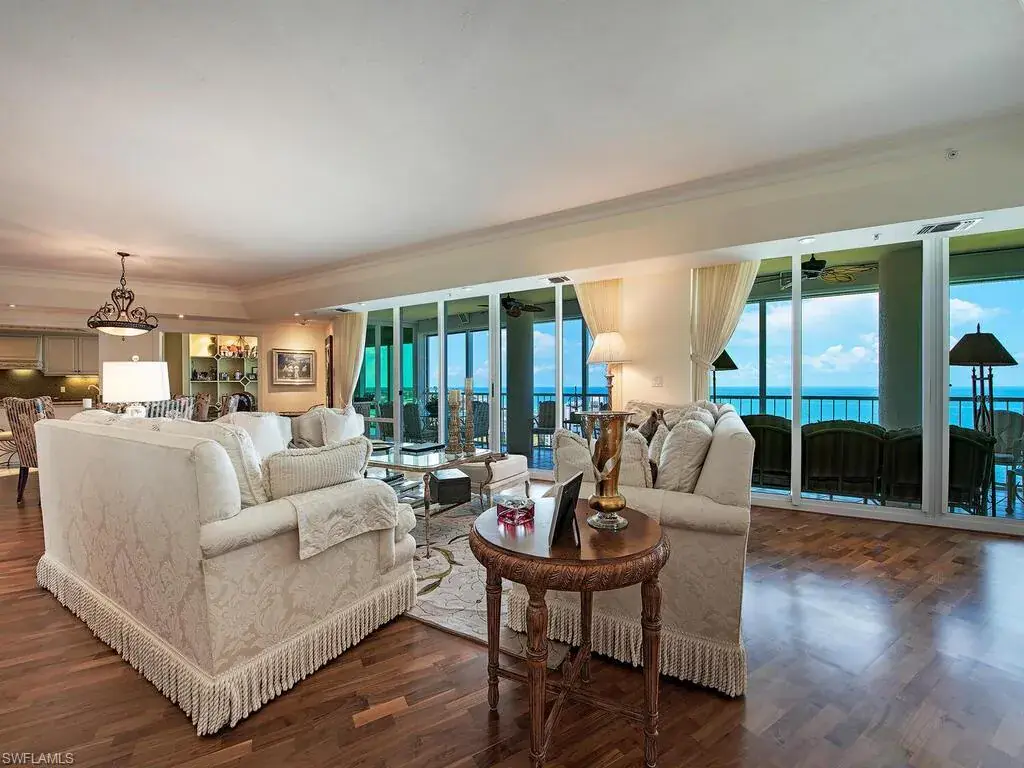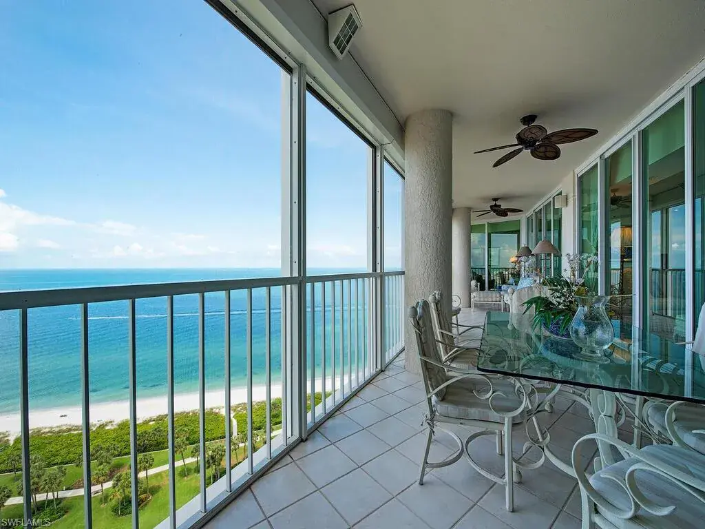 C6425 – Exceptional beachfront condo. Unobstructed & expansive views of the park and Gulf of Mexico from the 48′ tiled & screened terrace with electric storm shutters and a built-in grill. Floor to ceiling glass windows invite you to enjoy the outside. Views pf Venetian Bay to the East. The best of both worlds! “Great room” layout in this rarely available “02” floorplan on the 17th floor. Each of the three bedrooms has a private bath. The Master bedroom has 2 walk-in closets. Note that the 3rd bedroom is currently being used as a home office/den. Welcome to incredible sunrises & sunsets! Tastefully designed with wood flooring, tray ceilings & custom cabinets. There are two garage spaces (#113 & #114) & an air conditioned storage unit (#61- a 4X4 space).(To access go to L 2.) Newly renovated lobby, social room & elevators plus fitness center enhance this low density building. Two guest suites available. The beachfront sparkling pool quietly overlooks the beautiful park and the Gulf of Mexico. Le Ciel at Park Towers is just steps away from Venetian Village, a renowned enclave for shopping and gourmet dining.