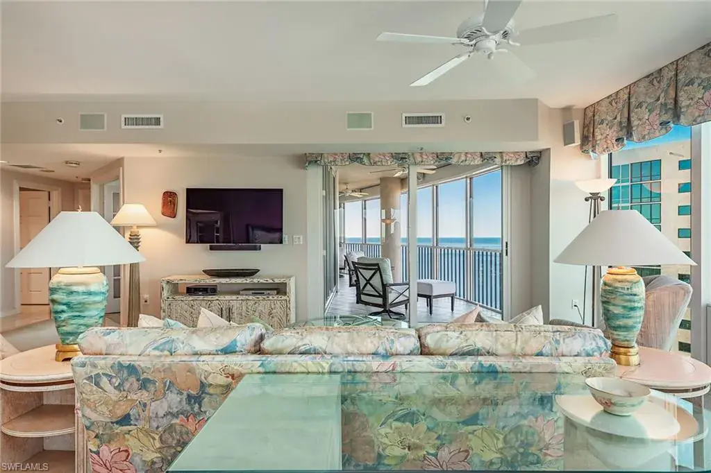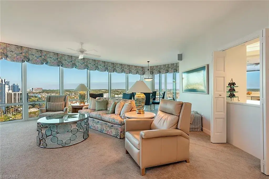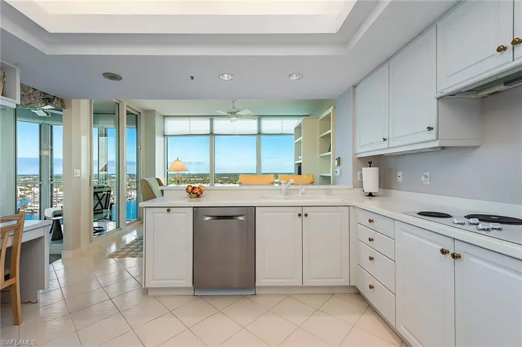 Enjoy wrap-around views of the Gulf of Mexico and Venetian Bay in this three-bedroom, three-bath 18th-floor beachfront residence. his home encompasses nearly 2,600 square feet of living area with three bedrooms, kitchen with morning room plus breakfast bar and great room with dining area. The spacious primary suite features dual closets, linen closet and a bath area with dual sinks plus separate tub and shower. Enjoy watching the sunrise from the east terrace and sunset from the generous-sized main terrace. Le Ciel Venetian Tower features floor-to-ceiling walls of glass, 9-foot ceilings and storage closet outside the front door. Building amenities are top-notch and include a recently renovated lobby, social room with catering kitchen and pool area, 24-hour front desk attendant, exercise room, guest suites, on-site manager, tennis courts, additional storage locker and two parking garage spaces. Visit Venetian Village for shopping, dining and entertainment. Park Shore residents may purchase or lease a boat slip across the street, based on availability.