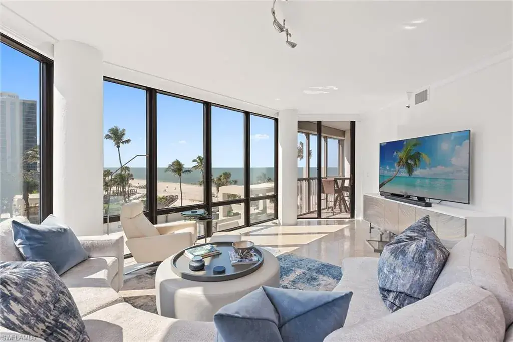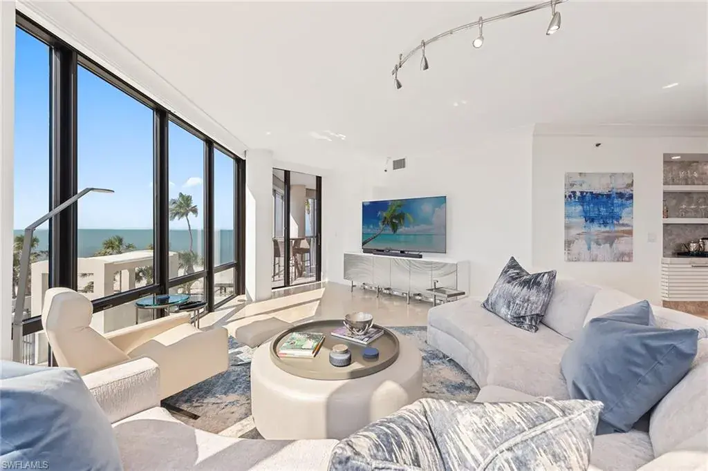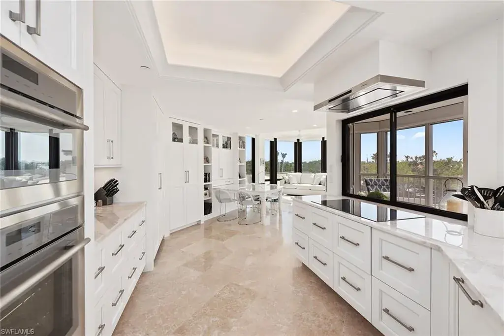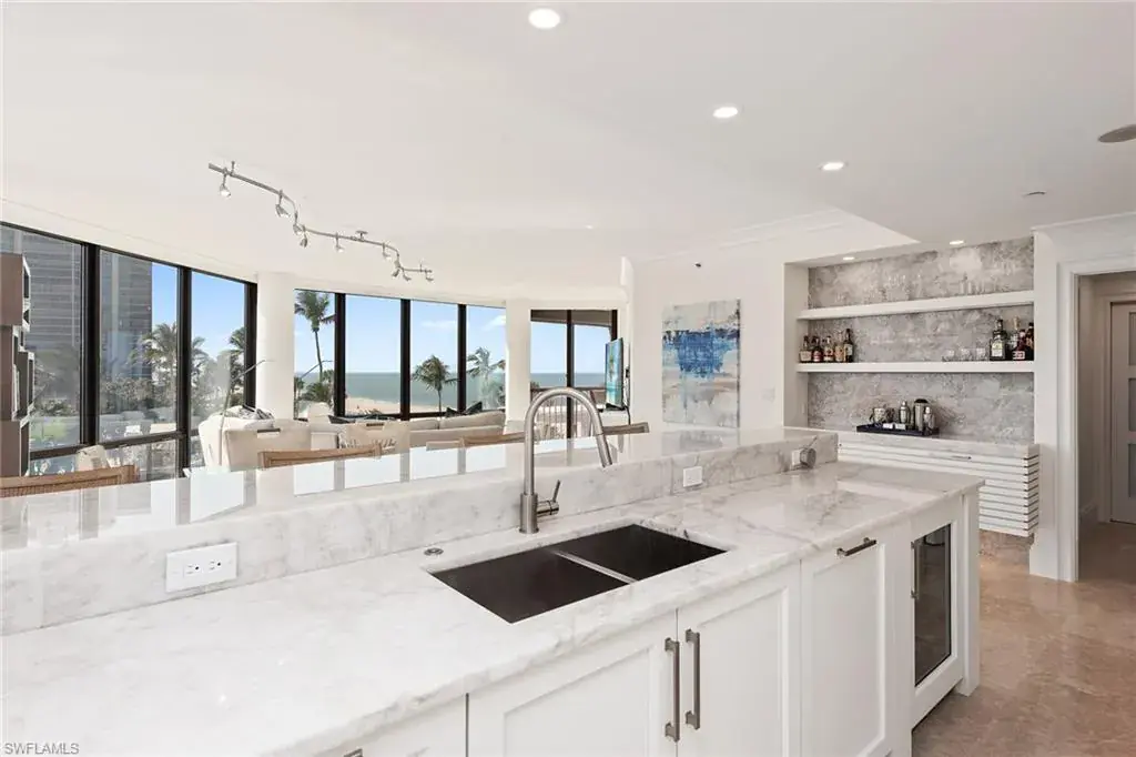 This beautifully redesigned home offers spectacular panoramic 4th floor views through floor-to-ceiling windows, starting at the Gulf of Mexico and sweeping south around to Venetian Bay. Watch the sun rise and set from the comfort of your home. The renovation just completed by Build Inc didn’t leave anything to the imagination. High-end finishes accent the updated space, including custom cabinetry, recessed lighting, electric shades, crown molding and stunning stone countertops. The open kitchen boasts a breakfast bar, tile backsplash, built-in dining table, soft-close cabinets and Thermador wood-paneled appliances. Extra features in the master suite make this a must see, with custom closet cabinets with leather pulls and a spiral rack, back-lit and self-defrosting mirrors, and a jetted tub. With an expansive living area, 2 private screened balconies and plenty of storage, this home takes care of all your needs. It comes with two under-building parking spots, extra storage room, and 1 dog or 2 cats under 25 pounds are permitted. Leasing is allowed once per year with a 90-day minimum. Le Parc sits at the northernmost end of Gulf Shore Blvd, just under a mile from the shops and dining at Venetian Villages, and steps from the Park Shore Promenade, a private 1.3-mile path to walk along the beach. Enjoy luxury amenities, including a beachfront pool, indoor spa, fitness center, tennis court, billiards and card room, reception room, 2 guest suites and 24-hour staff.
