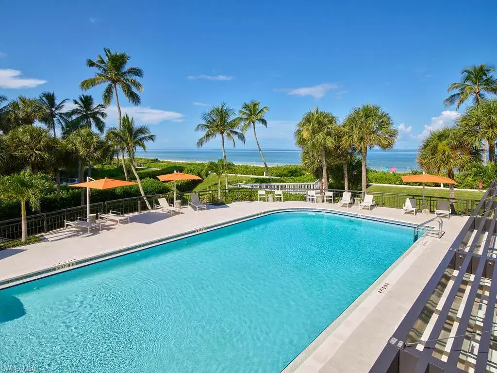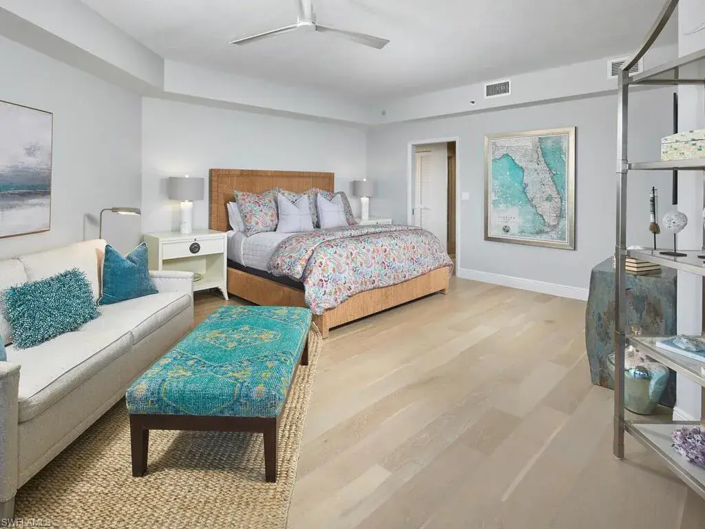 This impeccably maintained and tastefully updated turnkey furnished home features elegant wood flooring throughout. Floor-to-ceiling windows and sliding glass doors fill the space with natural light and open to two screened terraces, the primary suite and living room overlooking the white sandy beach and the waters of the Gulf of America, the kitchen and guest bedroom capturing the glittering skyline and serene beauty of Venetian Bay.