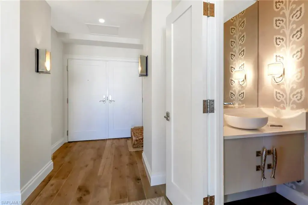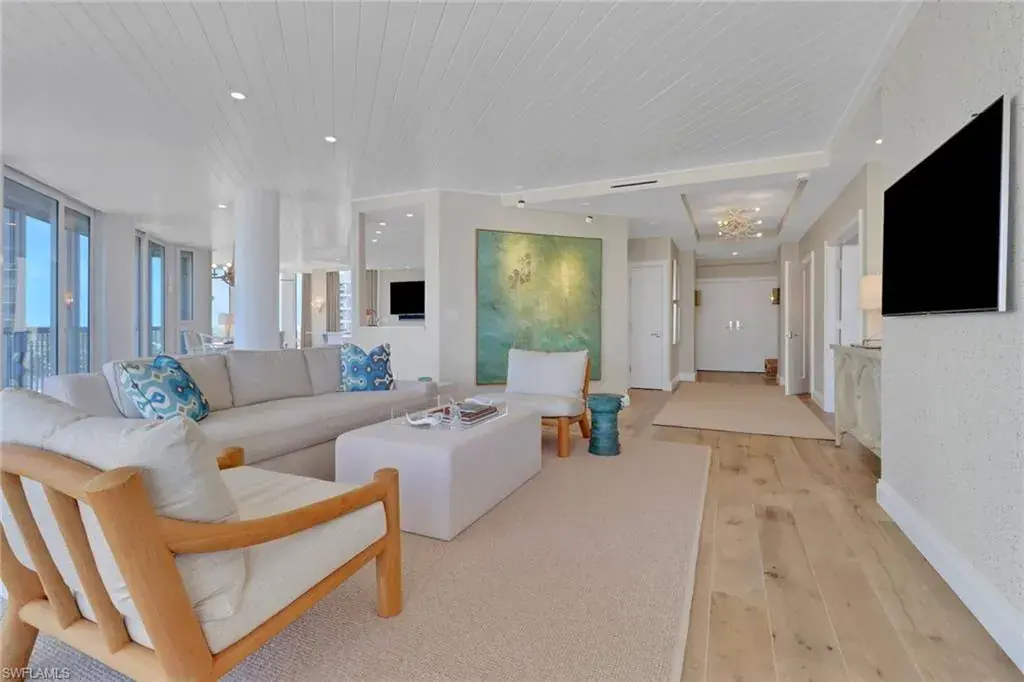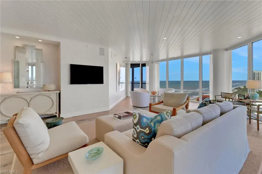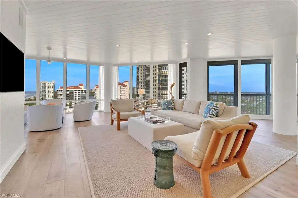 LePARC IN PARK SHORE.This beautifully redesigned home offers spectacular panoramic views through floor-to-ceiling windows overlooking the Gulf of Mexico and Venetian Bay. Watch the sun rise and set from the comfort of your home. High-end finishes accent the updated space including custom cabinetry, recessed lighting, electric shades, tongue and groove ceilings, wood-grain porcelain floors and so much more! The open kitchen boasts a breakfast bar with built in refrigerator drawers, tile backsplash, quartz countertops, custom cabinets with glass front uppers and lighting in the upper cabinets as well as under counter. Top of the line appliances complete the kitchen.  This is a 2 bedroom, 2 full bath unit with an additional half bath all under air with 2,669 sq ft. In addition there is a screened-in lanai for outdoor seating. The unit is protected with impact resistant sliders and additional electric storm shutters. LeParc amenities include a resort style pool and spa, outdoor grills, patio with seating and two guest suites that walk out to the terrace. Included is a state of the art fitness center along with locker rooms, saunas and spa. The community room is complete with a kitchen that opens to the outdoor terrace. The beach is directly out your front door waiting for you! Walk to your favorite restuarants and shops at Venetian Village!