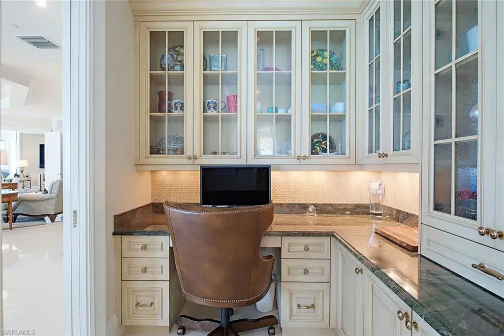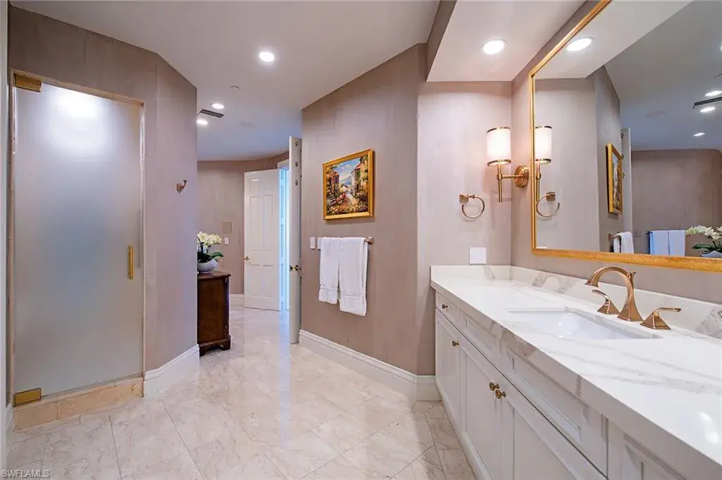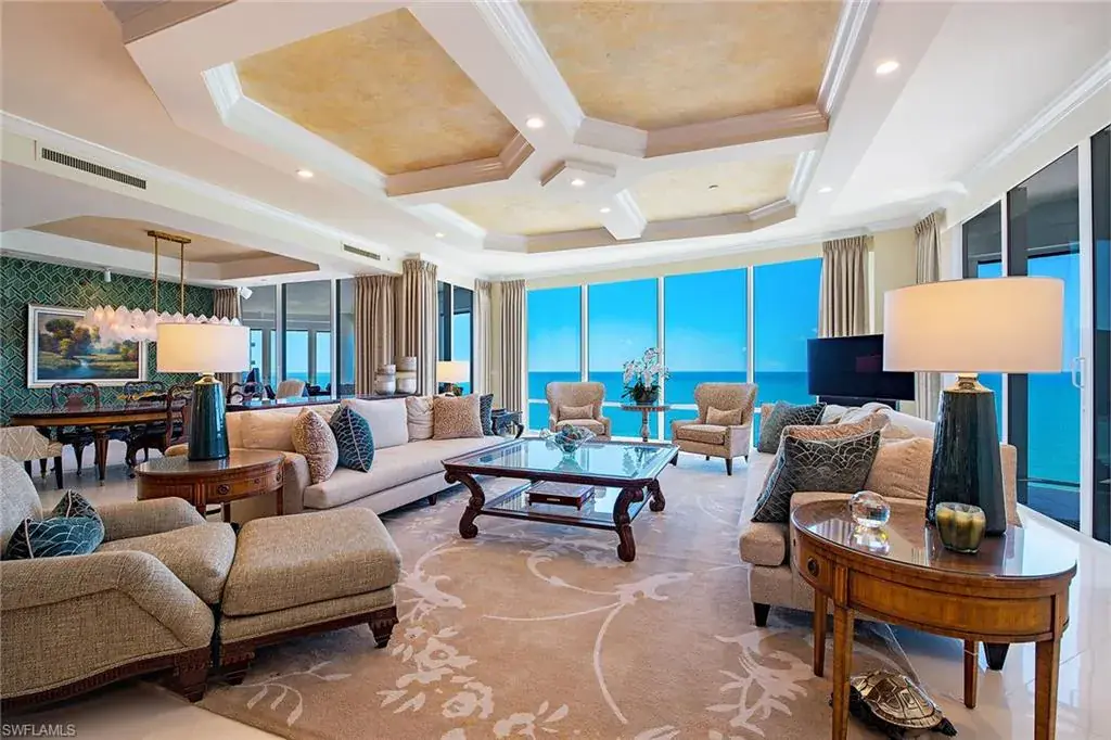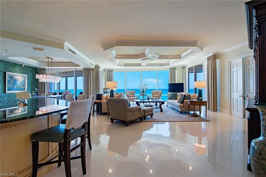 Enjoy mesmerizing Gulf views to Sanibel and beyond from one of Naples’ most sought-after buildings! This rarely available south side Le Rivage offering is comprised of over 6,000 square feet of living area with four full bedroom suites, four-and-a-half baths, library, great room with wet bar, formal dining area and family room. Estate Fifteen South boasts three lanais (two with Gulf views and one with a bay view) and has been updated with new baths, refreshed kitchen, family room with a linear fireplace, Lutron lighting system plus art lighting, electric shades, glass-panel lanai railings with electric screens and additional designer finishes throughout. The wraparound views from the kitchen and family room area capture the sunrise over the bay and stunning sunsets in the evening. Some of the elevated building specifications include floor-to-ceiling walls of glass, ten-foot ceilings, eight-foot doors, private elevator entry, gas cooking and a water detection system. Le Rivage offers the complete luxury lifestyle, with unmatched amenities that include 24-hour front desk attendant, saline pool and spa, completely renovated lower and upper lobbies-including social room with full catering kitchen, top-notch fitness room, two Gulf-view guest suites, three parking spaces (2 with EV meters), air-conditioned storage unit and separate beach storage. The Village on Venetian Bay is a short stroll away and has been heralded for its waterfront setting, wonderful dining and eclectic mix of specialty retailers. A boat slip located directly across the street is negotiable.
