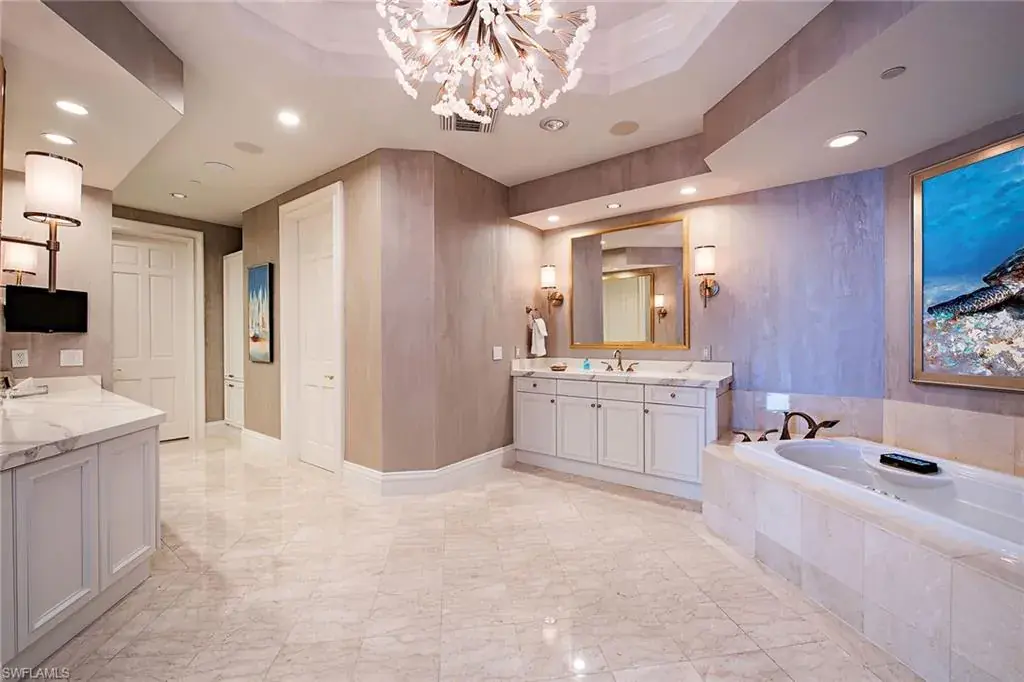 Directly on the sand and sunsets year-round! Enjoy mesmerizing Gulf views to Sanibel and beyond from one of Naples sought-after buildings! This rarely available south side Le Rivage offering is comprised of over 6,000 square feet of living area with four full bedroom suites, four-and-a-half baths, library, great room with wet bar, formal dining area and family room. Estate Fifteen South boasts three lanais (two with Gulf views and one with a bay view) and has been updated with new baths, refreshed kitchen, family room with a linear fireplace, Lutron lighting system plus art lighting, electric shades, glass-panel lanai railings with electric screens and additional designer finishes throughout. The wraparound views from the kitchen and family room area capture the sunrise over the bay and stunning sunsets in the evening. Some of the elevated building specifications include floor-to-ceiling walls of glass, 10-foot ceilings, 8-foot doors, private elevator entry, gas cooking and a water detection system. Le Rivage offers the complete luxury lifestyle, with unmatched amenities that include 24-hour front desk attendant, saline pool and spa, completely renovated lower and upper lobbies-including social room with full catering kitchen, top-notch fitness room, two Gulf-view guest suites, three parking spaces (two with EV meters), air-conditioned storage unit and separate beach storage. The Village on Venetian Bay is a short distance away and has been heralded for its waterfront setting, wonderful dining and eclectic mix of specialty retailers. A boat slip directly across the street is negotiable.