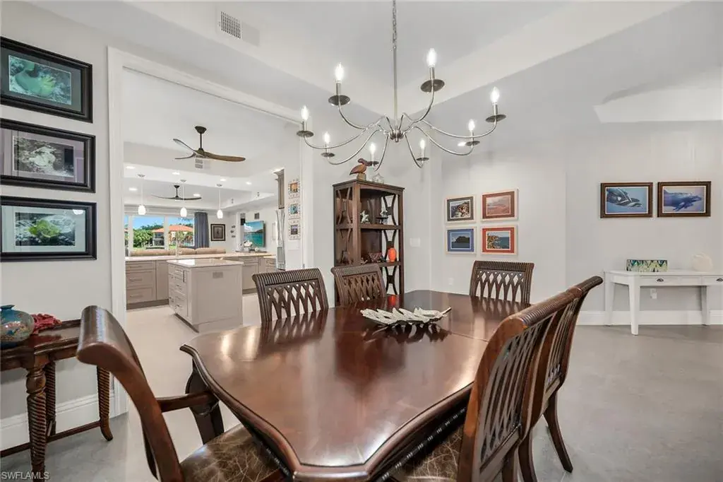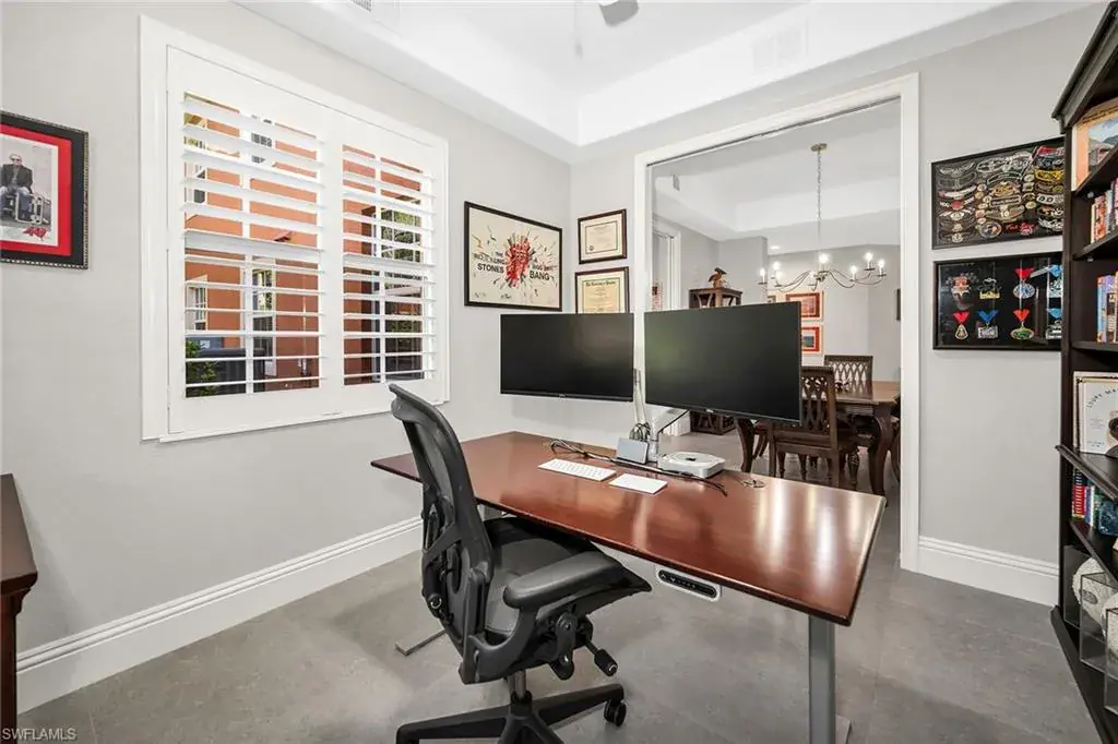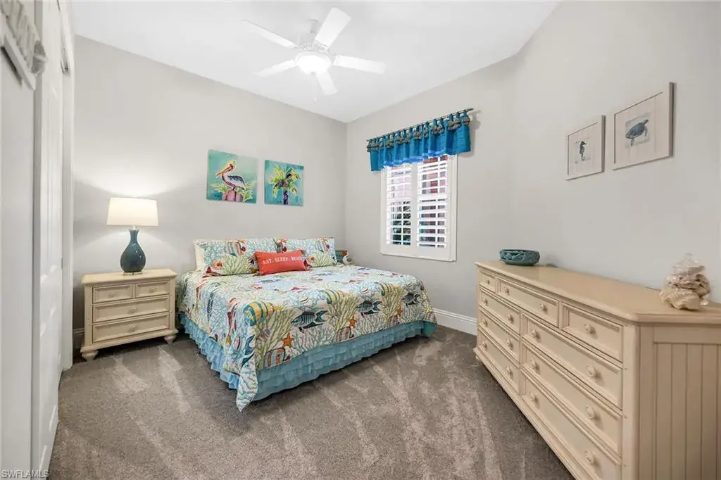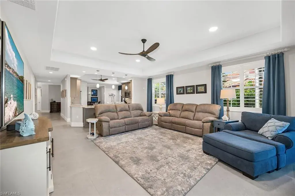This beautifully updated first-floor residence in Legacy at Lely Resort offers tranquil long lake views and a sophisticated coastal feel throughout. Featuring two bedrooms plus a den, two baths, and a two-car garage, the home is designed for both comfort and style. The screened and covered lanai, finished with extended tile flooring, a ceiling fan, and a newly installed panoramic screen, provides a peaceful setting to relax or entertain while enjoying the serene water views. Inside, the open floor plan is enhanced by tile flooring in the main living areas, recessed lighting and white plantation shutters. The kitchen is a modern showpiece with sleek cabinetry, quartz countertops and backsplash, a center island, bar seating with pendant lighting, a pantry with custom shelving, and a full suite of GE stainless steel appliances. A cozy breakfast nook is framed by windows, while pocket sliders connect seamlessly to the formal dining area. The adjacent den is set up as an office, offering flexibility for work or leisure. The living room opens directly to the lanai, creating a harmonious indoor-outdoor flow. The owner’s suite is a private retreat with bay windows framing sweeping lake views, one walk-in closet and one slider closet, both outfitted with custom shelving, and a spa-like bath featuring dual quartz vanities with a makeup counter, a soaking tub, a walk-in shower with frameless glass and a linen closet. The guest bedroom includes a ceiling fan and an adjacent bath with a beautifully finished walk-in shower, quartz vanity and a frameless glass enclosure. A spacious laundry room adds convenience with a GE washer and dryer, quartz counters, built-in cabinetry, a utility sink and an under-counter wine cooler. Additional features include impact-resistant windows and sliders, a large storage closet with custom shelving, and a two-car garage with epoxy flooring, overhead storage, built-in shelving, and wiring for a portable whole-house generator. Residents of Legacy enjoy membership at The Players Club and Spa, offering resort-style pools, a lap pool, tiki bar, fitness center, spa, fine dining, movie theater, pickleball, tennis, bocce and a vibrant social calendar. Lely Resort also provides two public golf courses and an optional private membership to The Classics, placing world-class amenities right at your doorstep.