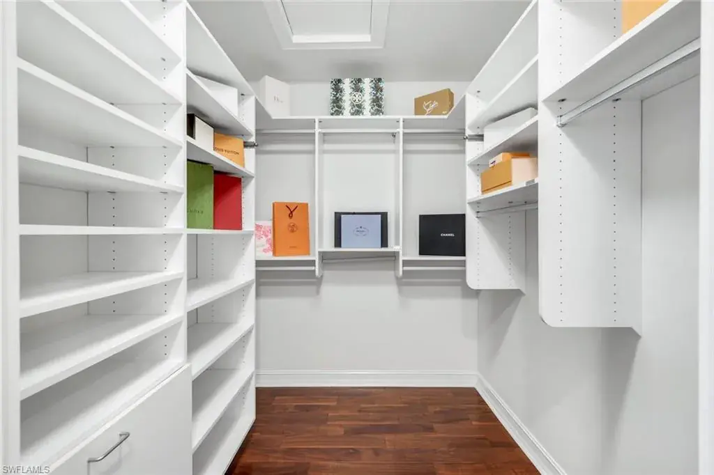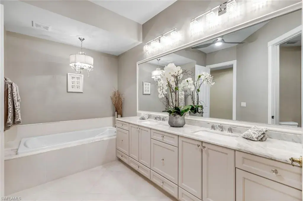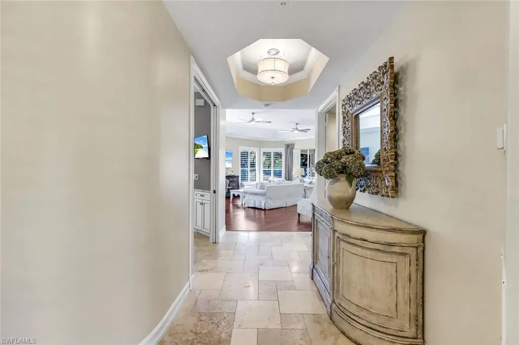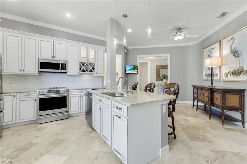 Welcome to our wonderfully appointed and spacious second floor “Versailles” floor plan in highly desirable Les Chateaux. Some of the many features of the 3 bedroom, 2 ½ bathroom residence include travertine tile throughout the main living areas, rich wood flooring in the bedrooms and living room, and brand-new washer and dryer. Beautifully updated kitchen offers new appliances, soft close / pull out cabinets, granite counters and stylish mosaic backsplash. Modernized bathrooms with marble counters and shower in Master and granite in second. Plantation shutters add timeless charm while custom closets provide smart and stylish storage solutions. Enjoy comfortable evenings on the private screened lanai nestled amongst mature landscaping. Your convenient, private 2 car garage has epoxy flooring and a flexible Inspired wall storage system. Les Chateaux offers its residents their own community room with swimming pool, spa and lounging area. Pelican Marsh is a splendid, amenity rich North Naples country club community including tennis, pickleball, bocce, fitness and more and is conveniently located to the best in shopping, dining and beaches.