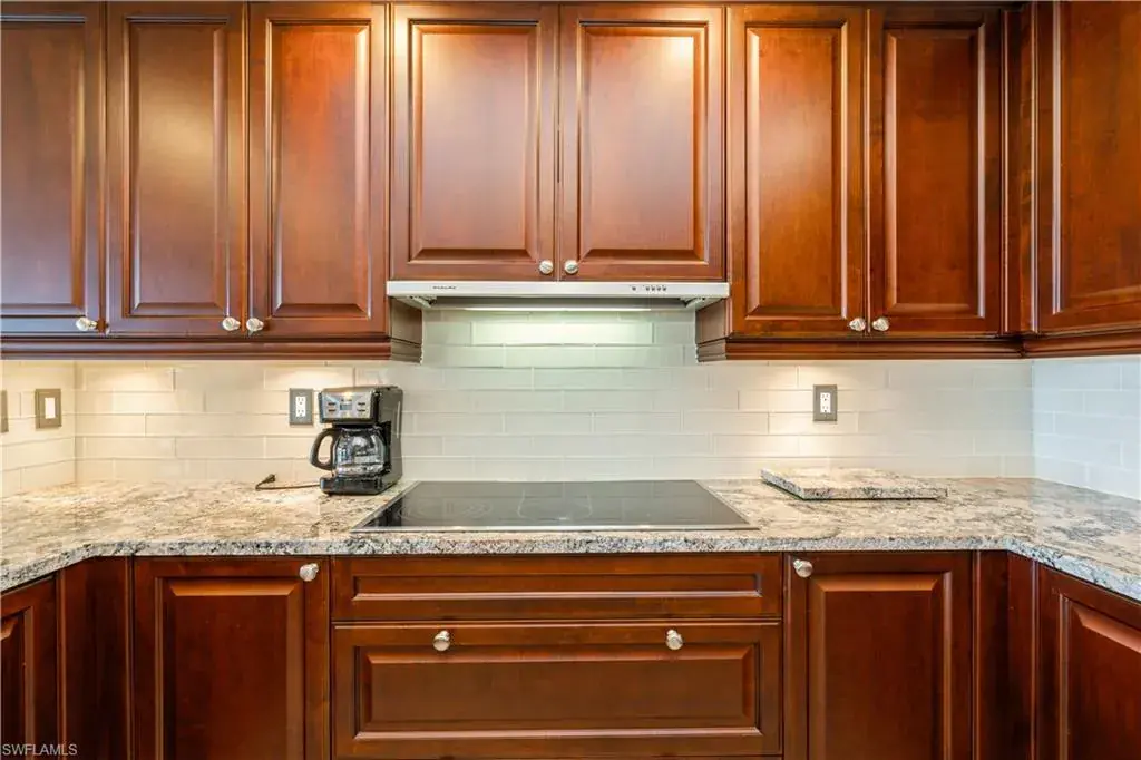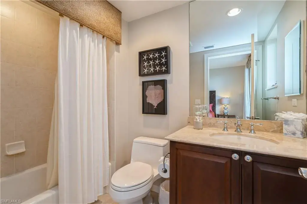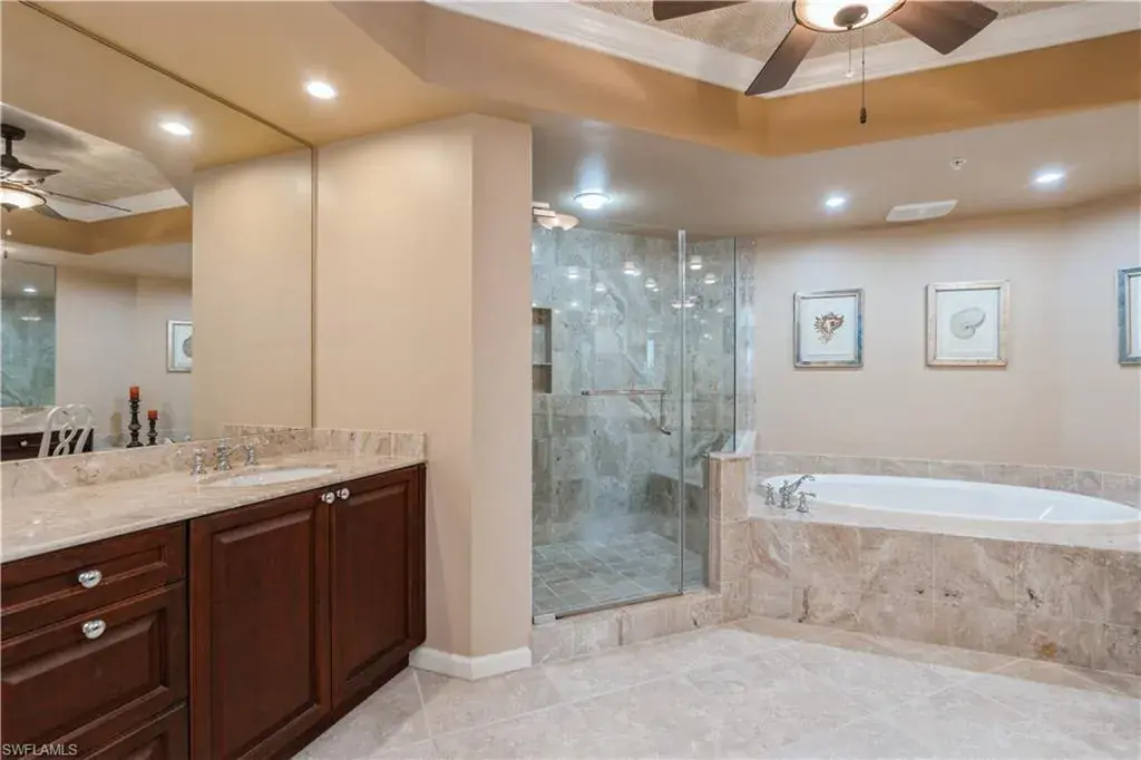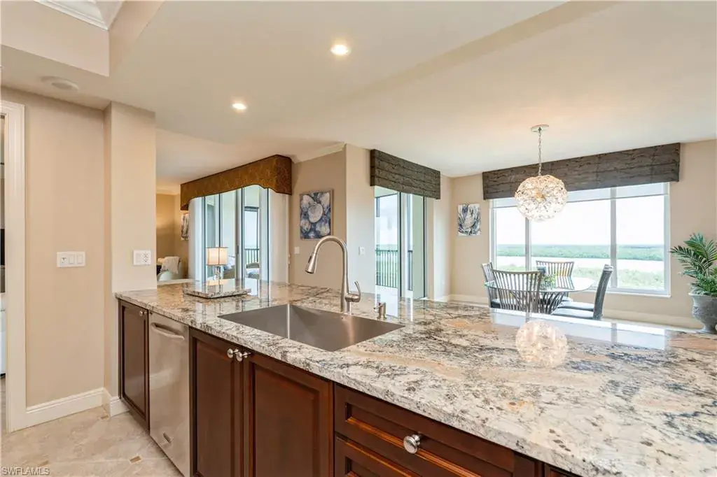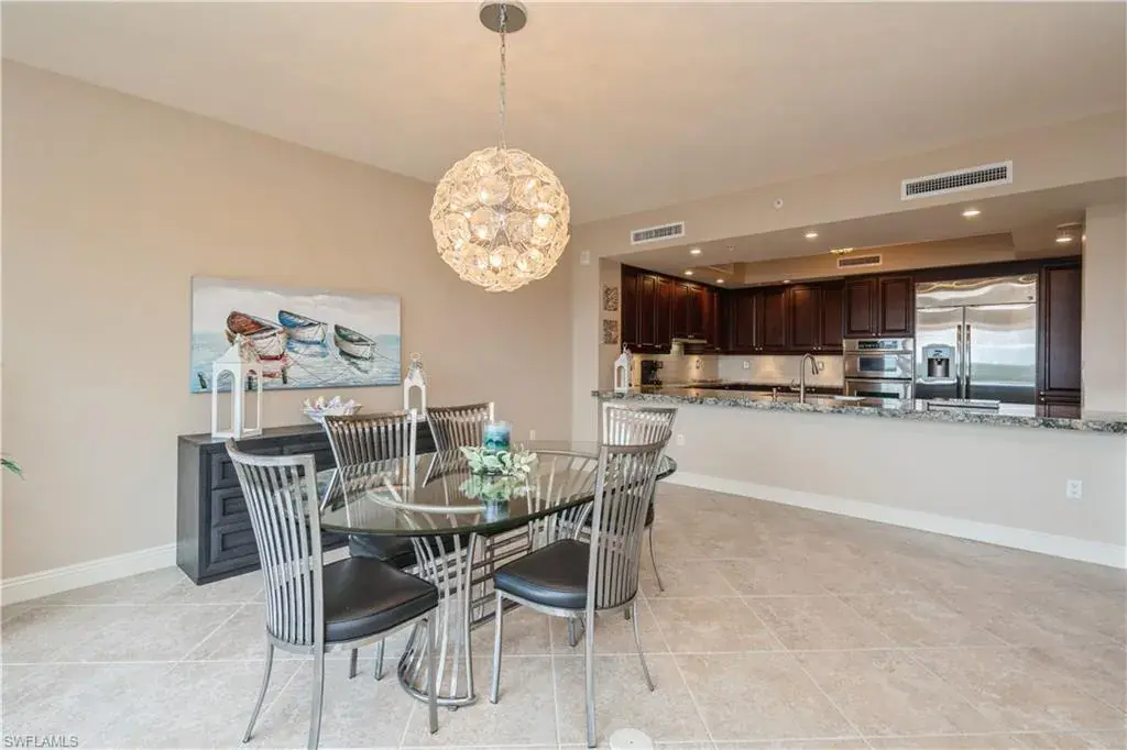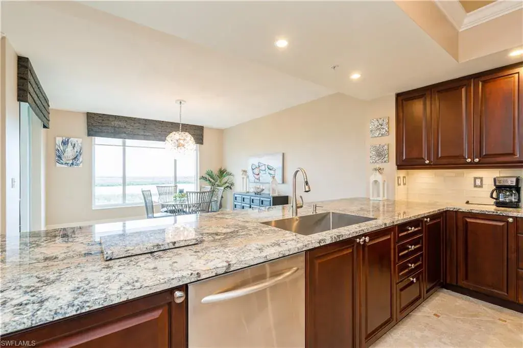 The updated chef’s kitchen is a standout, featuring a striking one-level granite bar, dramatic backsplash, and high-end stainless steel appliances—perfect for entertaining in style. The expansive screened lanai invites you to relax and take in the lush tropical landscape, sweeping bay views, and sparkling Marco Island skyline.