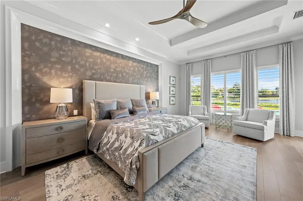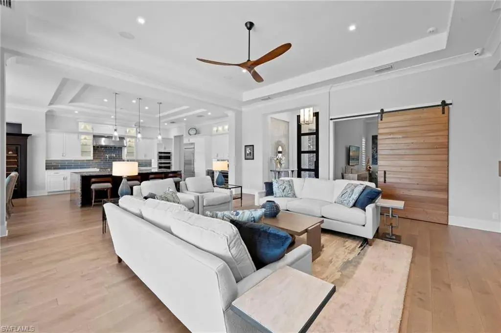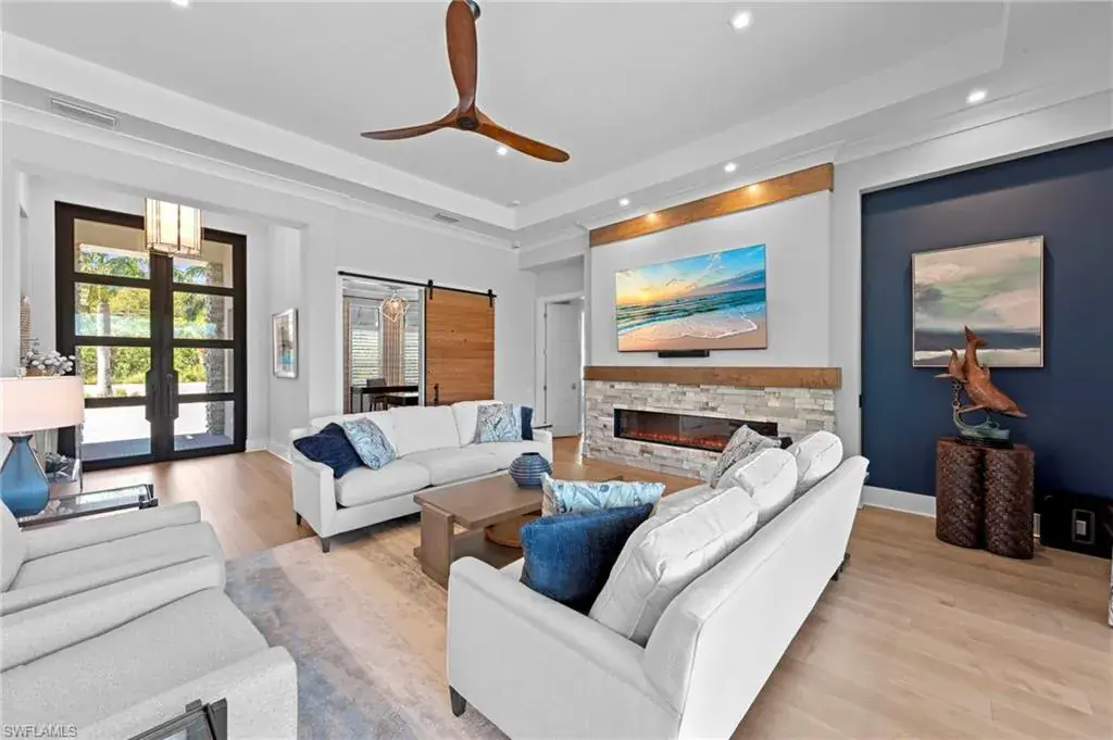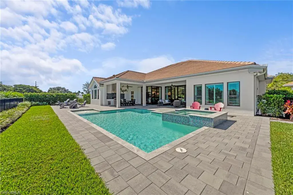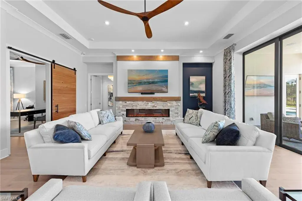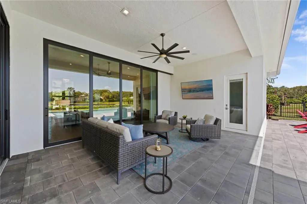 Two garages each for 2 cars, spacious lanai with an unobstructed lake view. Oversized lot makes you feel as if you are on your island. The outdoor kitchen with glass tile backsplash, granite countertops, beverage fridge and 36 – inch grill with hood perfect when dining out Features include trayed 14 ft.ceilings with crown molding, a full impact window and door package, interior sound proofing, a stone surround fireplace, three individually controlled SONOS zones in the great room, bonus room, and lanai, as well as surround sound in both the great room and bonus room. There is an extensive home automation system built around the Alarm.com app including monitored security system connected to fire and police.Motion sensors and pen/closed sensors on all windows and doors. Lutron switches throughout the home offering remote interior and exterior lighting control. Nest remote temperature control and monitoring. Remote access to garage(s) and rear entry using Alarm.com, wine enthusiasts will love the custom Euro Cave built in wine wall. A Generac generator. Many Many other upgrades and details. Truly a home designed for entertaining start creating memories. The Twin Eagles Clubhouse completed a full renovation in 2022, fitness center, bocce courts, tennis courts, tiki bar, card room and of course 4 new pickle ball courts. Twin Eagles offers 36 holes of Jack Nicholas Group and Steve Smyers courses and is also Audubon certified.
