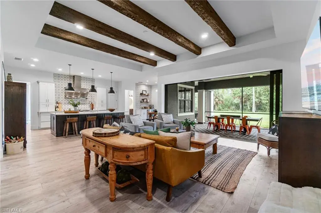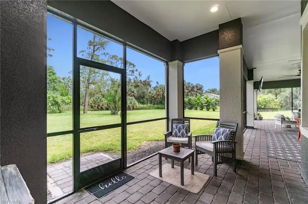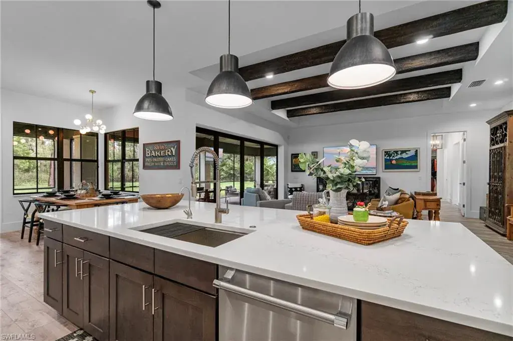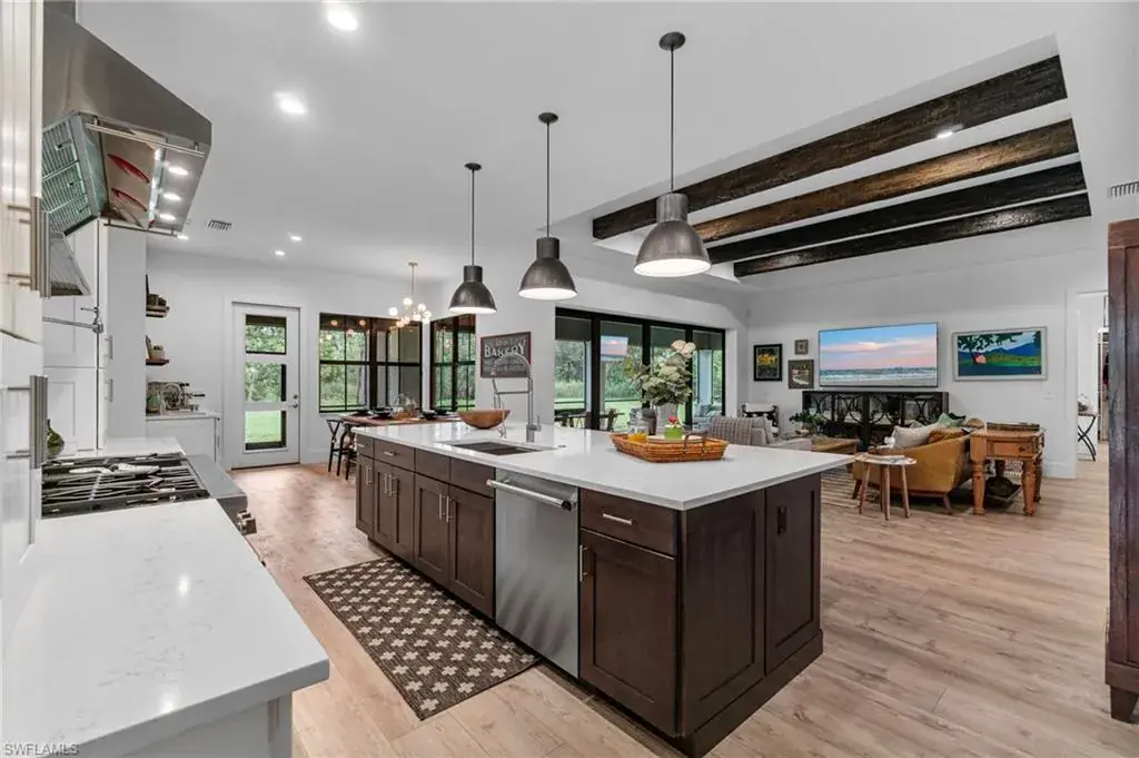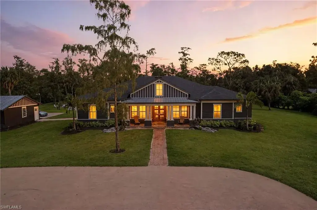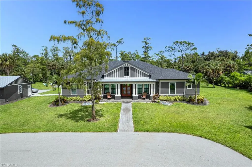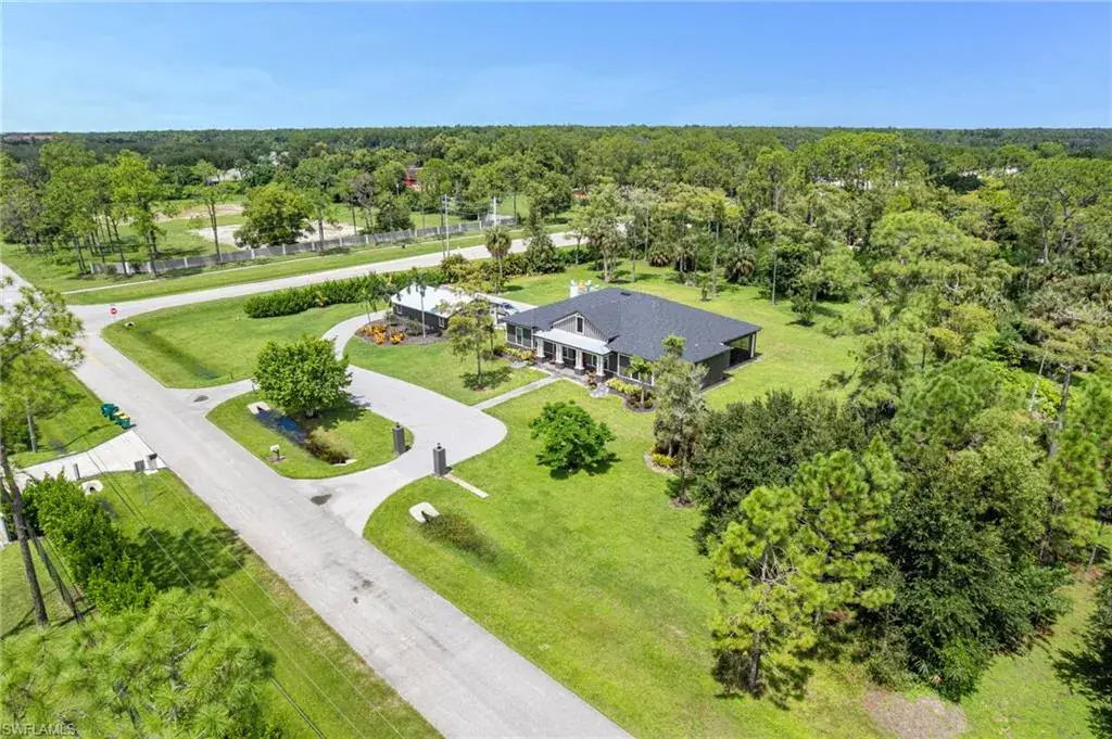 Experience the best of in-town acreage living with this stunning 2022-built estate home nestled on 2.73 acres of serene privacy in Logan Woods. Designed with timeless French countryside charm, this 5-bedroom + den residence showcases warm wooden beams in the great room, a split-bedroom floor plan, and an open-concept layout that blends elegance with everyday comfort. The chef’s kitchen is a true showstopper, anchored by a Thermador 48” range with six gas burners, flattop, and double ovens—along with a hidden, dual-access butler’s pantry that keeps everything organized and out of sight. From the kitchen and great room, walls of glass open to a sprawling screened lanai, where you’ll sip morning coffee while soaking in tranquil views of lush greenery. The primary suite is thoughtfully tucked away for peace and privacy, while additional bedrooms are positioned on the opposite side of the home, each with custom closet built-ins and ceiling fans. Every detail has been considered, including hurricane-impact windows and doors, whole-home reverse osmosis water system, tankless water heater, and upgraded 400-amp electrical with generator hookup. Outside, the possibilities are endless. The 20’x40’ metal-roofed garage/warehouse includes a workshop and could easily be converted into a 4-car garage. A newly paved driveway offers generous guest parking—and even potential space for your very own pickleball court. With a pre-wired pool panel, propane hookup for an outdoor kitchen, and storm-tested durability, this home is ready for generations to come. Don’t miss your chance to own this rare Naples treasure where privacy, elegance, and functionality come together in perfect harmony.